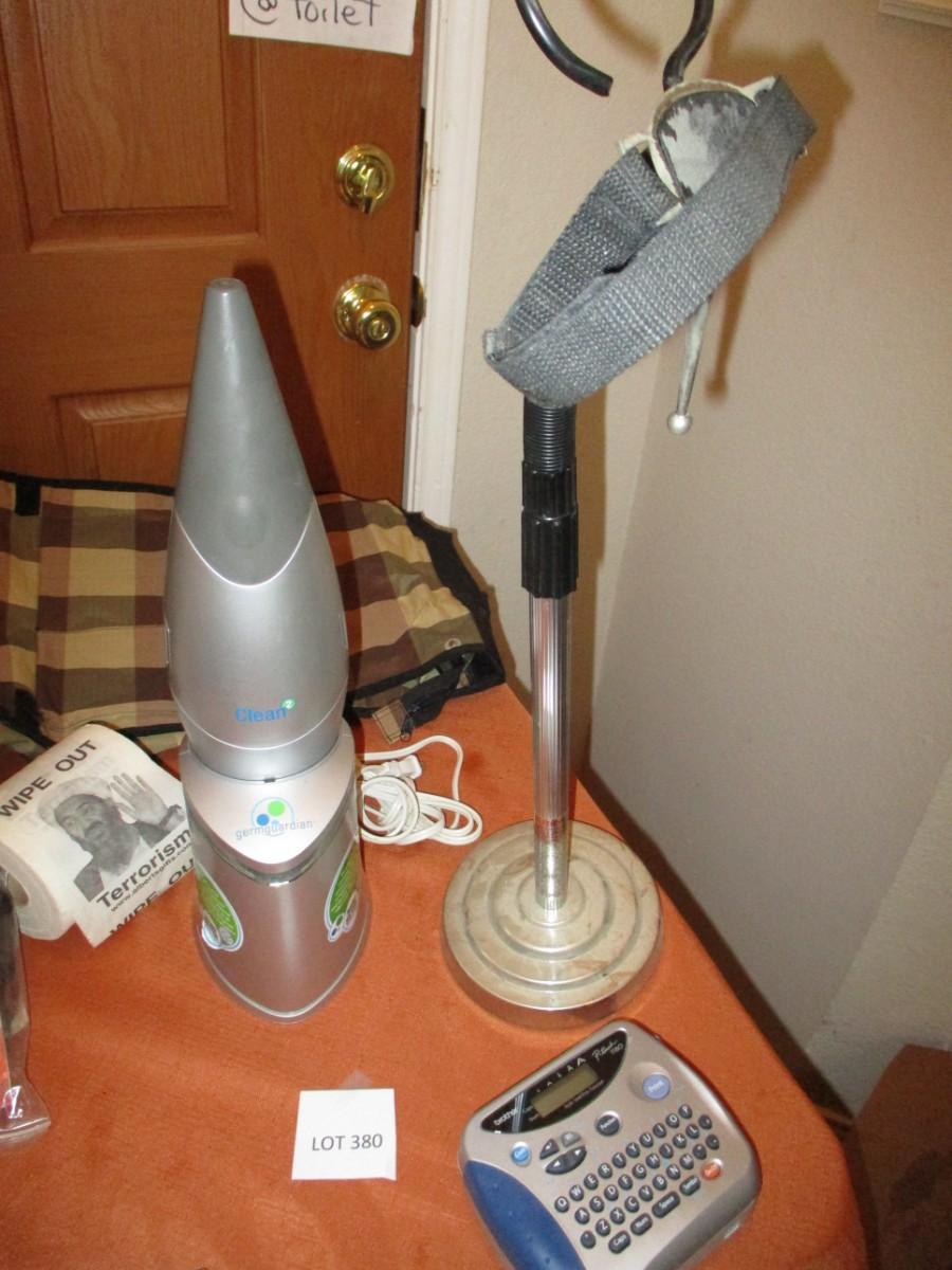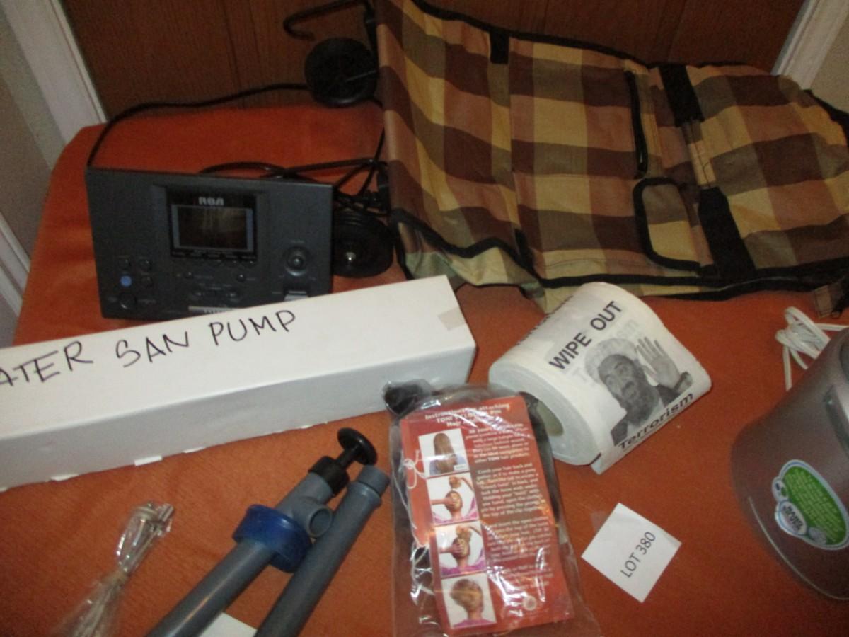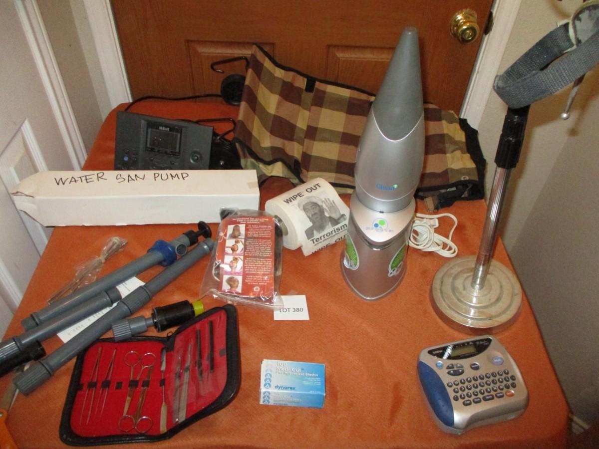 Scissors not included. UV-C Air Sanitizer (lights up), book Bag w/wheels, RCA clock radio works. Grooming kit, Hair Dryer Stand, Label machine (not sure it works)