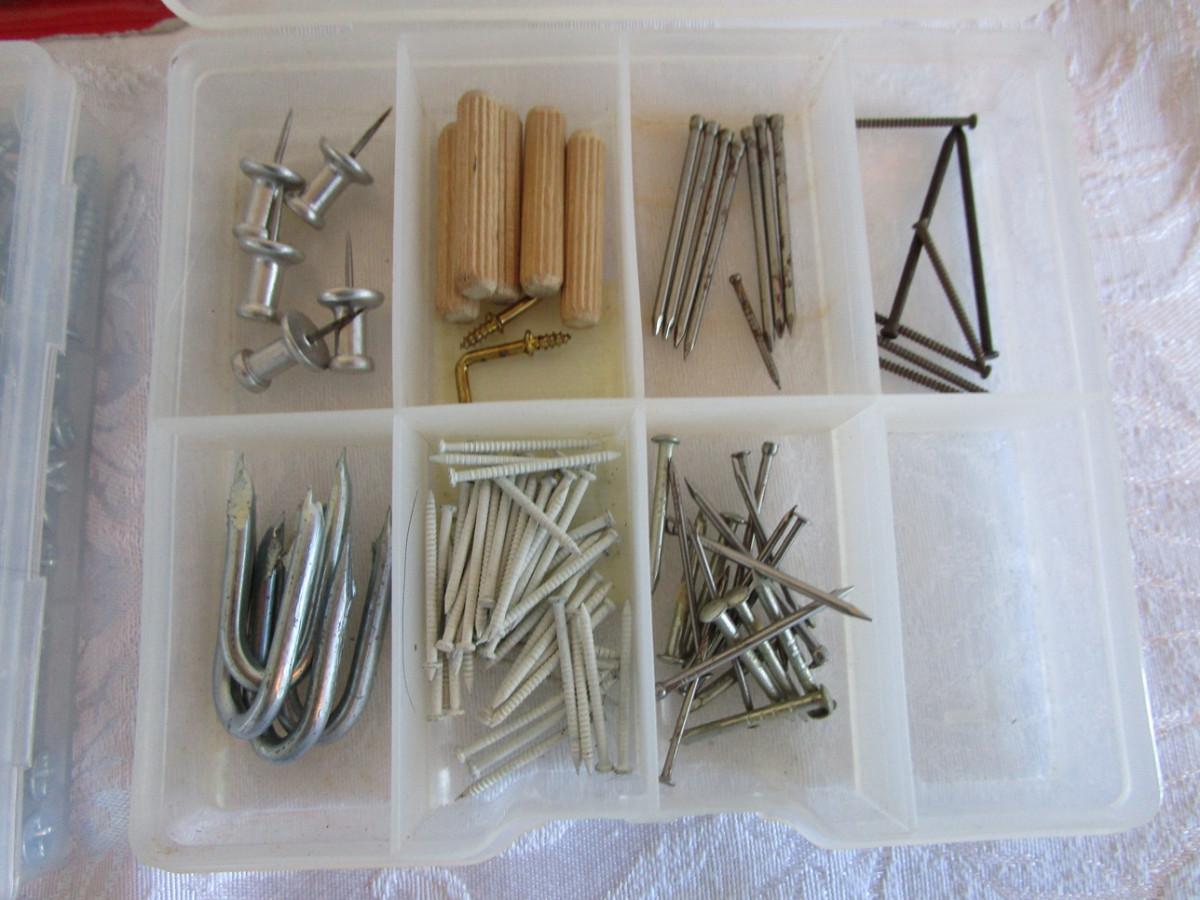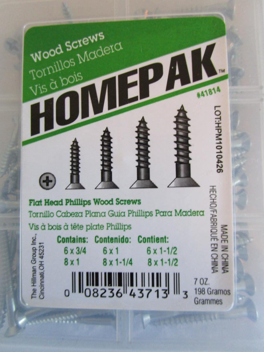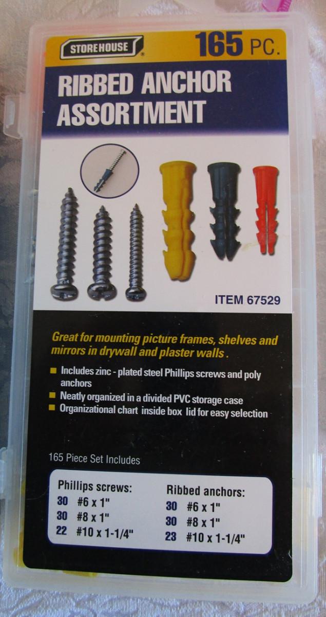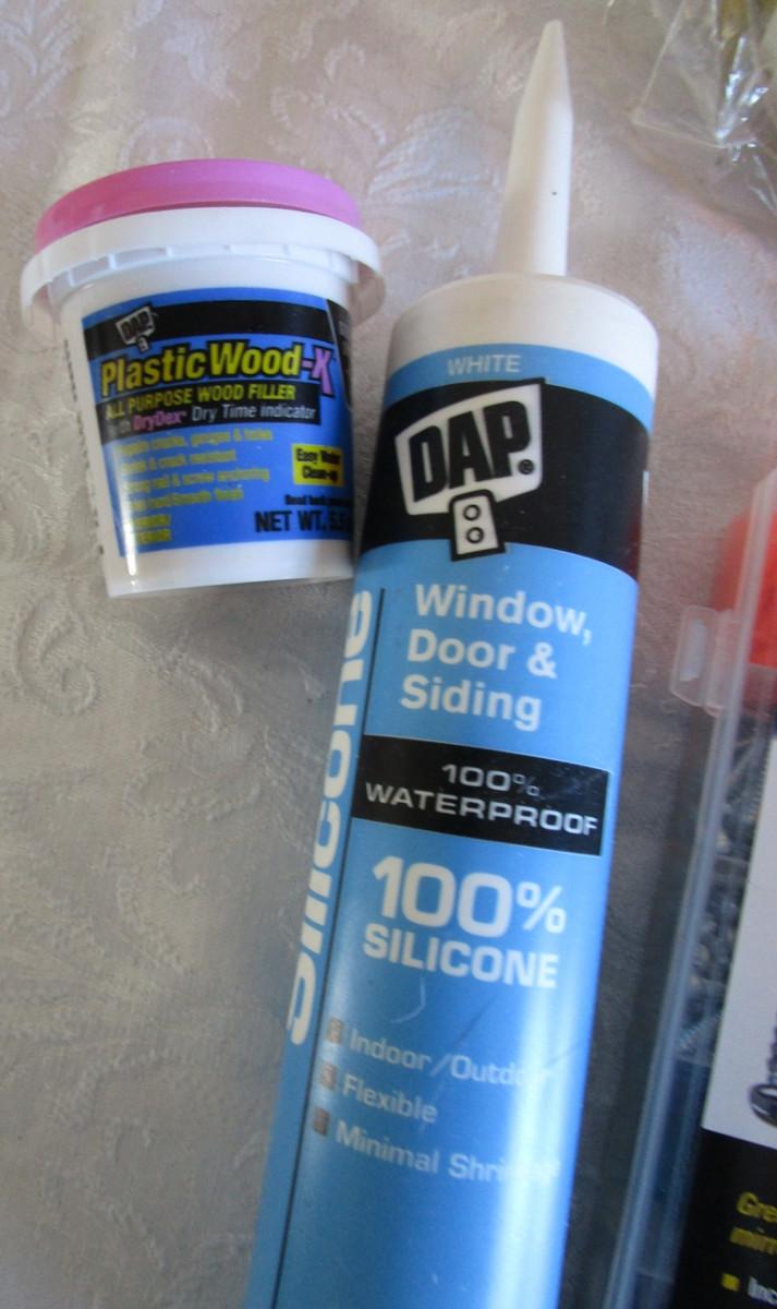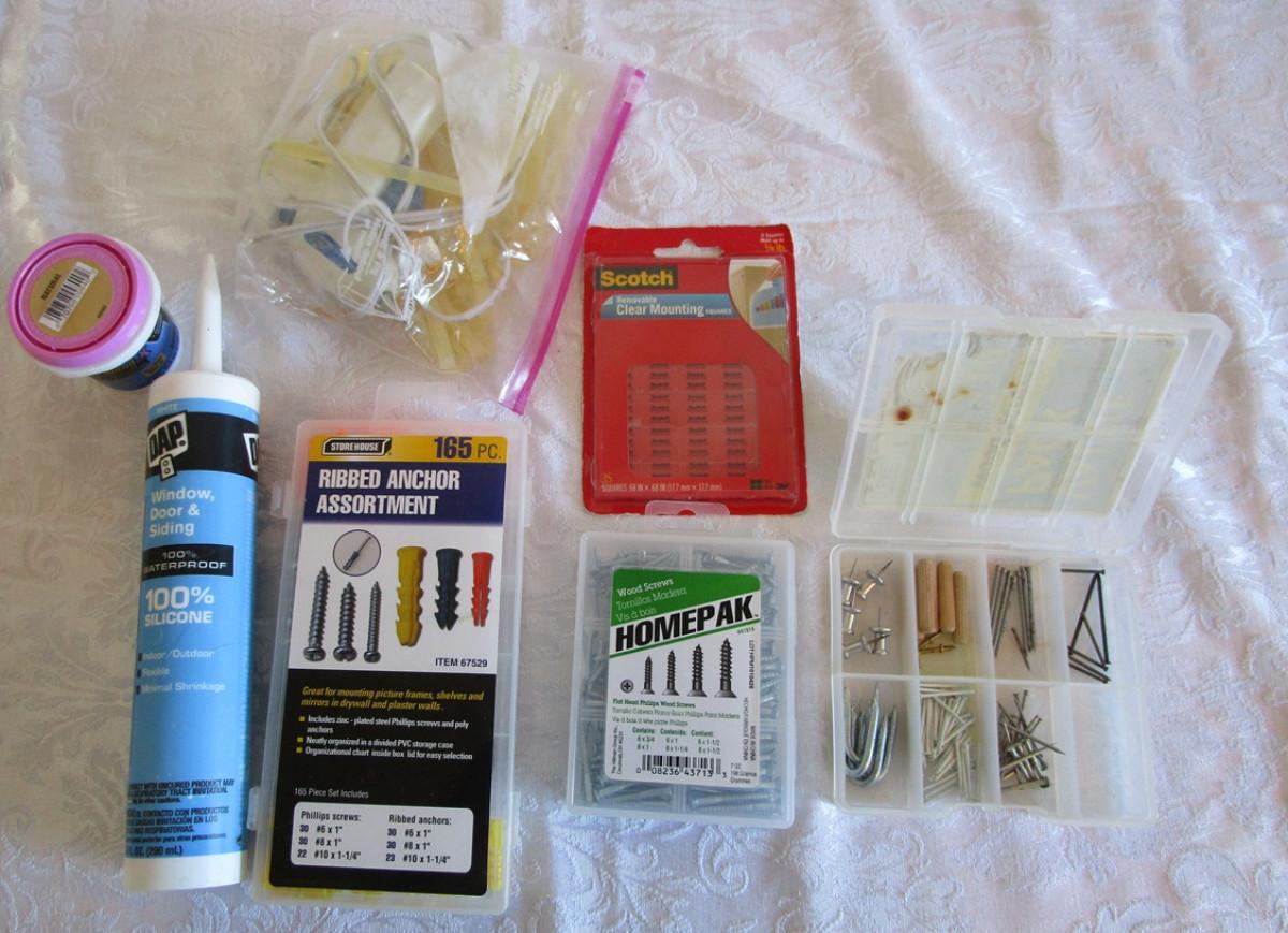 1 box wood screws various sizes, 1 box assorted anchors, 1 hot glue gun with glue sticks, 1 pkg of clear Scotch mounting tabs, 1 jar of wood filler, 1 tube silicone for window & door siding, 1 box with assorted hardware