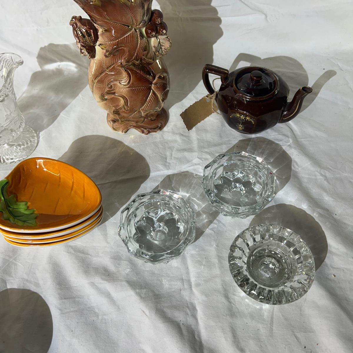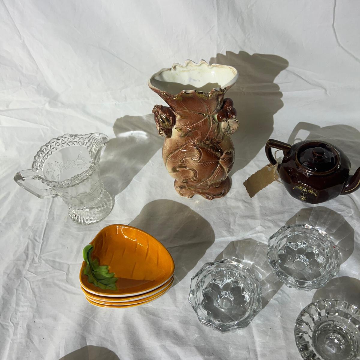 Miscellaneous Household/ Kitchen goods, Candle stick holders, vase, 4 carrot trays, spring ramiakin, glass cream pourer, and small tea kettle