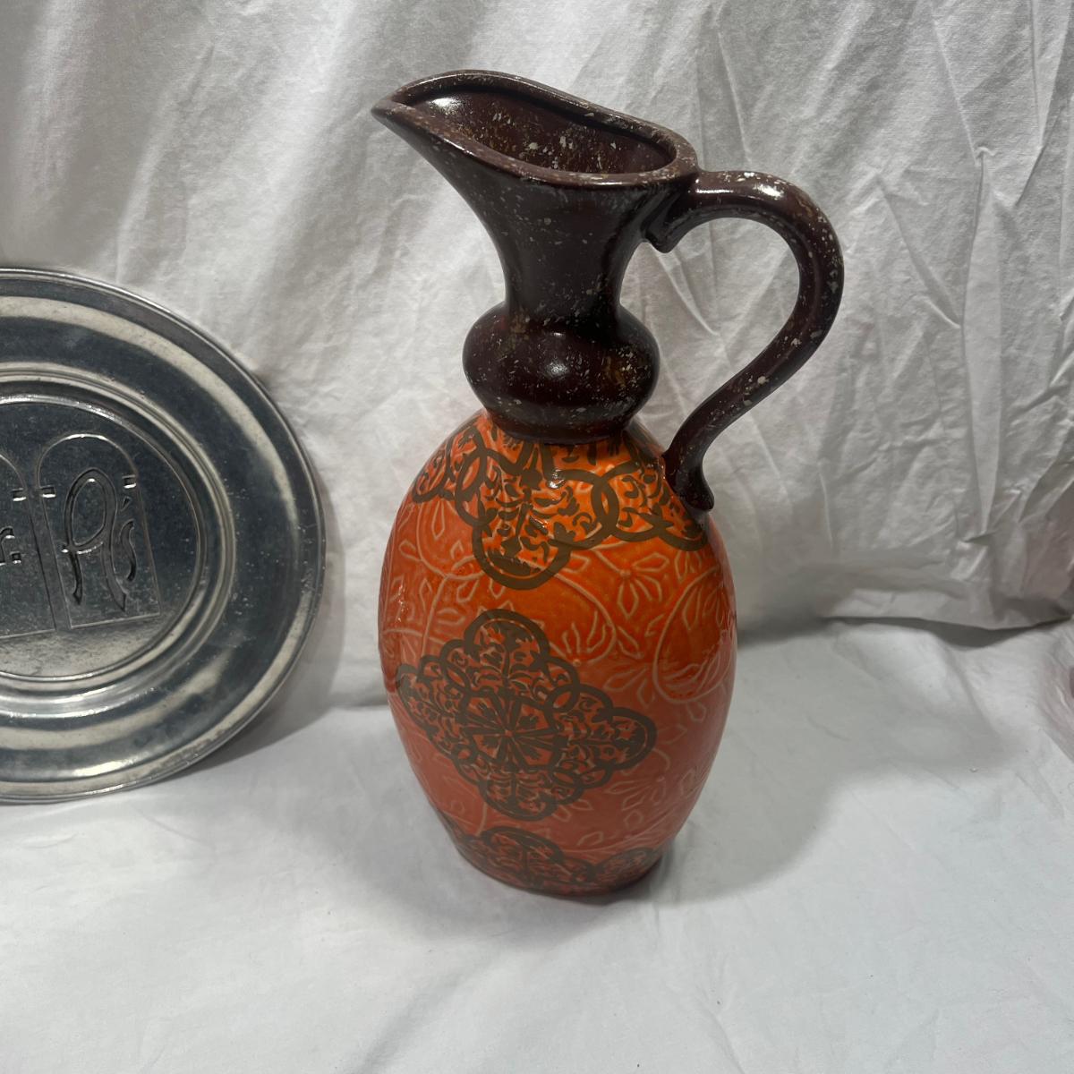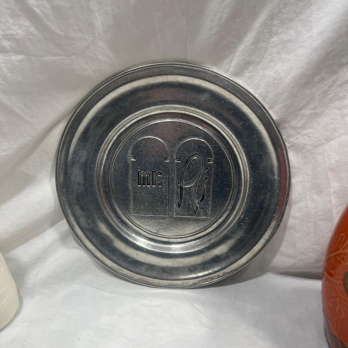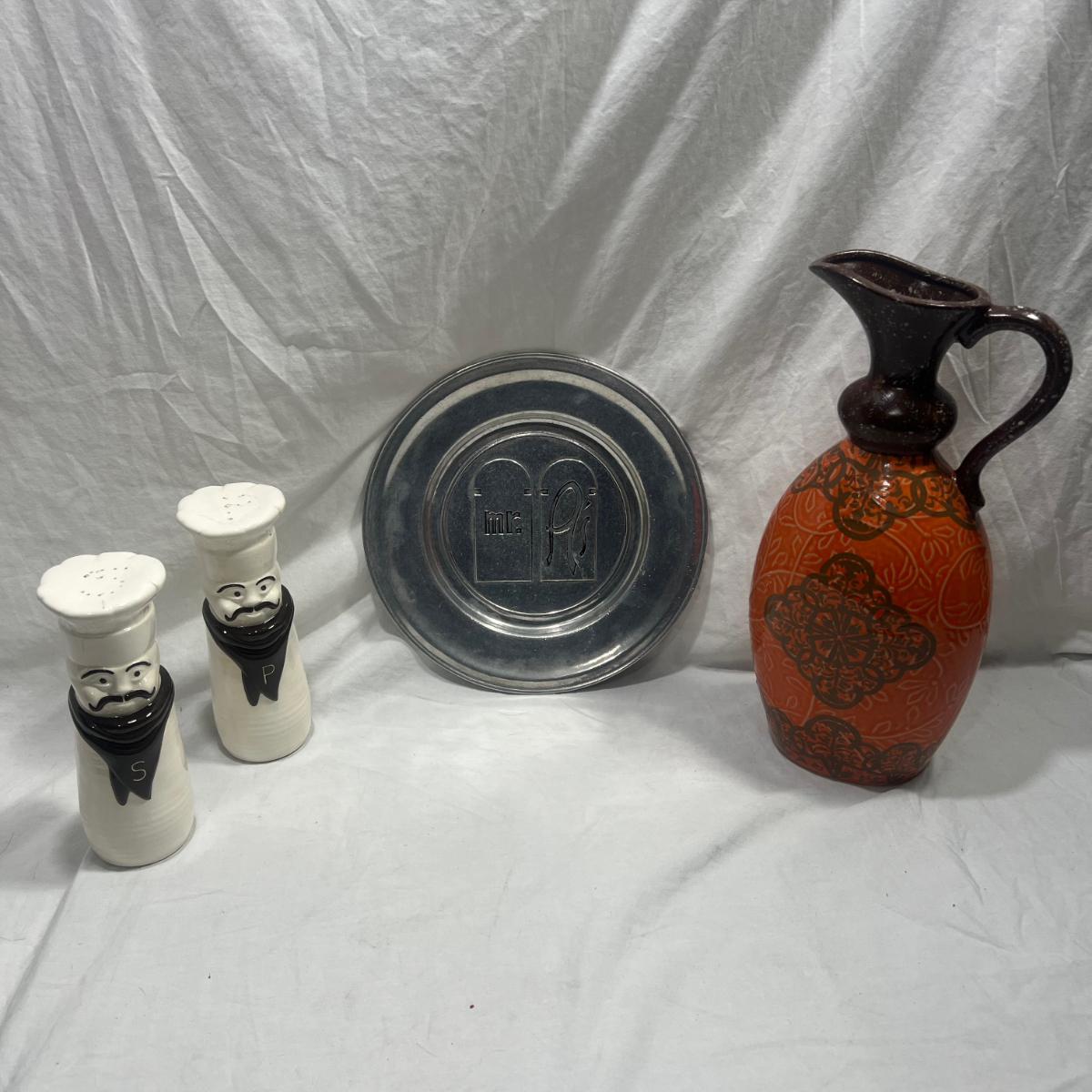 Orange and brown vase, salt and pepper shakers, and a Vintage Pewter plate