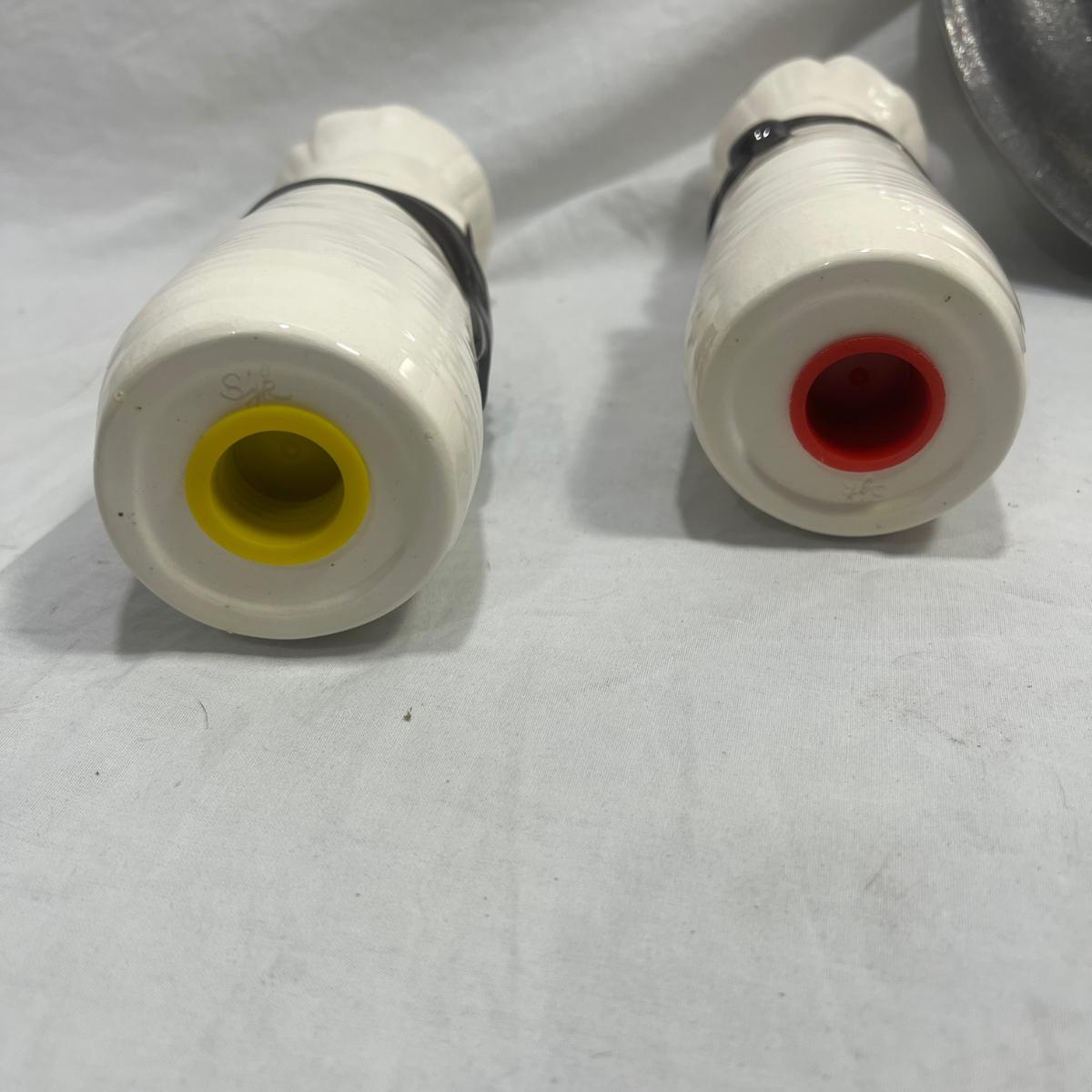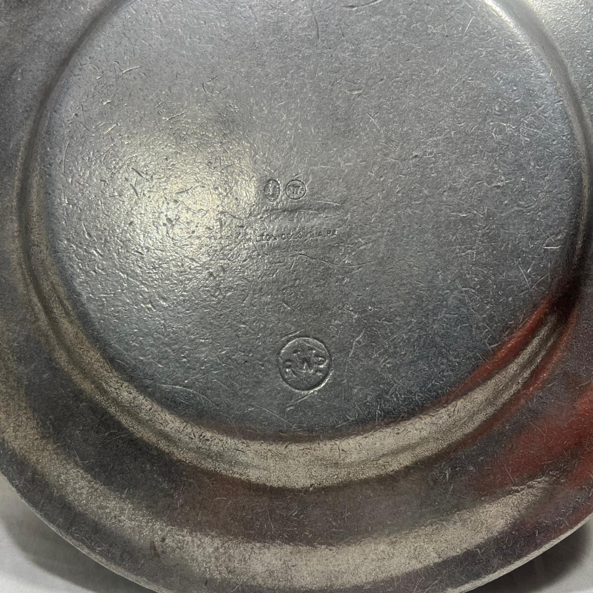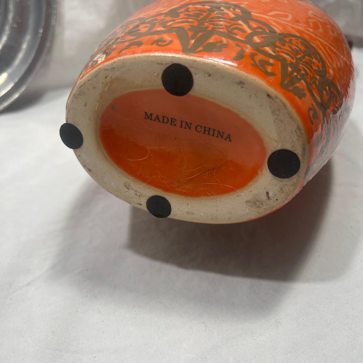 Orange and brown vase, salt and pepper shakers, and a Vintage Pewter plate