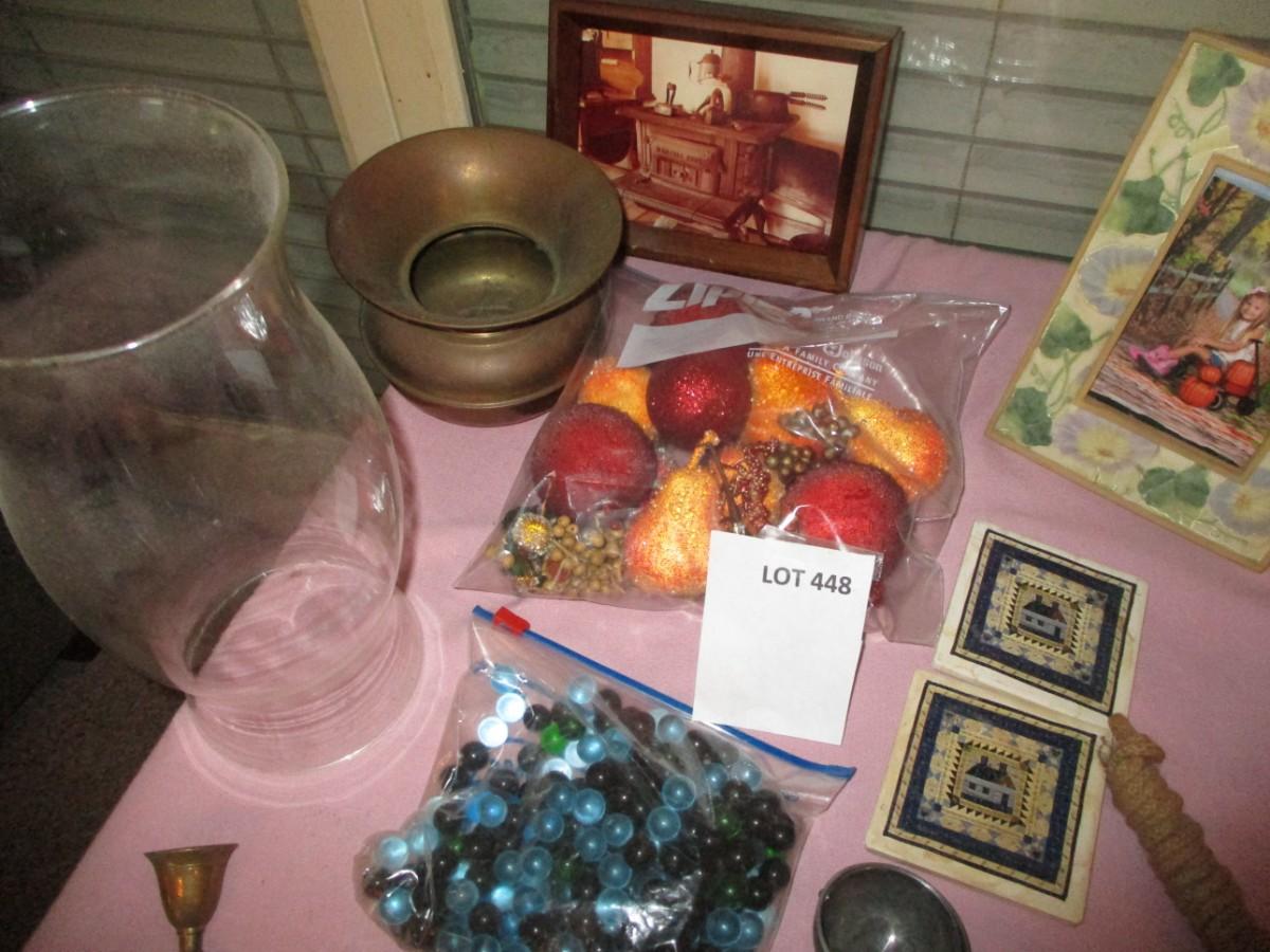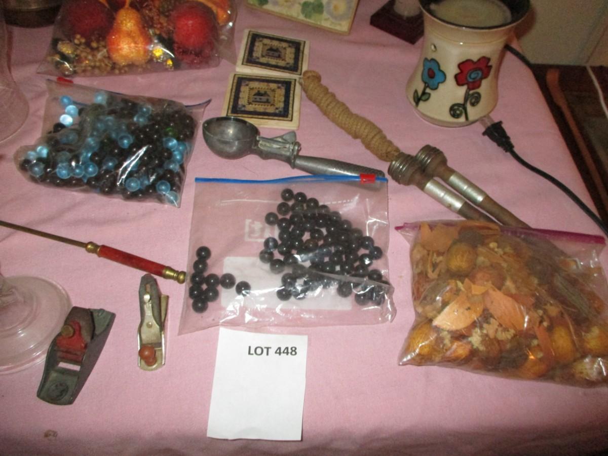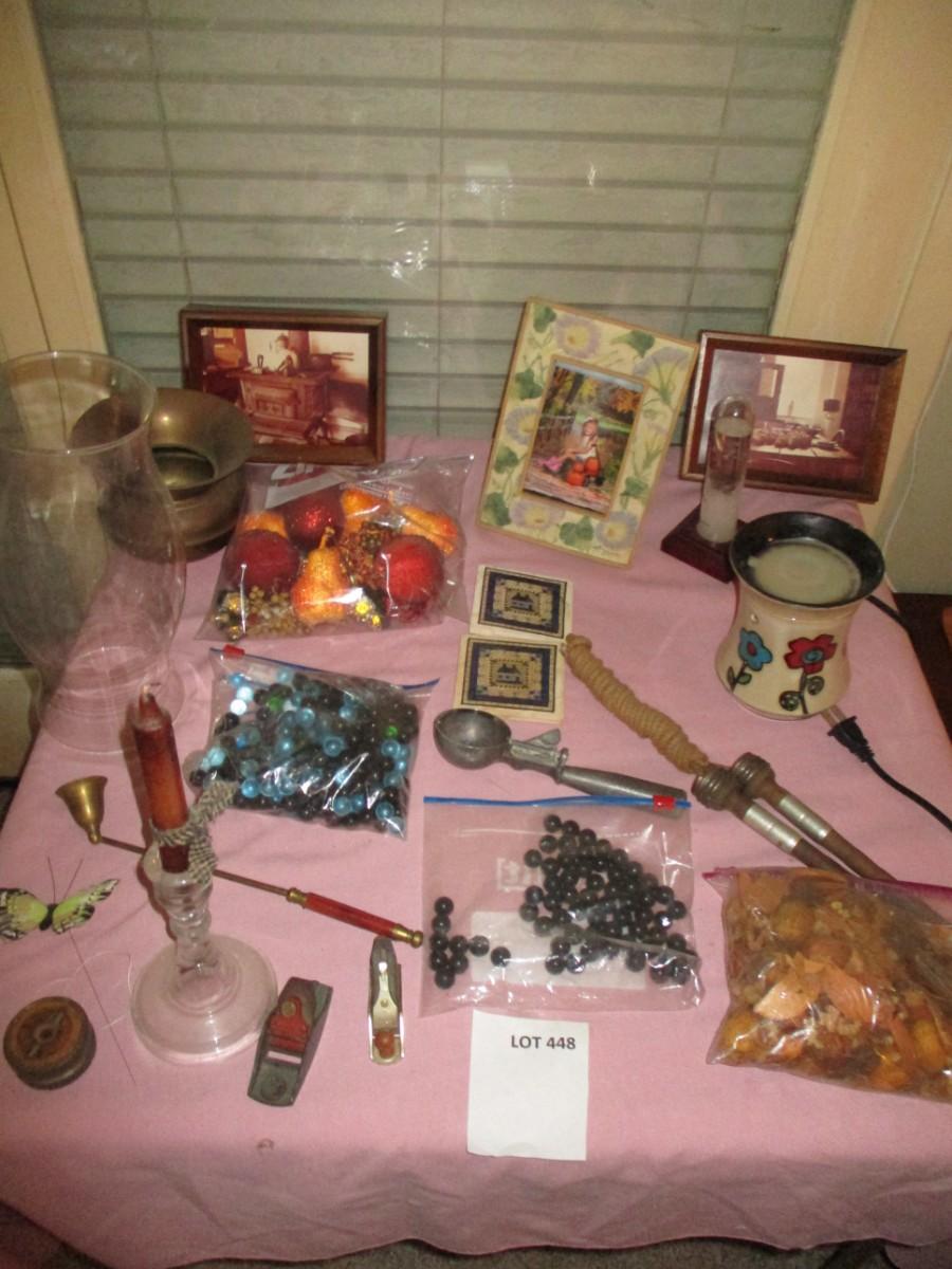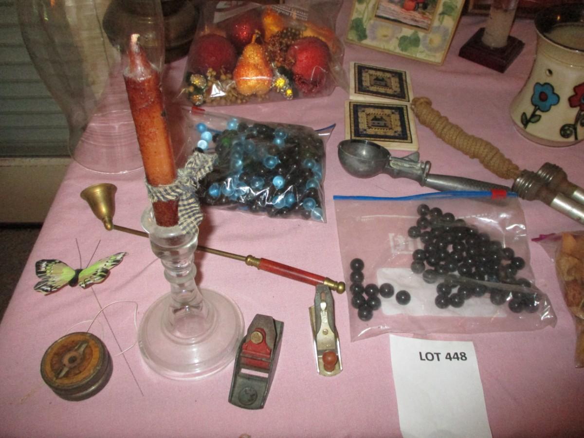 Vintage yoyo, Ice cream scooper, candle holder, Brass vase, small framed art, box plane, other