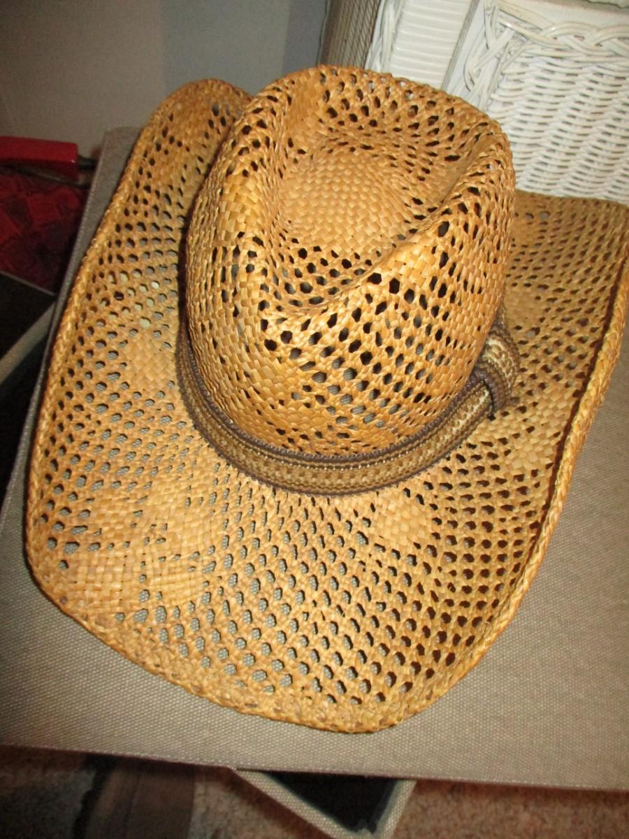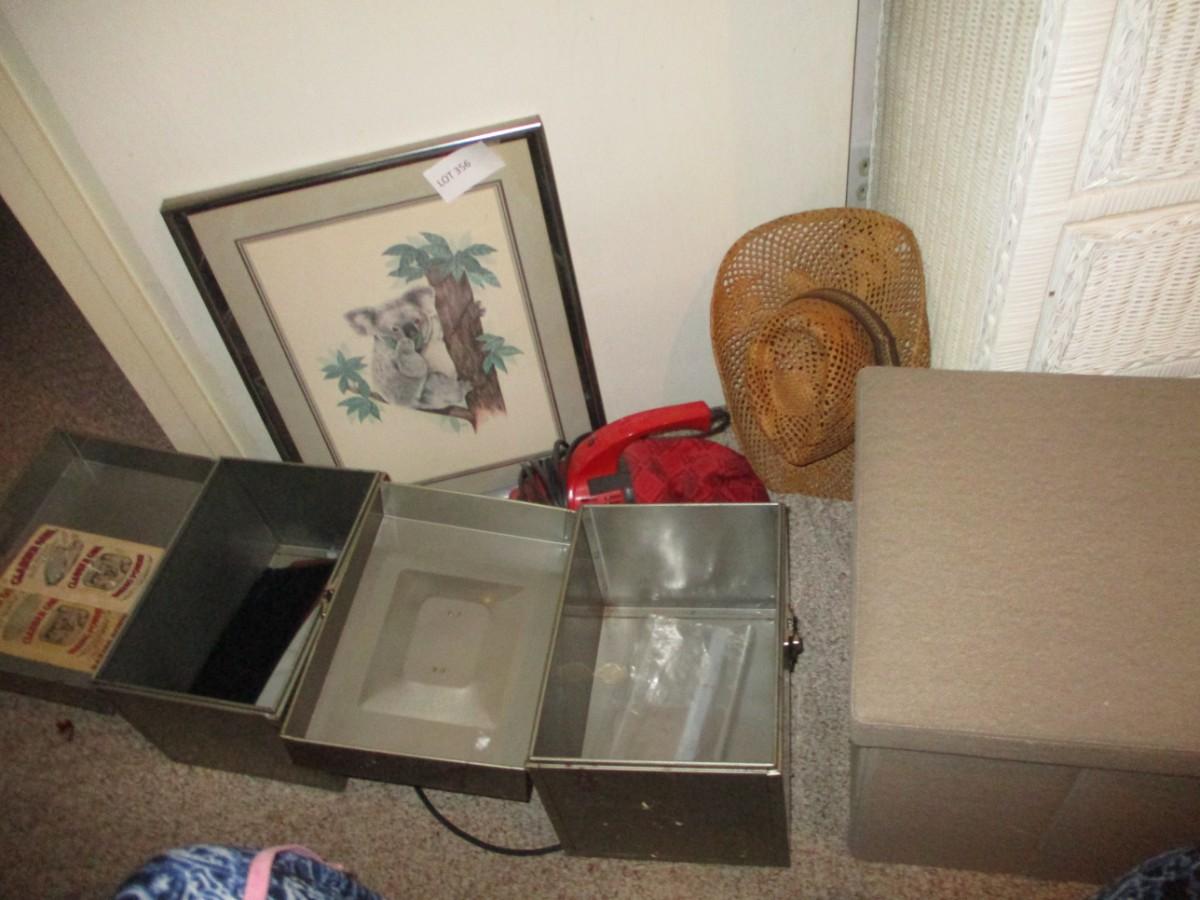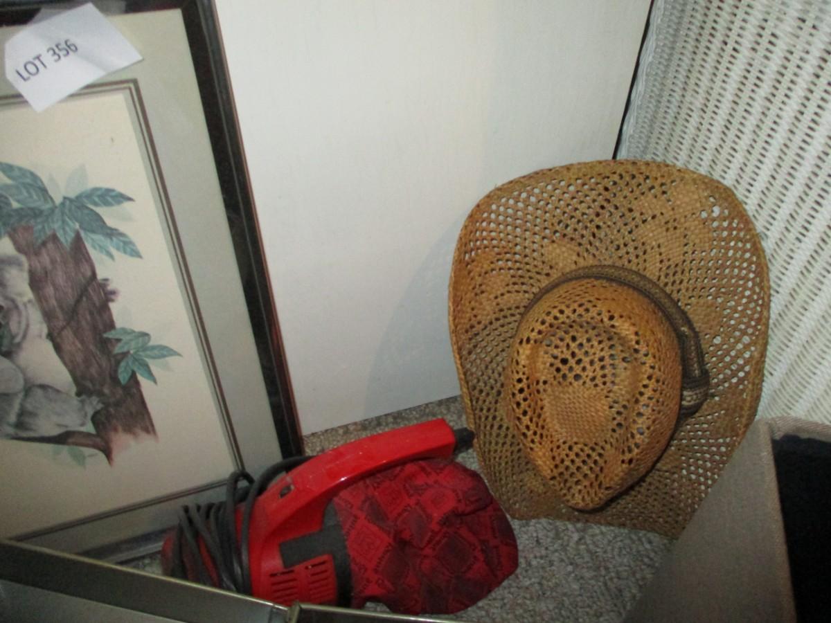 Straw ladie's hat, small padded storage box. 2 metal lock boxes, palm tree art, handheld dirt devil vacuum.