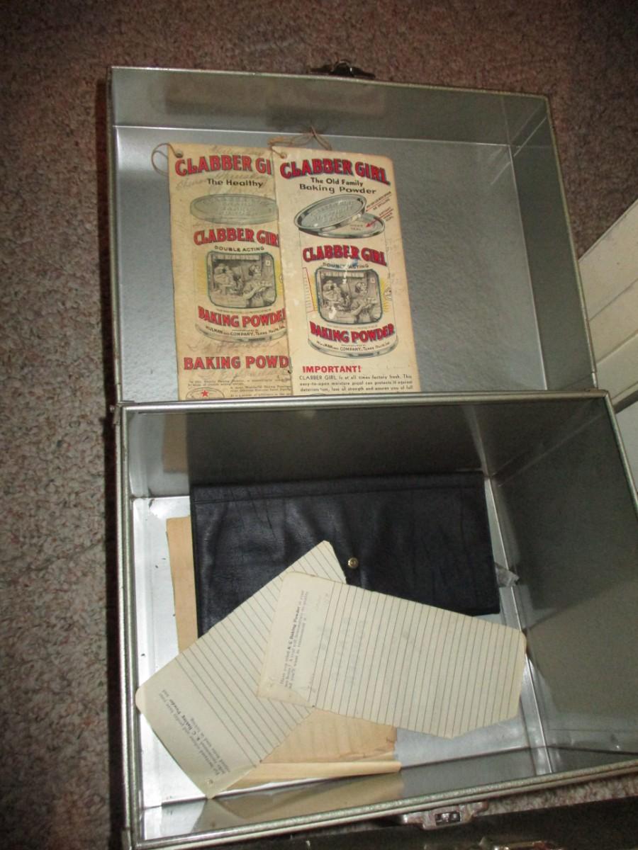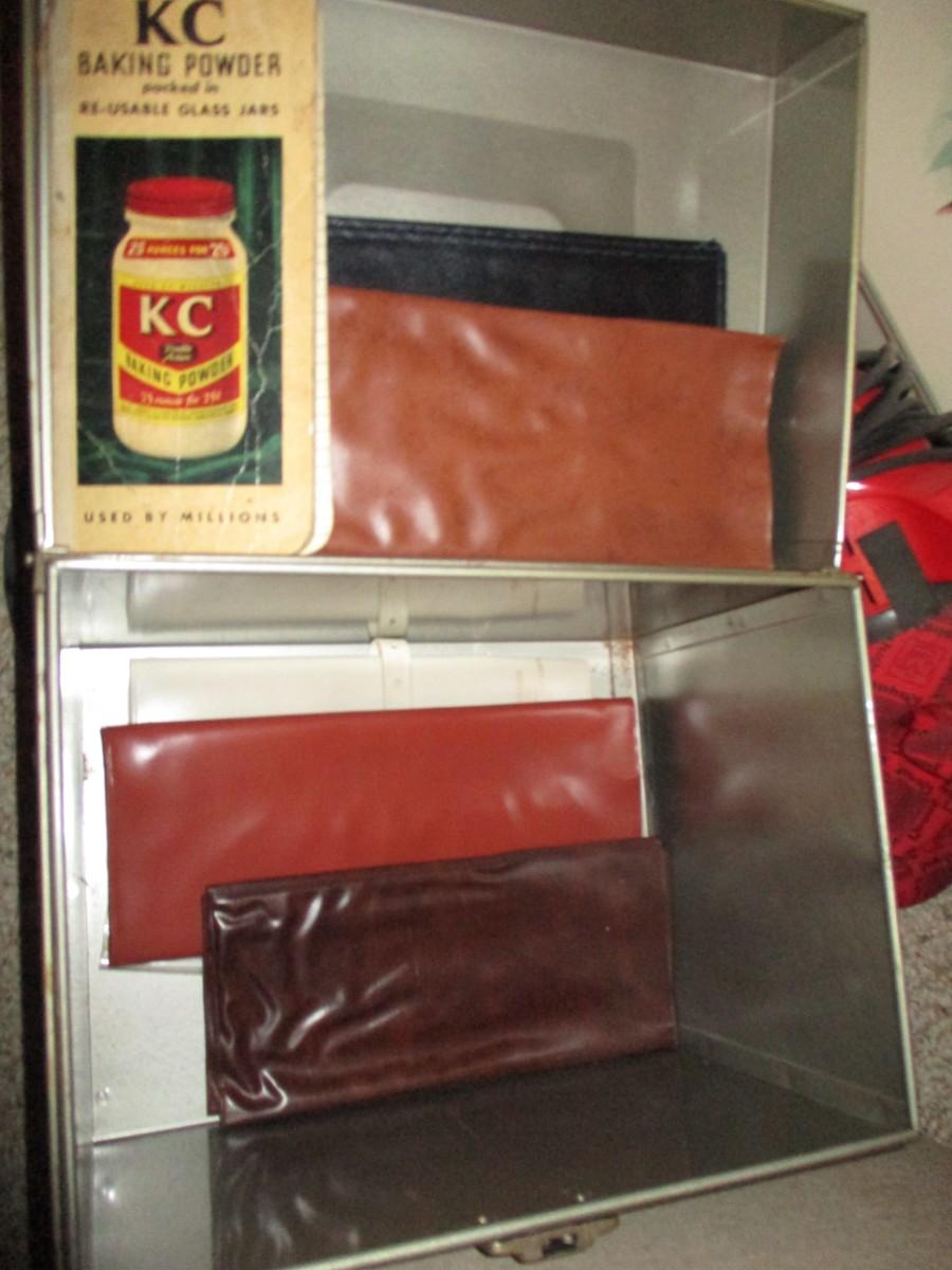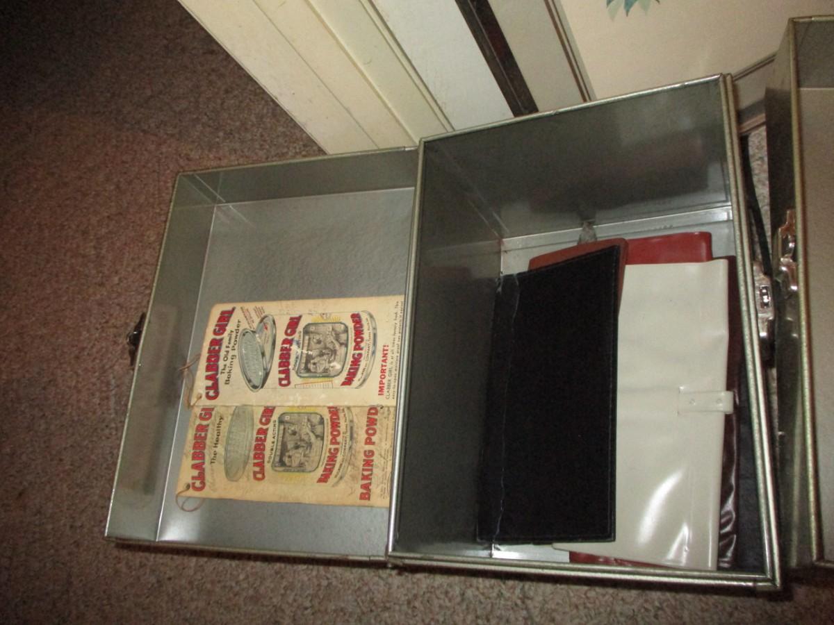 Straw ladie's hat, small padded storage box. 2 metal lock boxes, palm tree art, handheld dirt devil vacuum.
