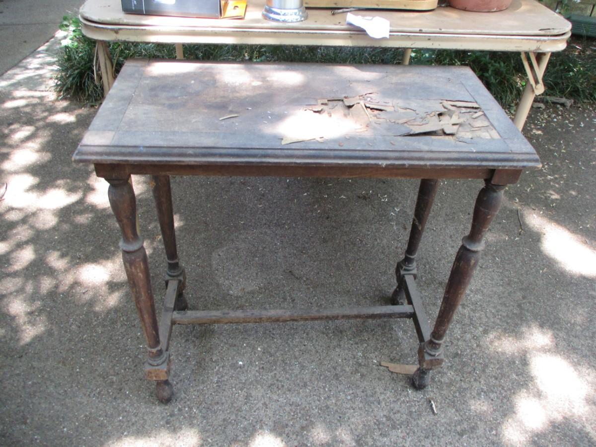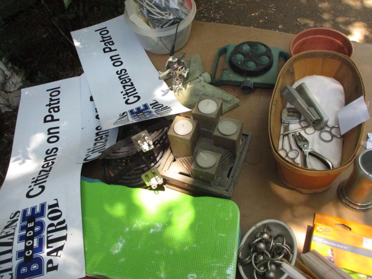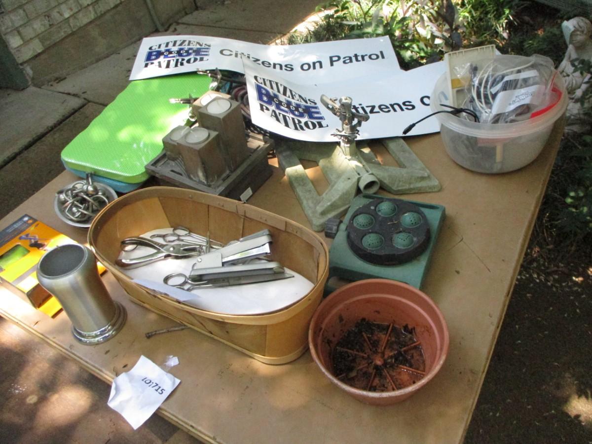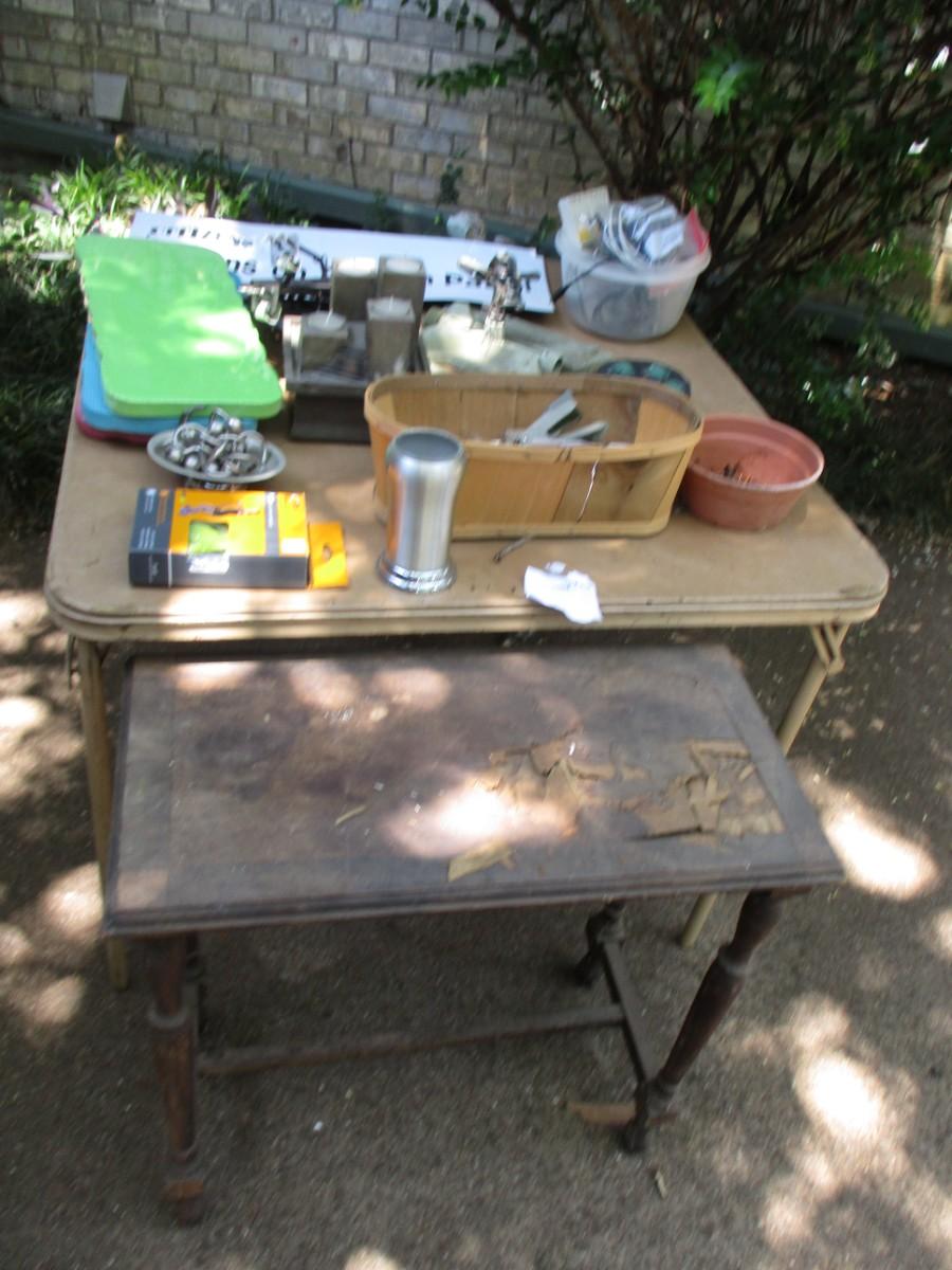 Scissors, Stapler, sprinkler, Candleholders, Very worn mahogany occasional table