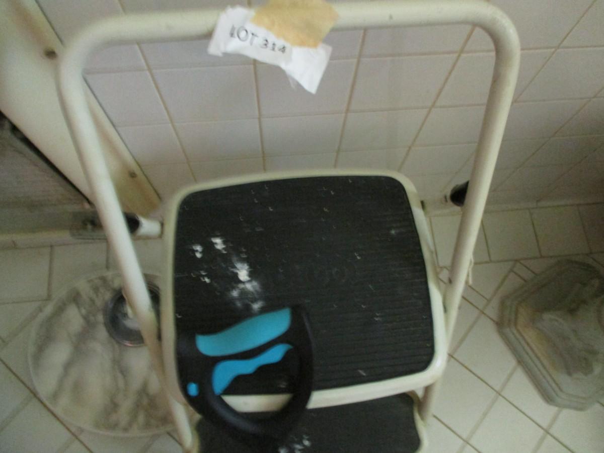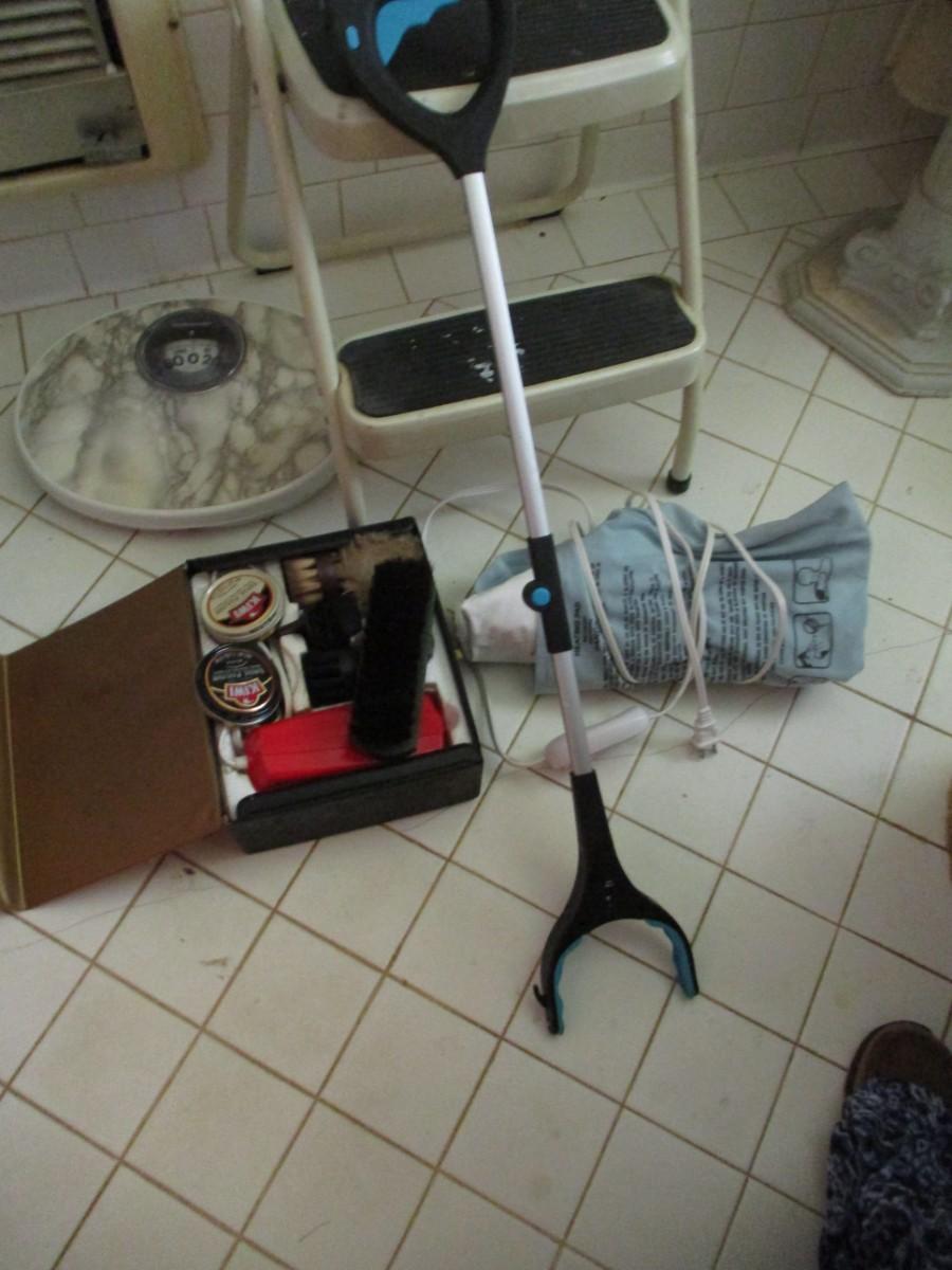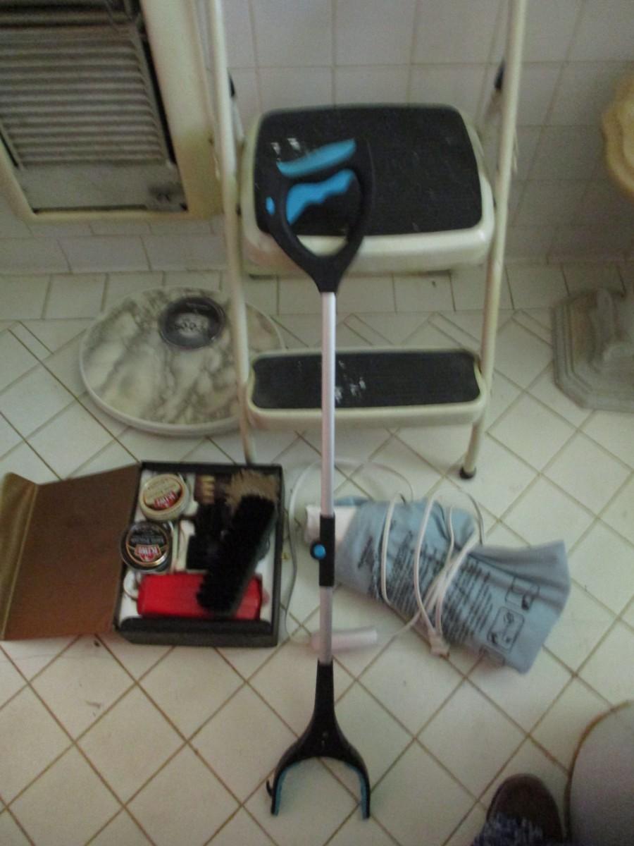 Heating Pad, Shoe shine box, Reach stick. scale. 2 step ladder
