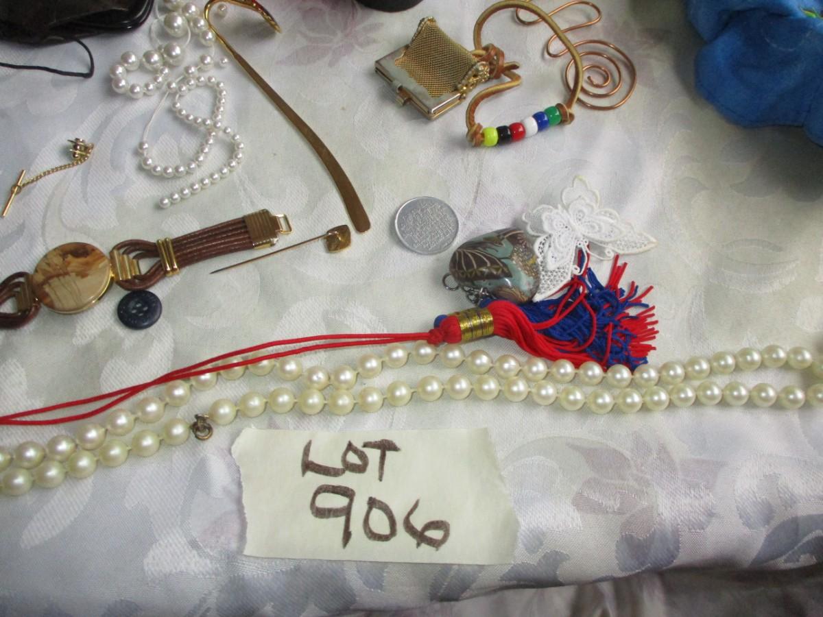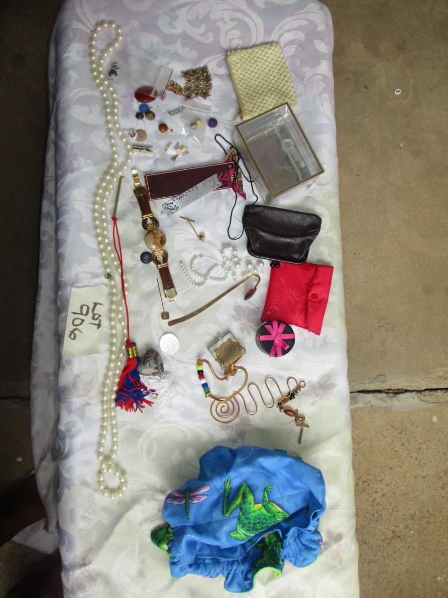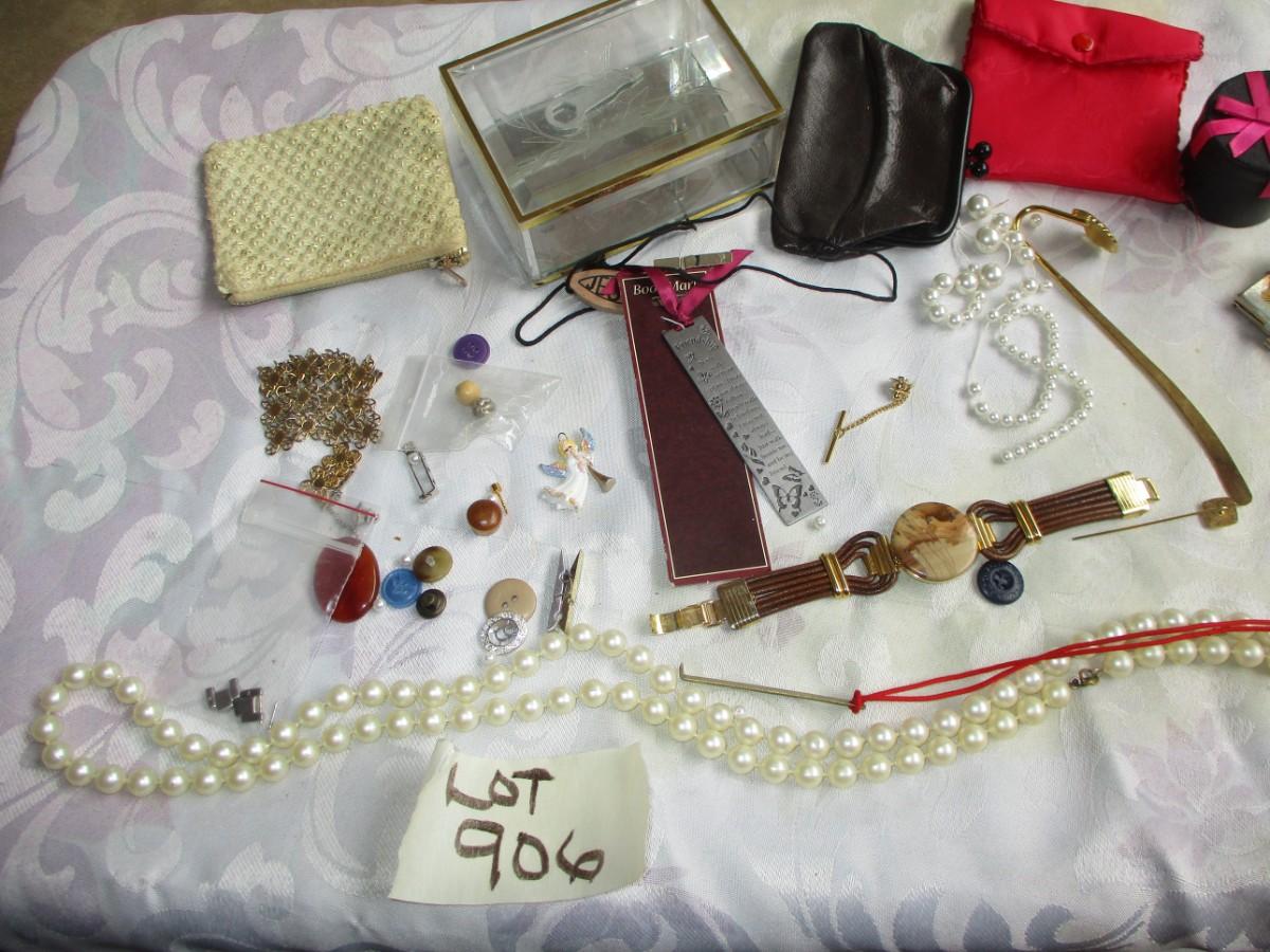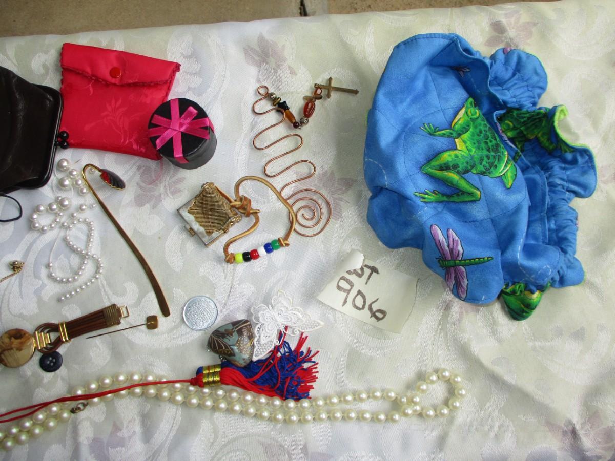 faux pearl necklace, coin purses, book markers, bracelet, frog bag