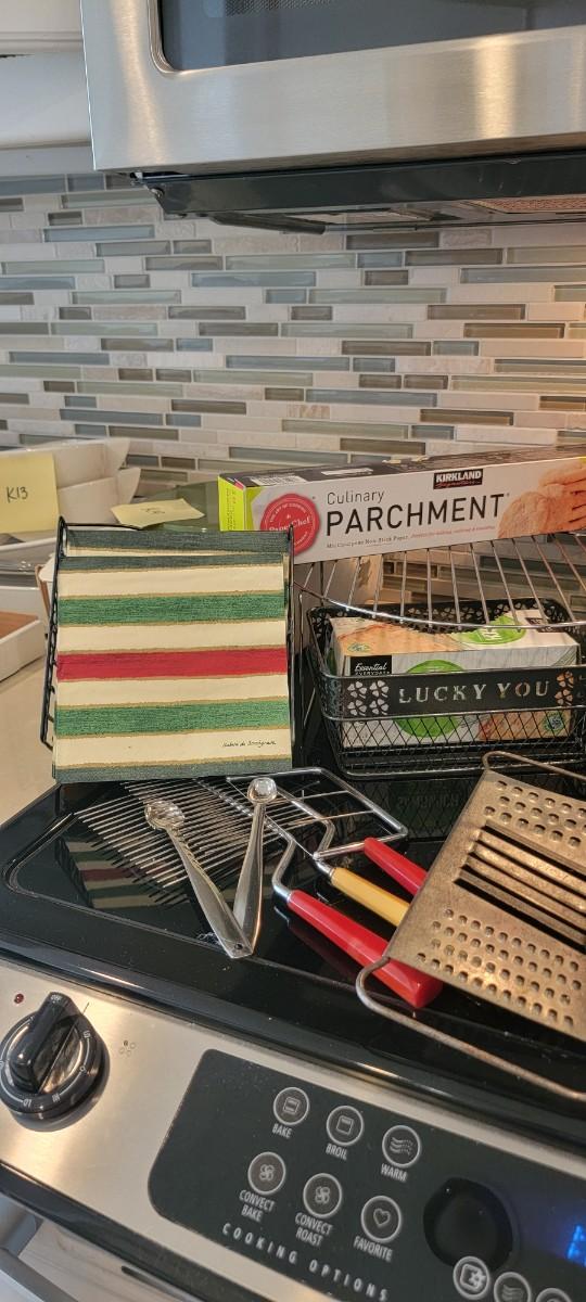 Miscellaneous kitchen items including storage container, cork coasters, napkins and holder, plus!