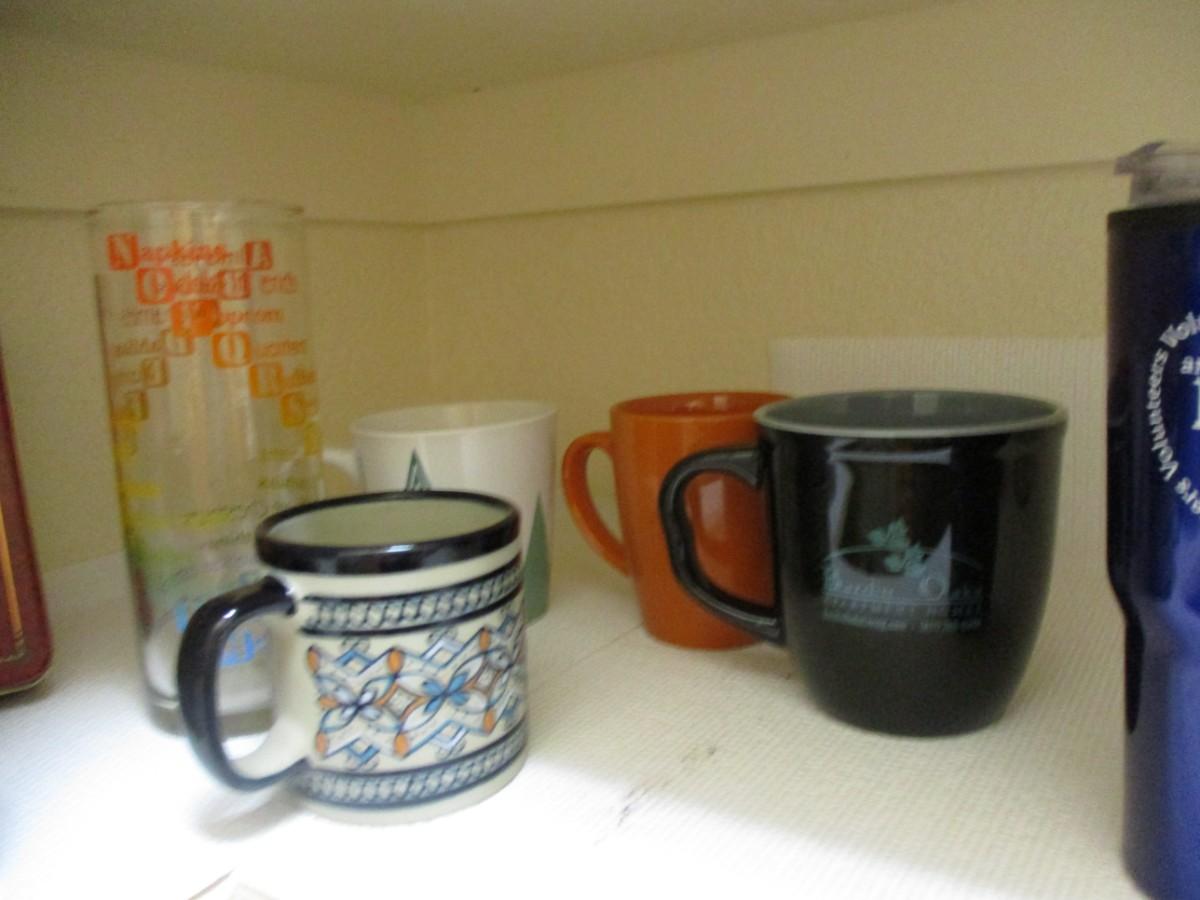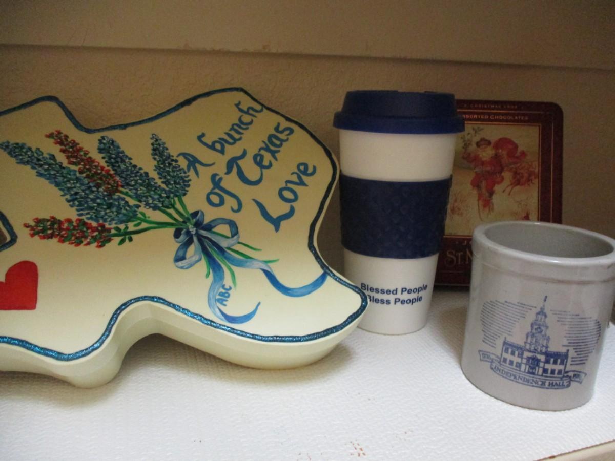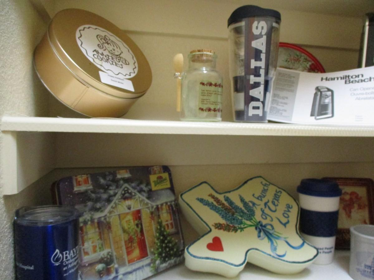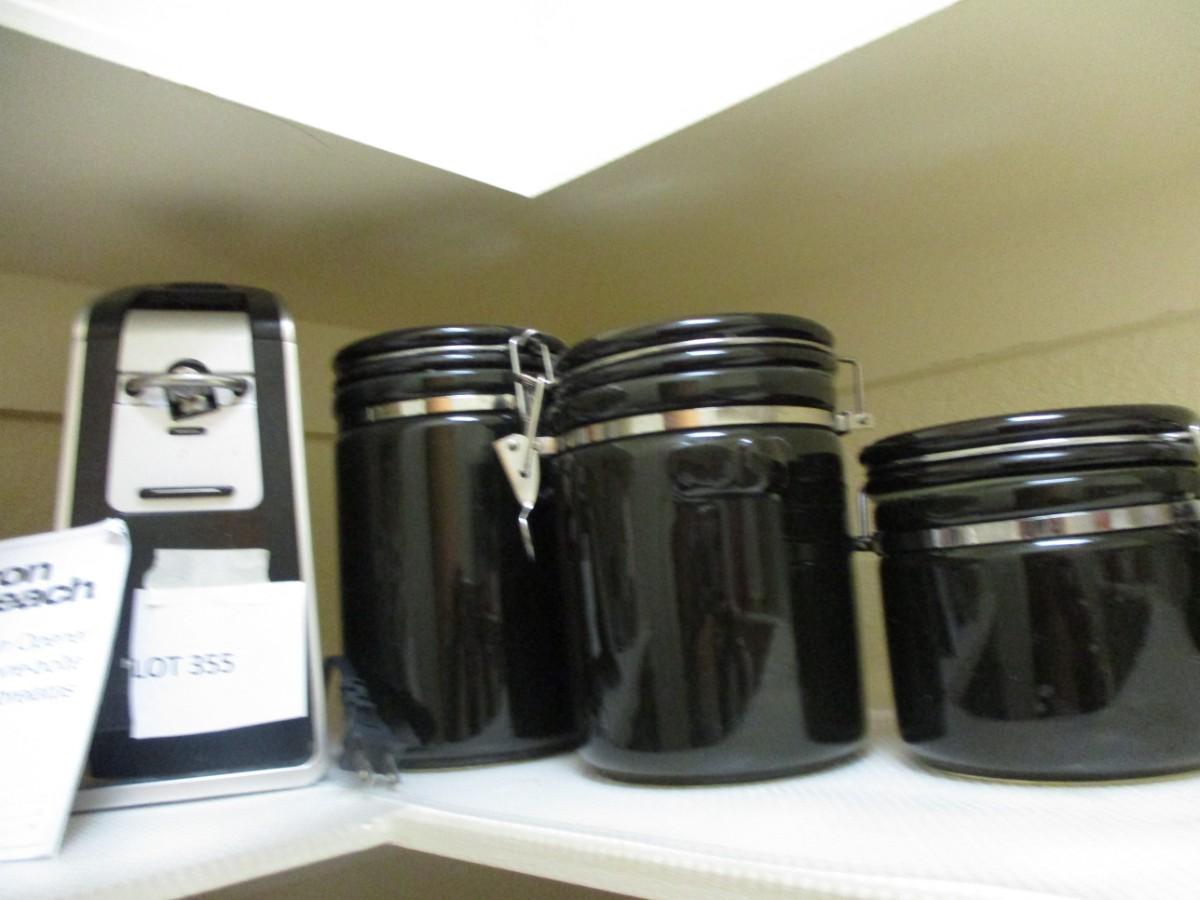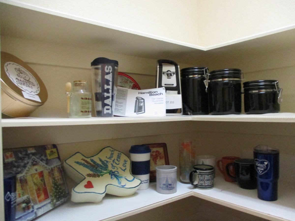 Black canisters, tin cans, can opener, cups, Dallas Cowboys tumbler
