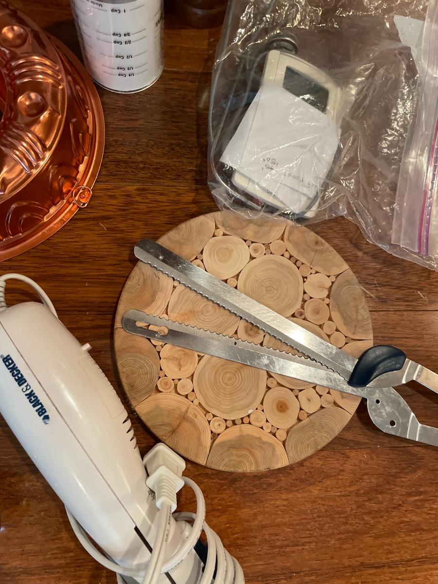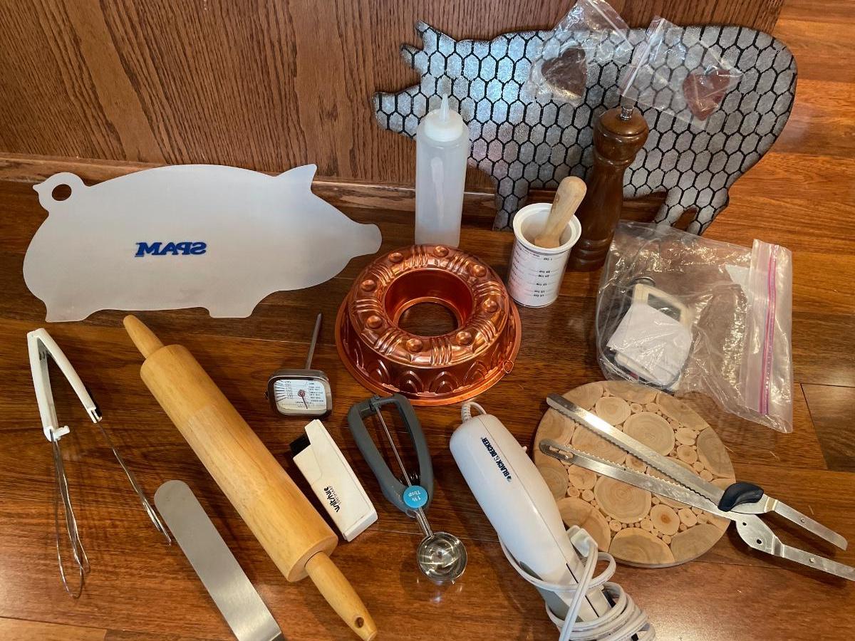 Includes rolling pin, thermometer, scoop, electric knife, and more