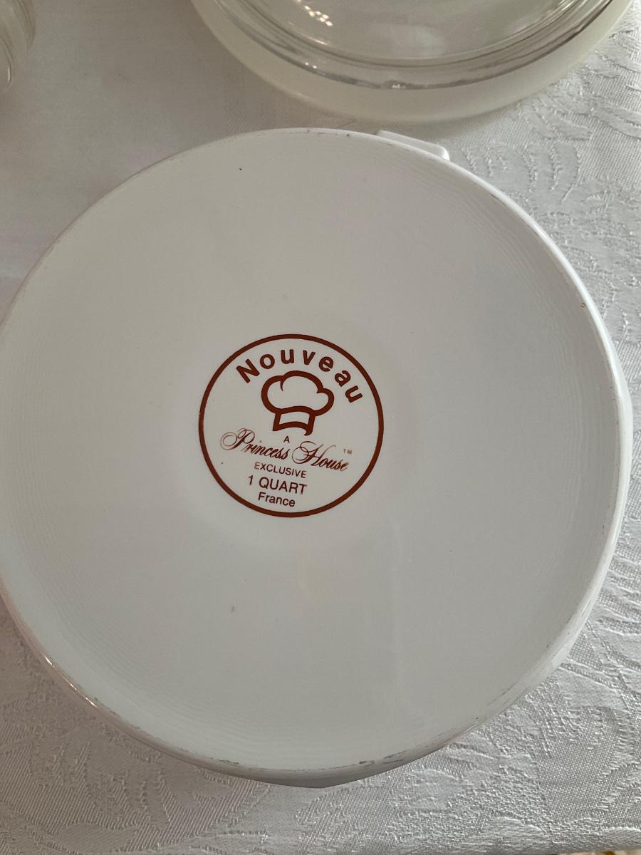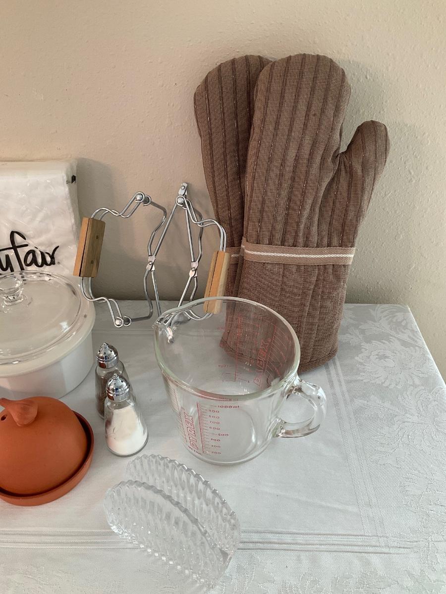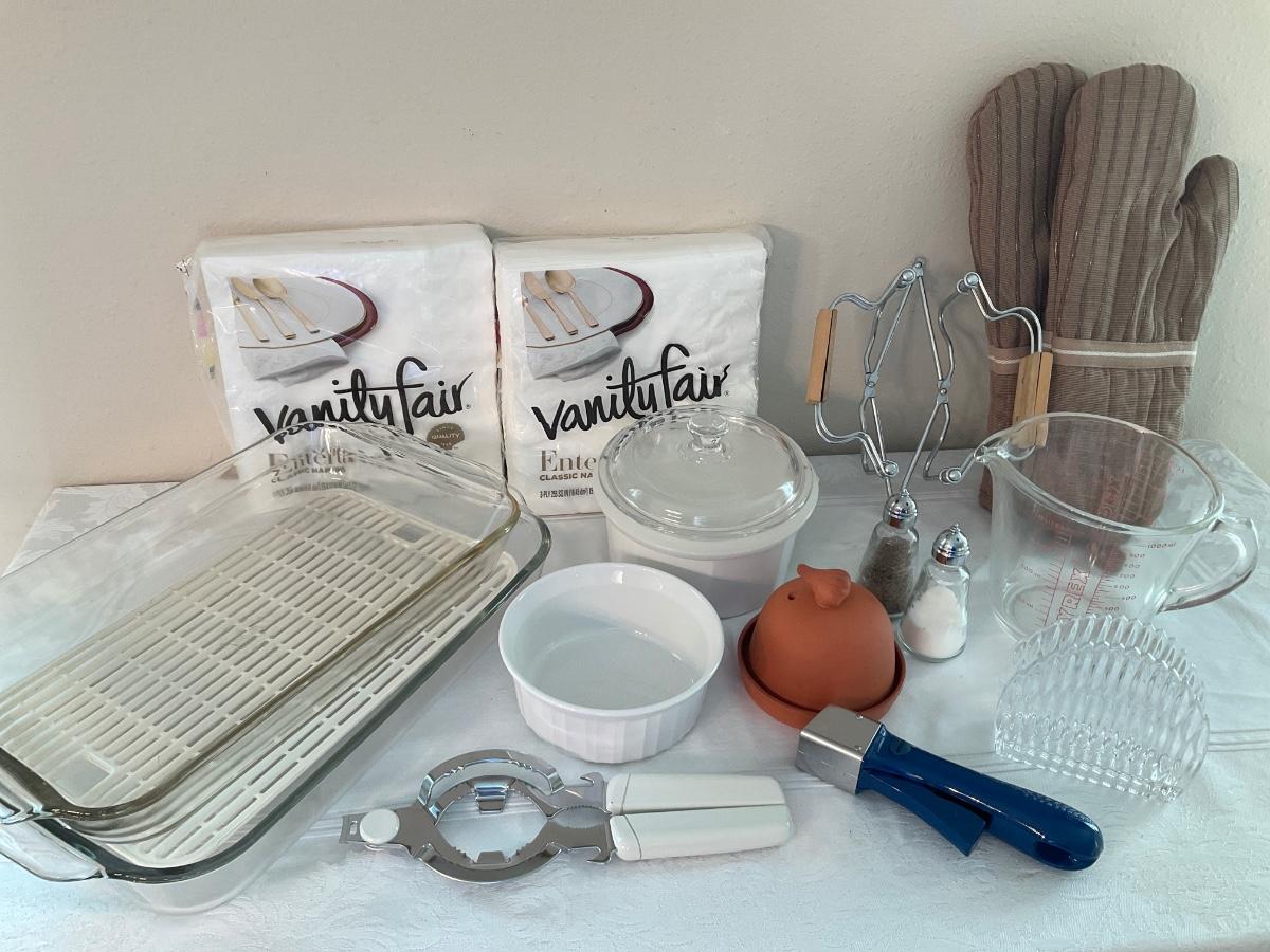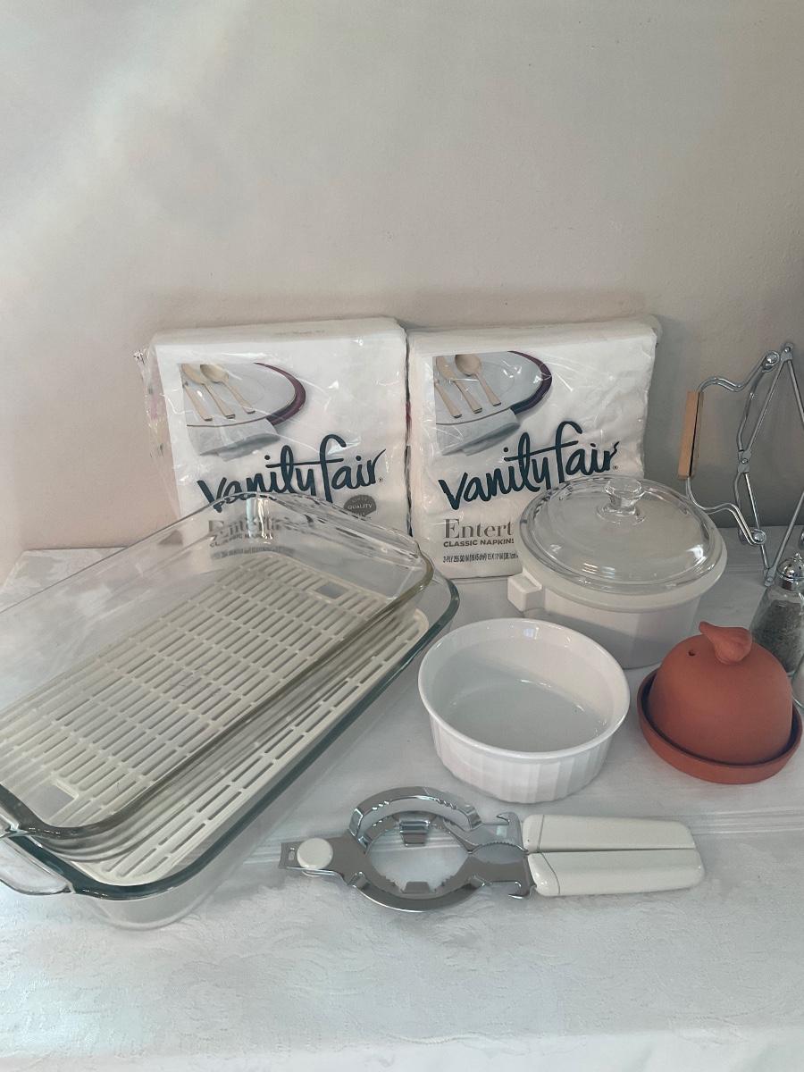 Includes oven mitts with grips, napkin holder, napkins, Princess House 1 quart, with handle, casserole pans, garlic cover