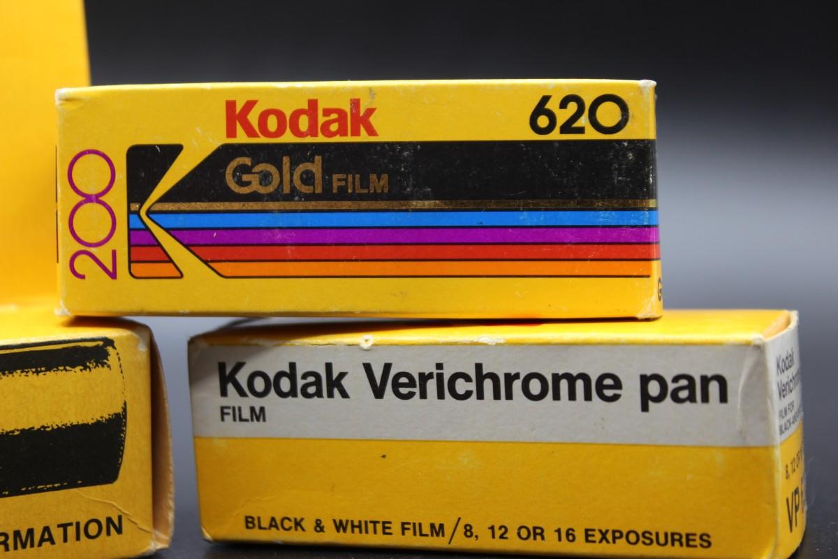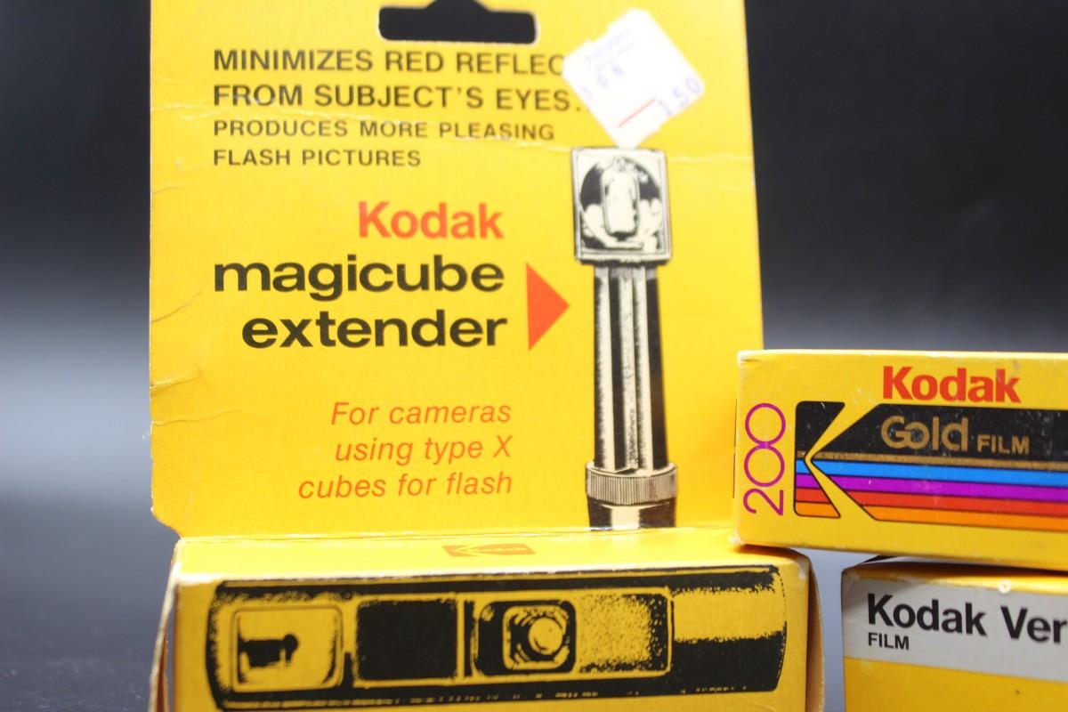 Miscellaneous vintage Kodak camera accessories and film. Magicube extender, Kodak 620 film, and Kodak Verichrome pan film. Unopened but useable condition unknown because of age.
