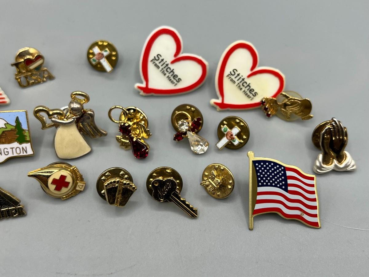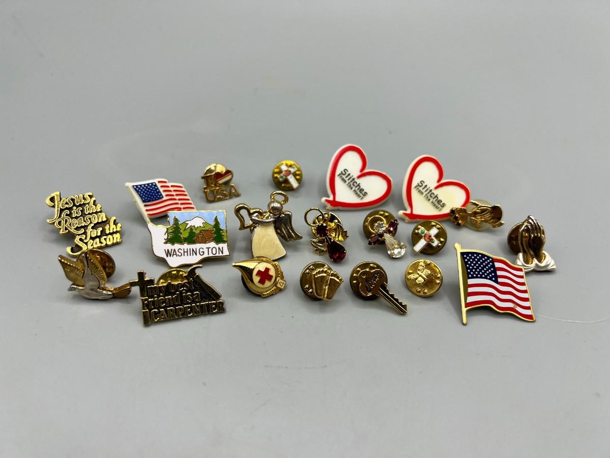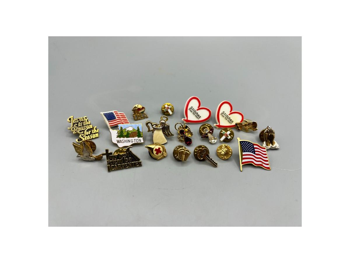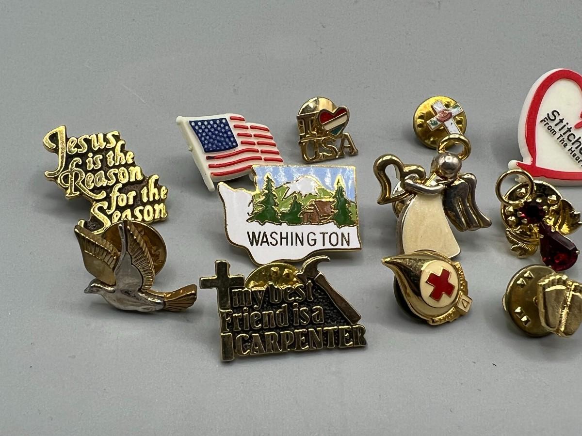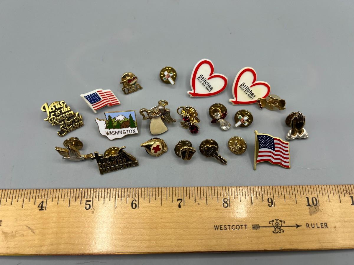 Miscellaneous collection of lapel pins. Religious pins, America pins, Angels and more.