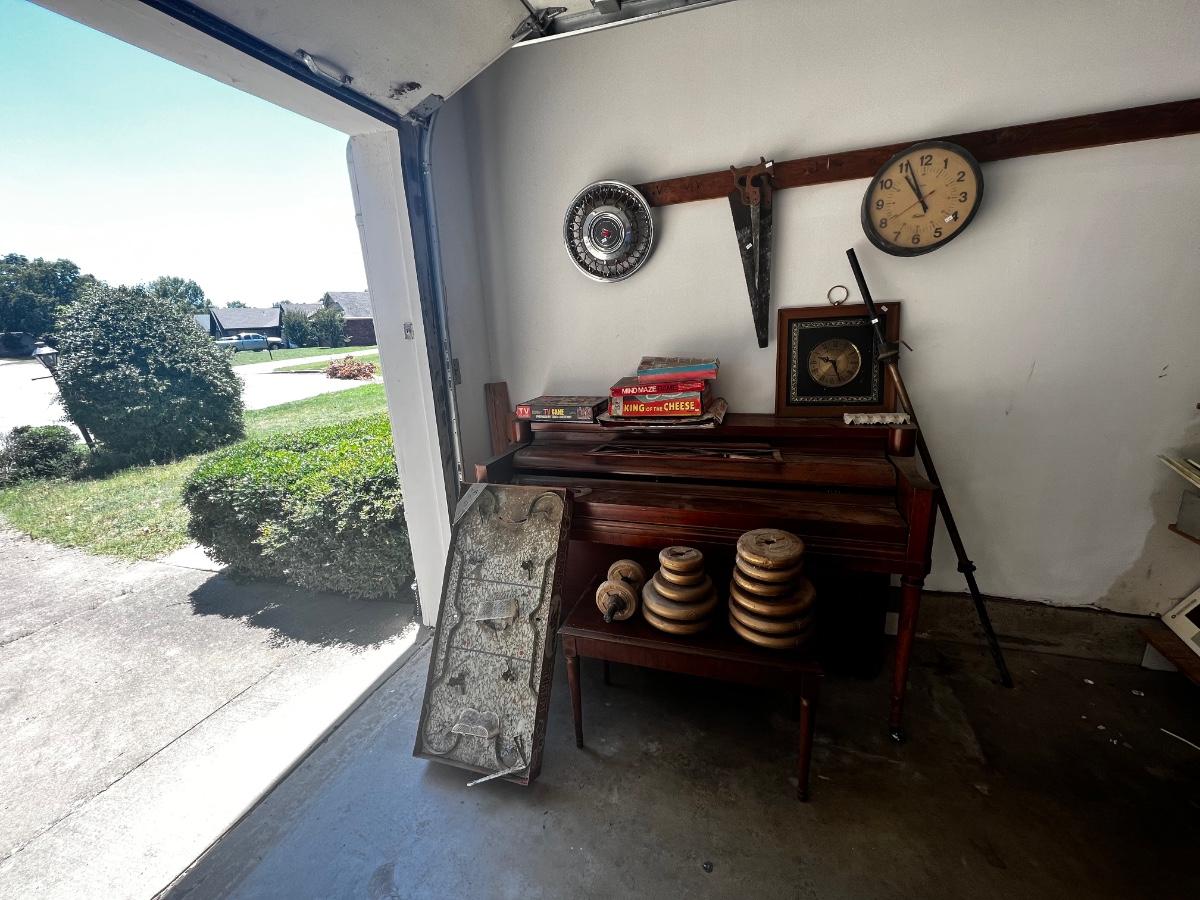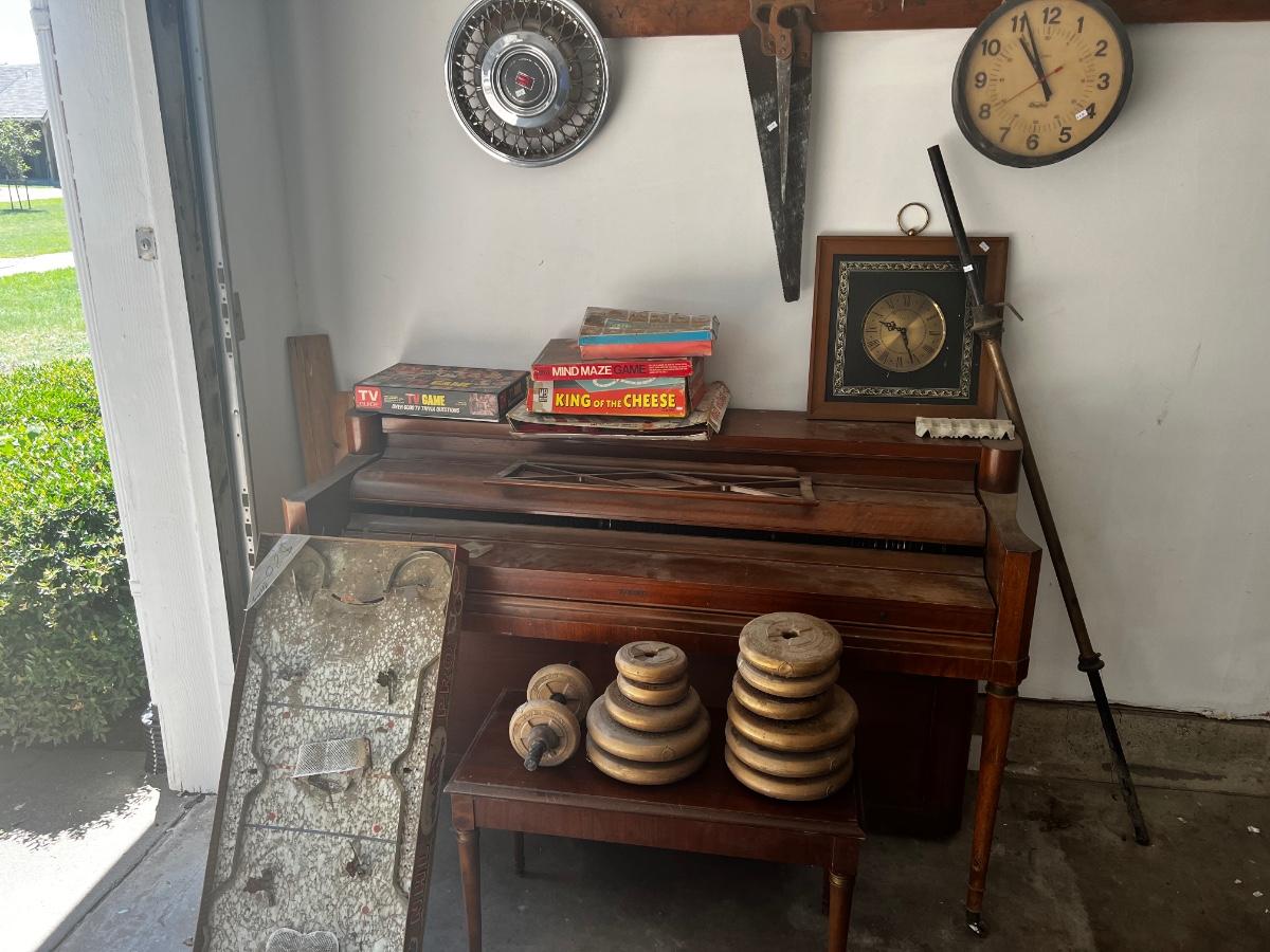 Piano, weights, hockey game, board games, hanging items, weight bar, and everything else on piano included in lot