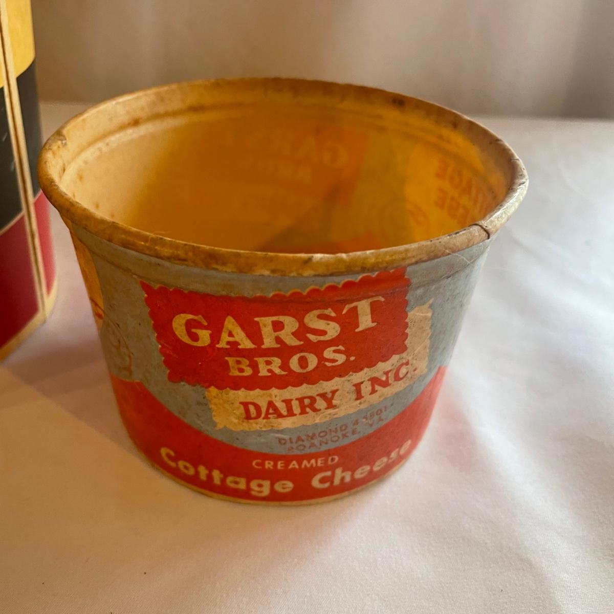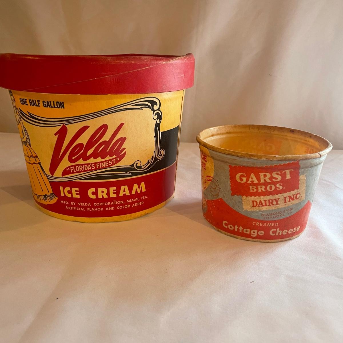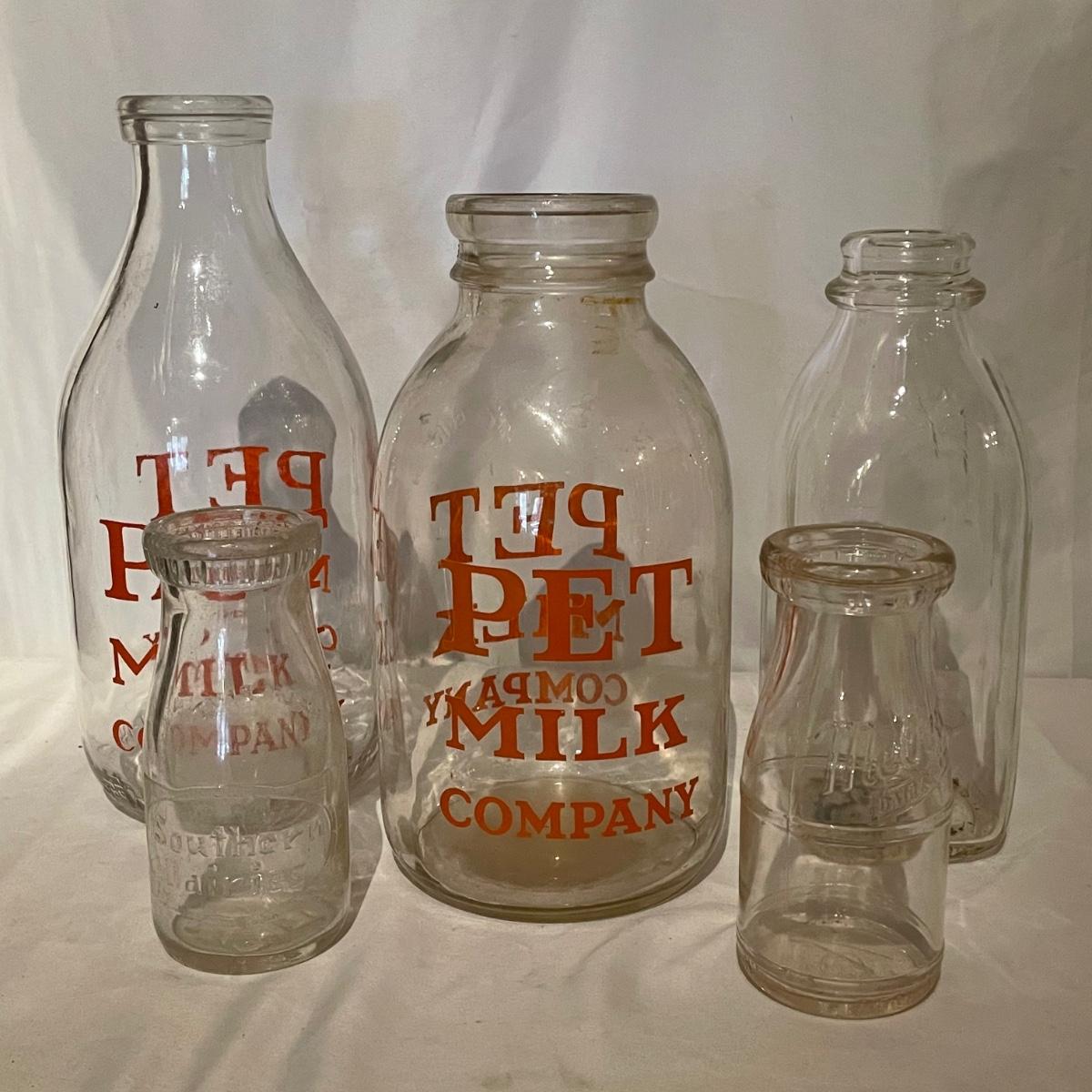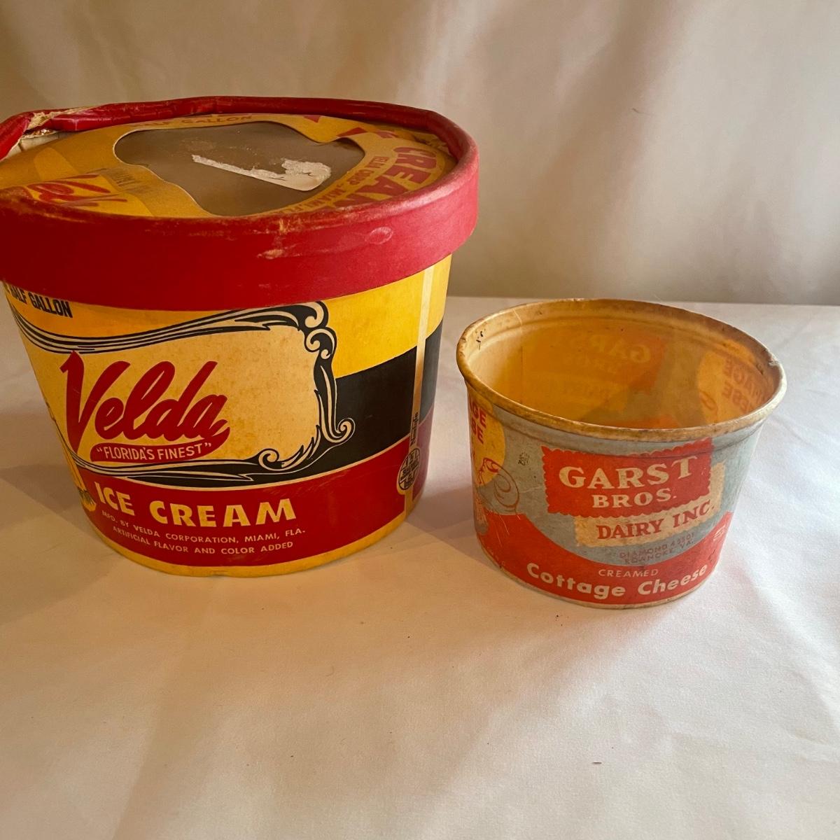 This assortment of five bottles includes a half pint from Southern Dairies of G.A and one from Melville Dairy. Also included are two half gallon PET milk bottles and an unmarked half pint bottle, a one half gallon Velda ice cream run and a Garst cottage cheese tub. Shipping Available