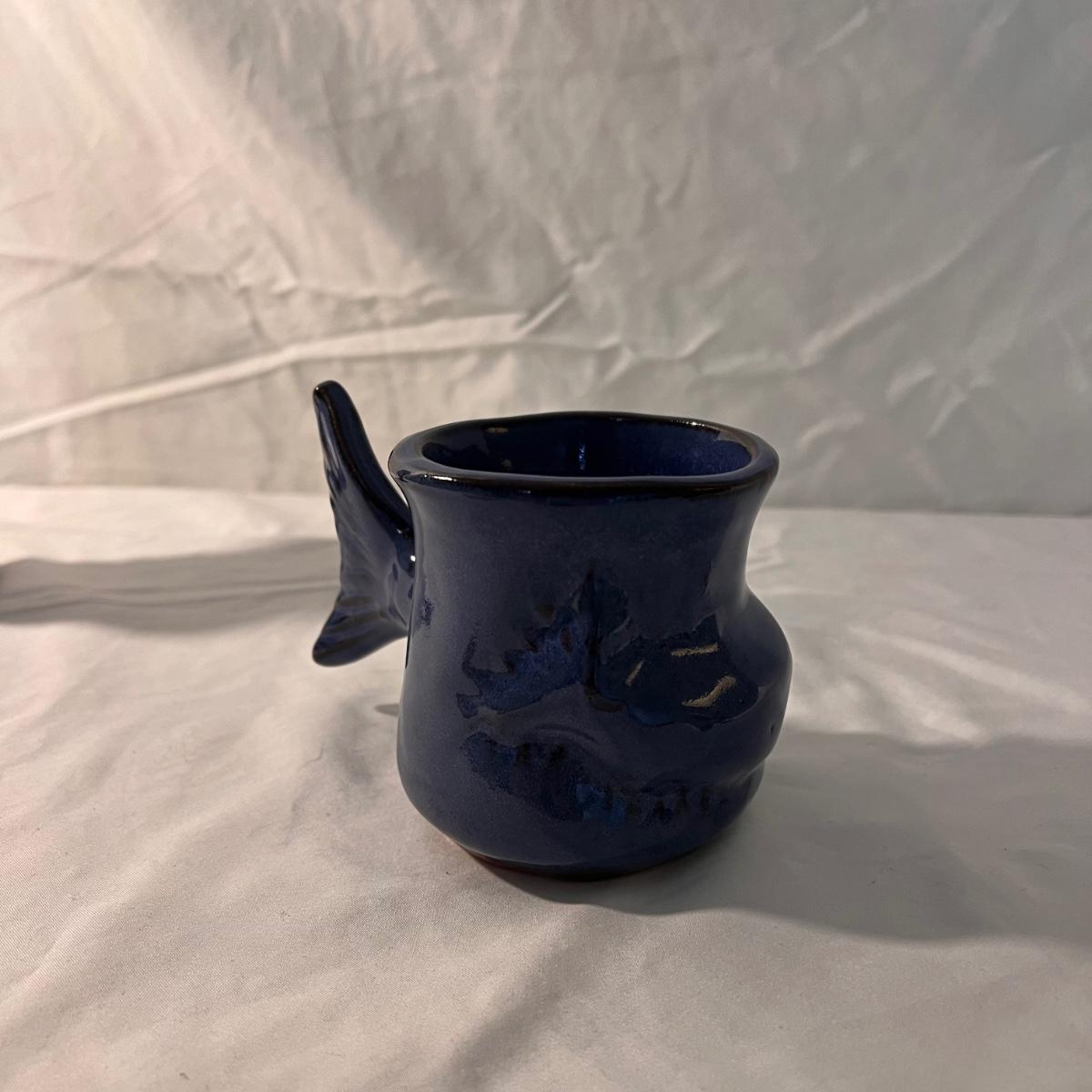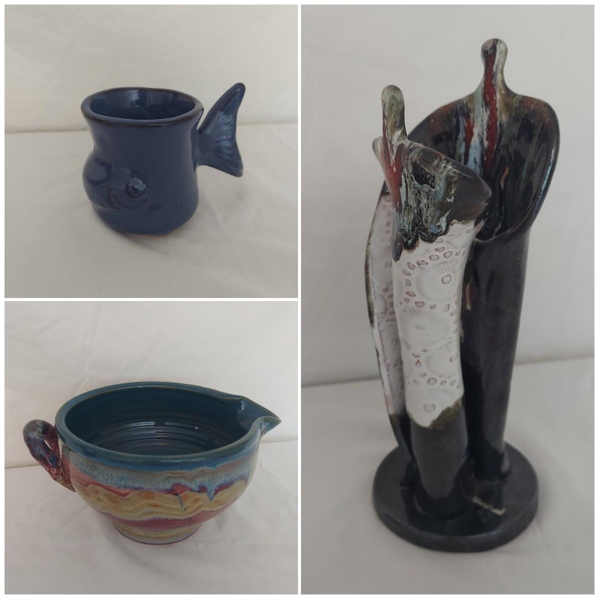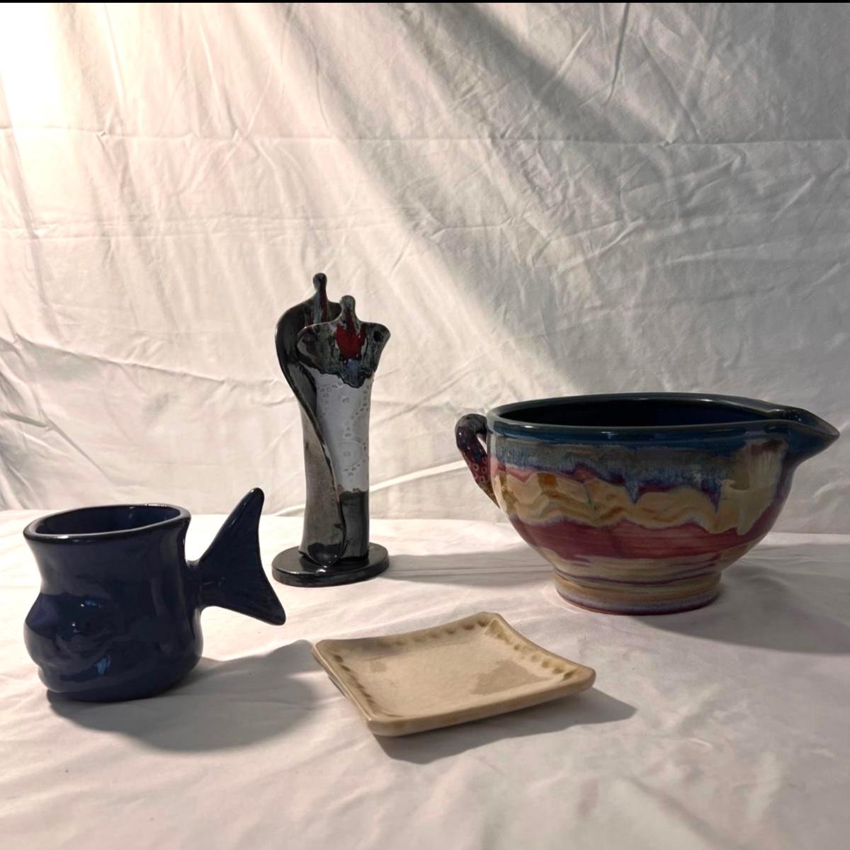 This lot includes four variously sized, unique pottery pieces. The largest item is a batter jug which measures 10"D x 5"H. The fish mug appears to say Thora on the bottom. The tall vase has several numbers on the bottom. The other two pieces do not appear to be marked. Shipping available.
