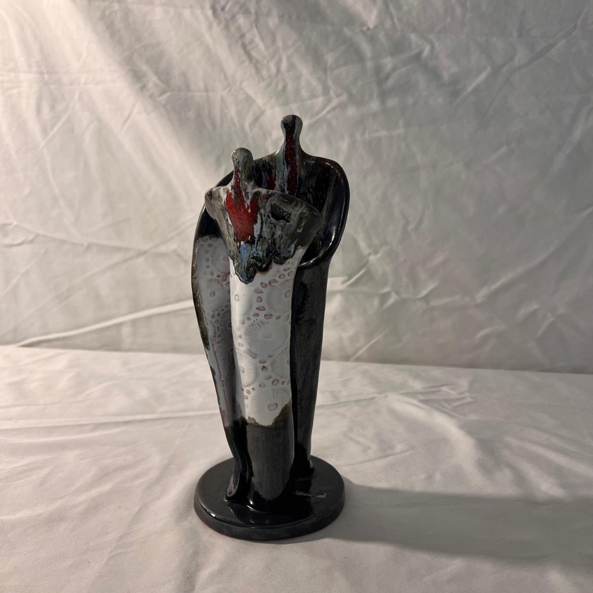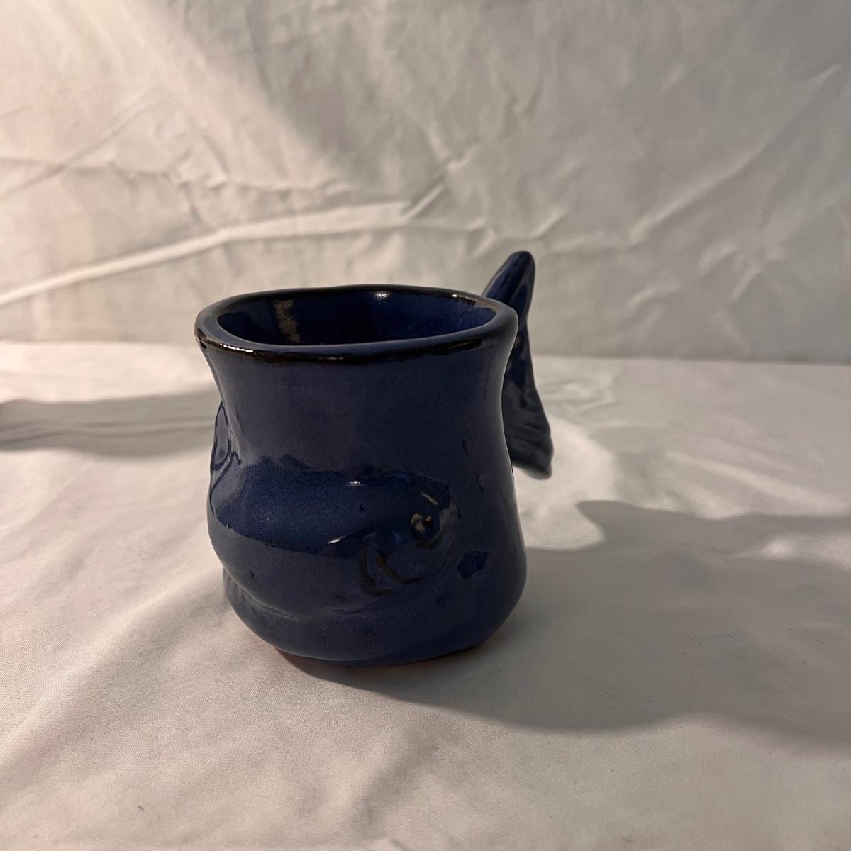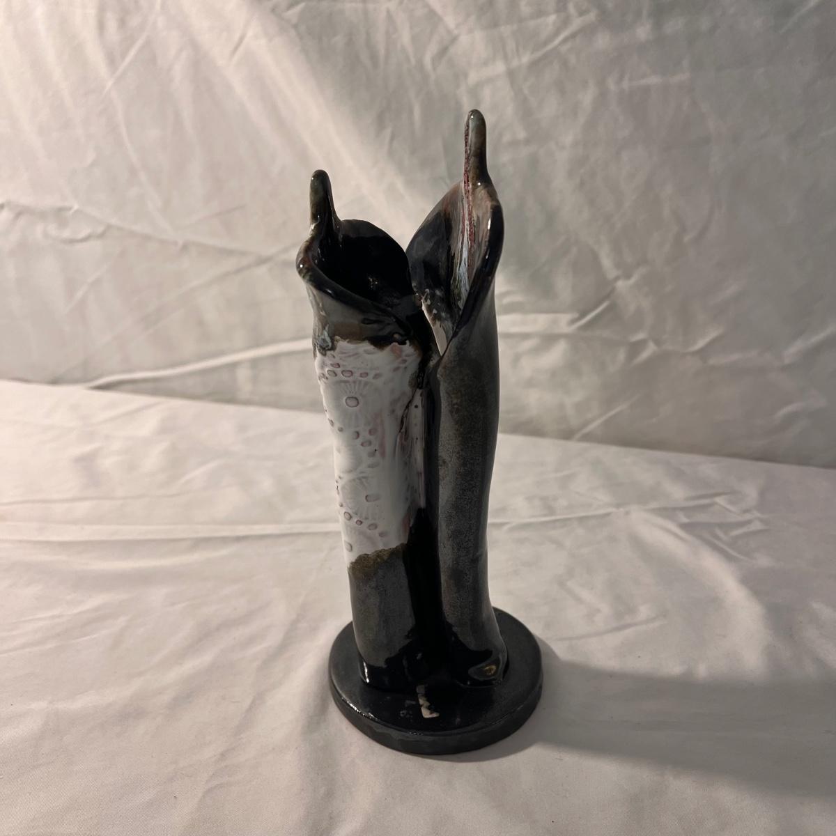 This lot includes four variously sized, unique pottery pieces. The largest item is a batter jug which measures 10"D x 5"H. The fish mug appears to say Thora on the bottom. The tall vase has several numbers on the bottom. The other two pieces do not appear to be marked. Shipping available.