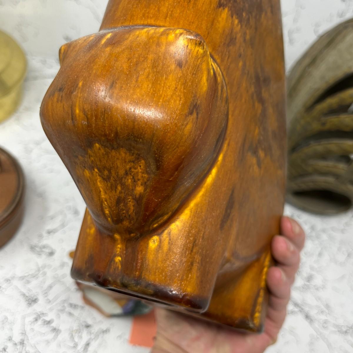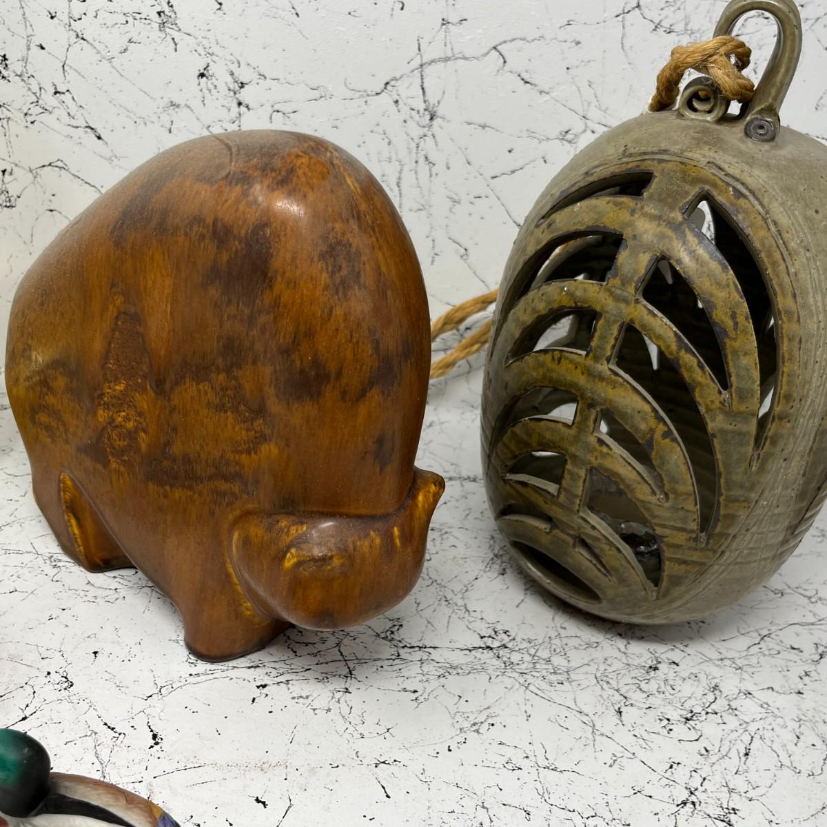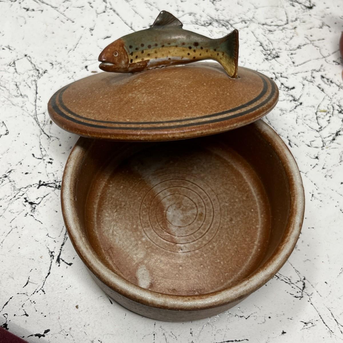 wood carved Buffalo, duck shaped napkin holder, trout topped coin tray.