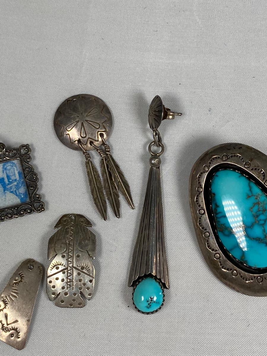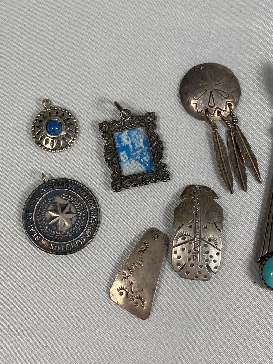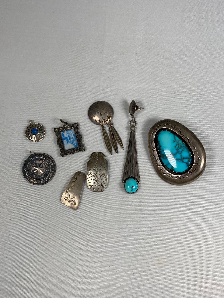 Miscellaneous lot of random southwestern sterling silver jewelry pieces. A few pieces are pendants while others are single earrings and charms. All are great for repurposing.
