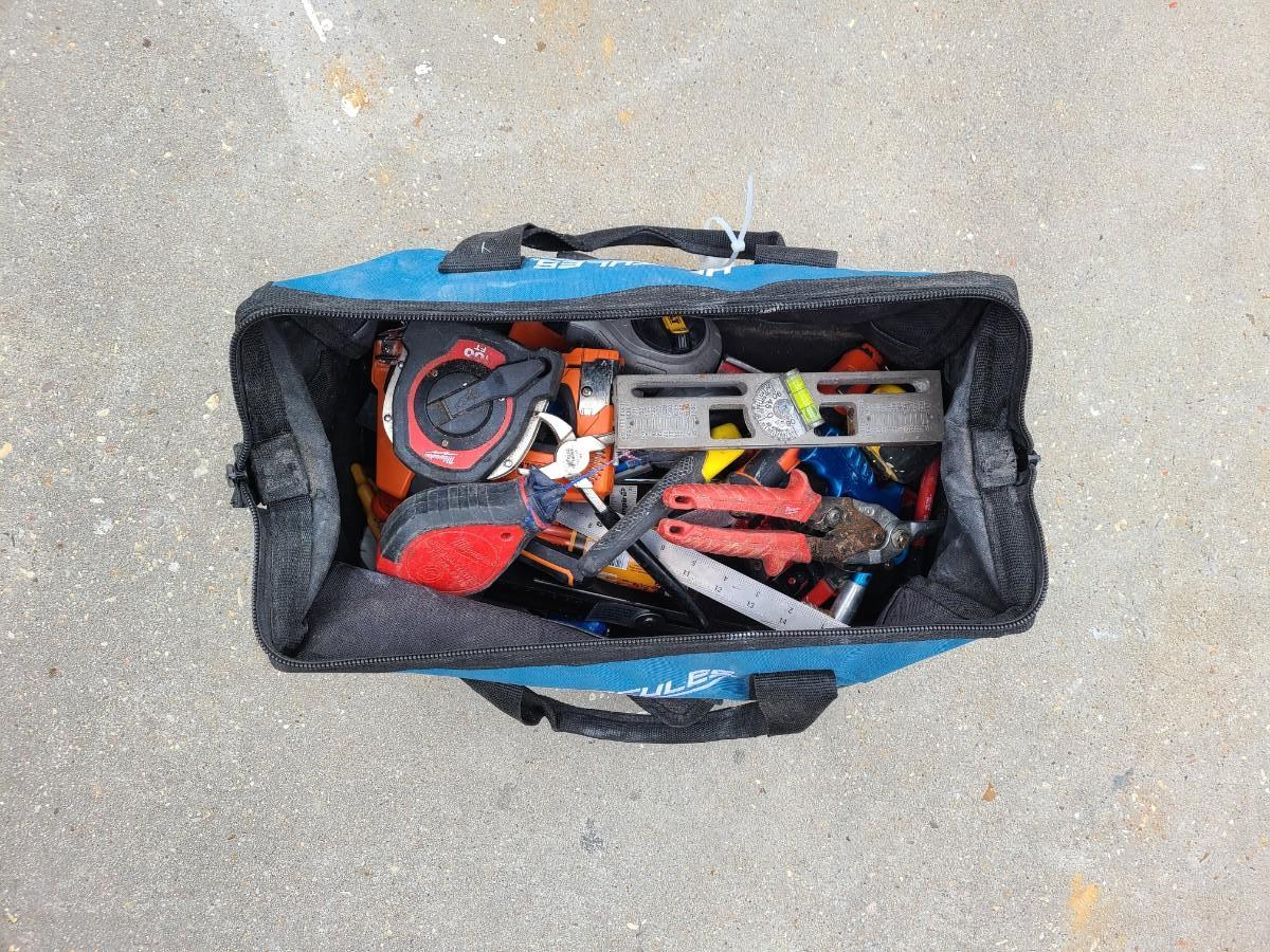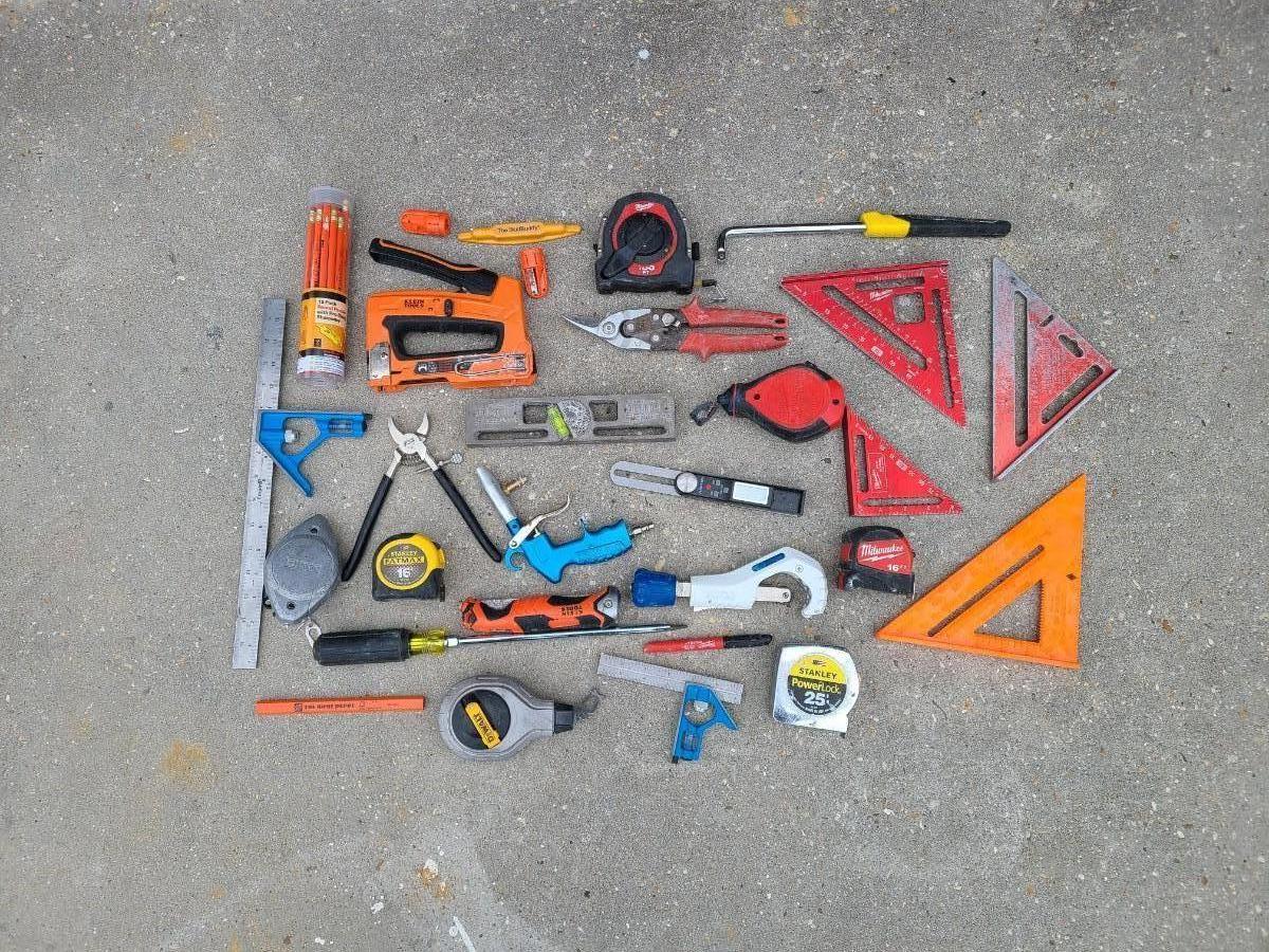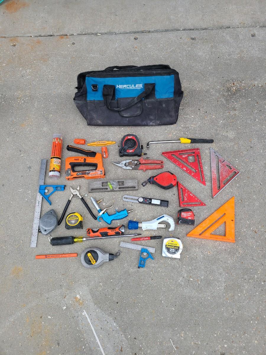 MISCELLANEOUS TOOL LOT w/Hercules Bag - Tape Measure, Speed Squares, Chaulk Lines, Pipe Cutter & More, See pics