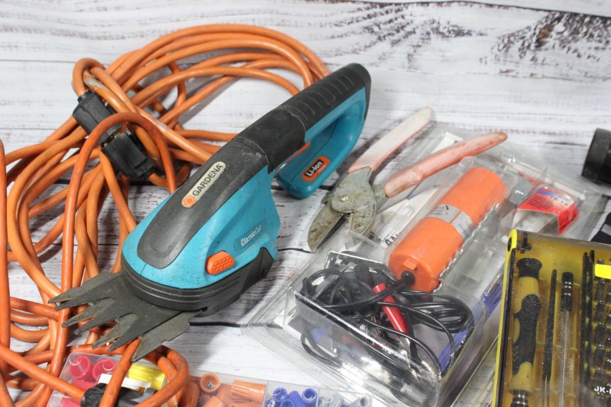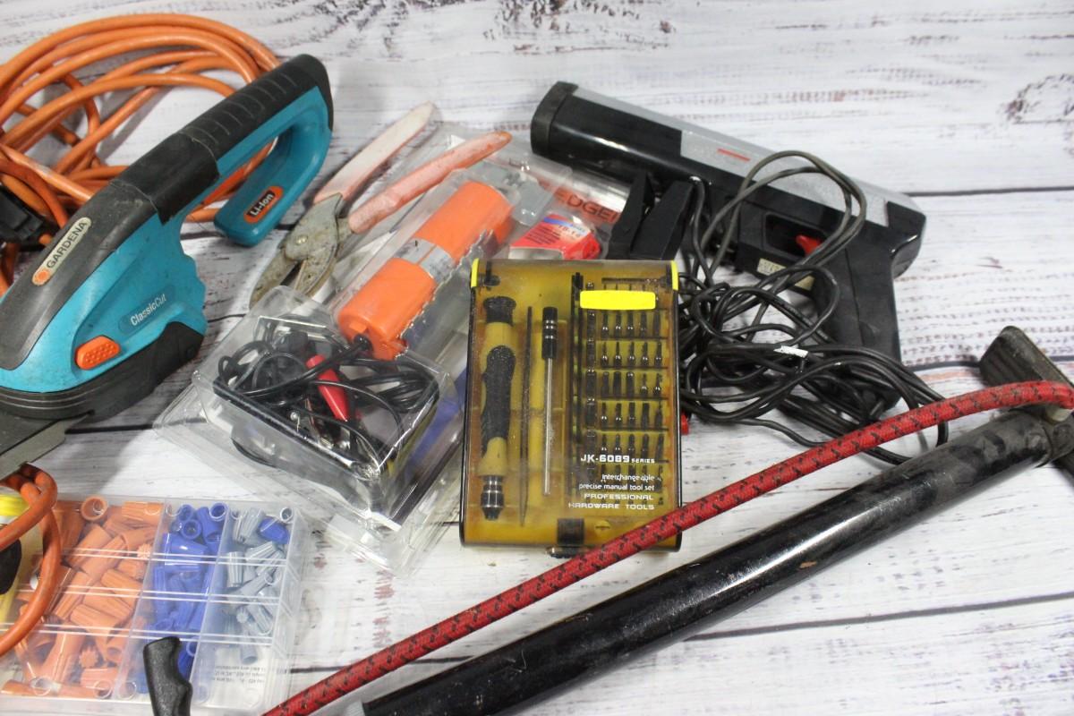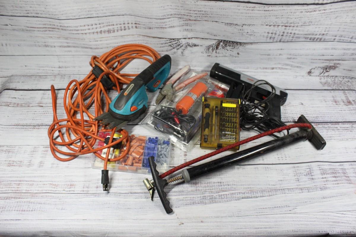 Miscellaneous Tools and Hardware Lot, comes with extension cables, electric shears, tire pump, a Sears Inductive - PIckup DC Timing Light Gun, and more. Check pictures for more details, everything in this lot has been untested.
