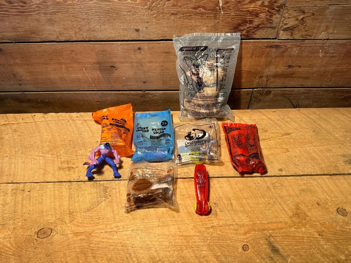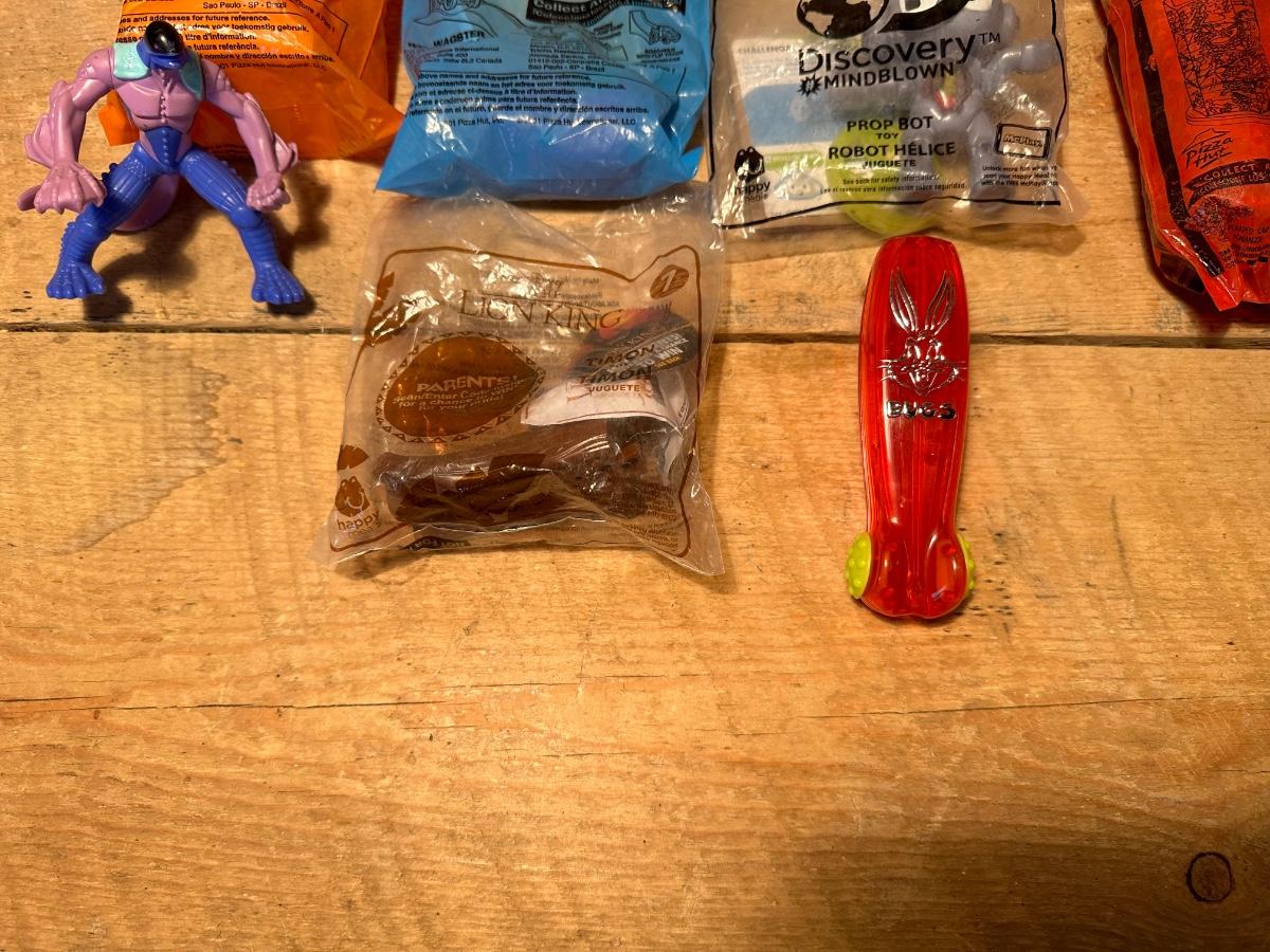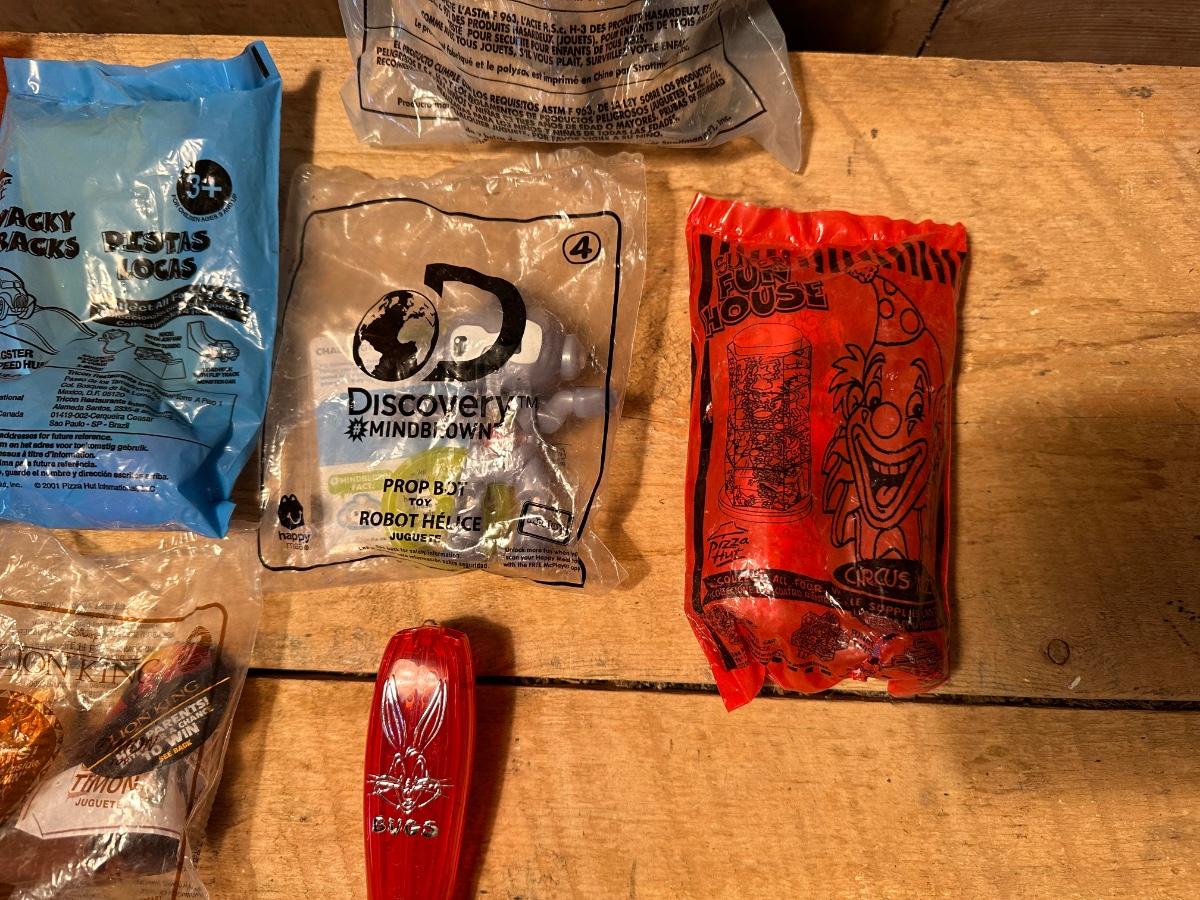 Yo Quiero Taco Bell dog, Lion King happy meal toy, Discovery Prop Bot toy, bugs bunny pez dispenser, wacky tracks, fun house toy and little action figure.
