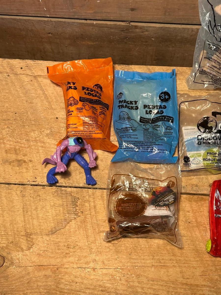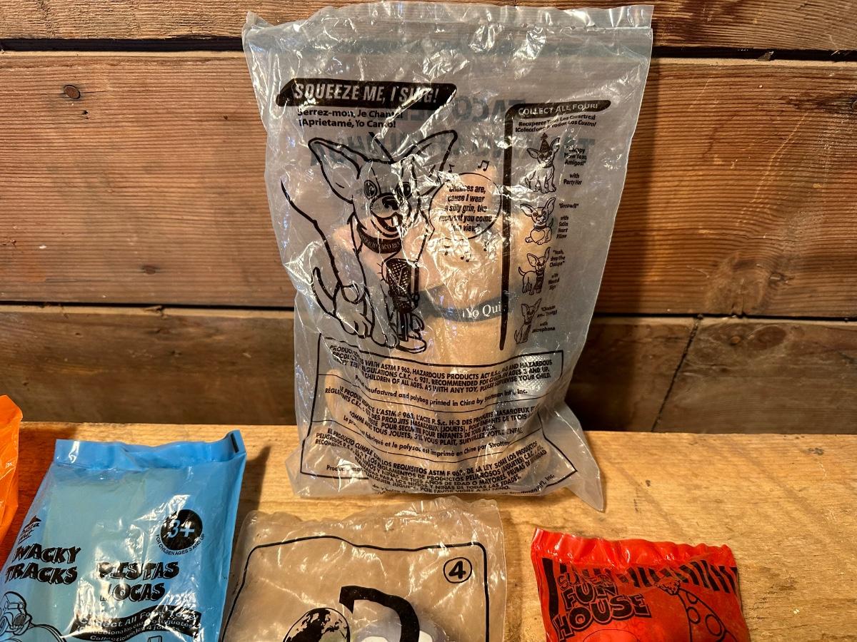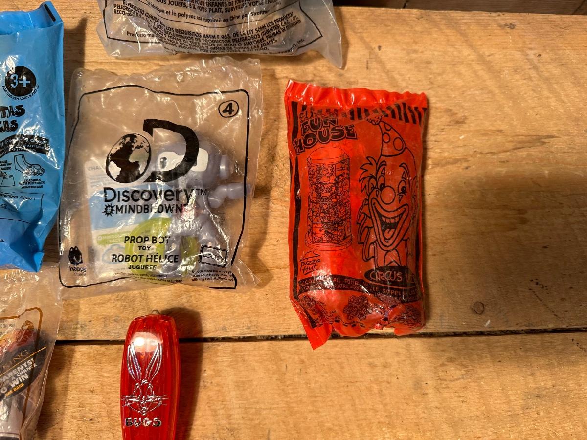 Yo Quiero Taco Bell dog, Lion King happy meal toy, Discovery Prop Bot toy, bugs bunny pez dispenser, wacky tracks, fun house toy and little action figure.