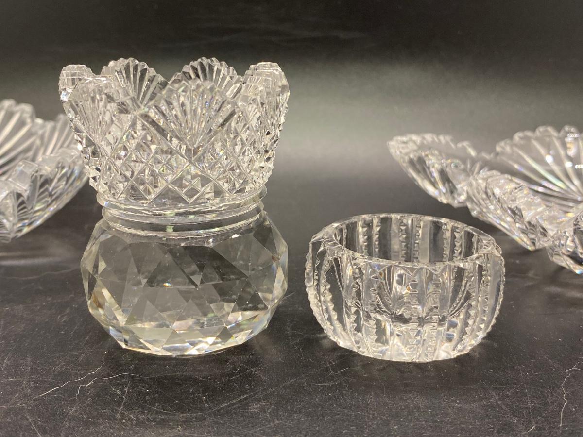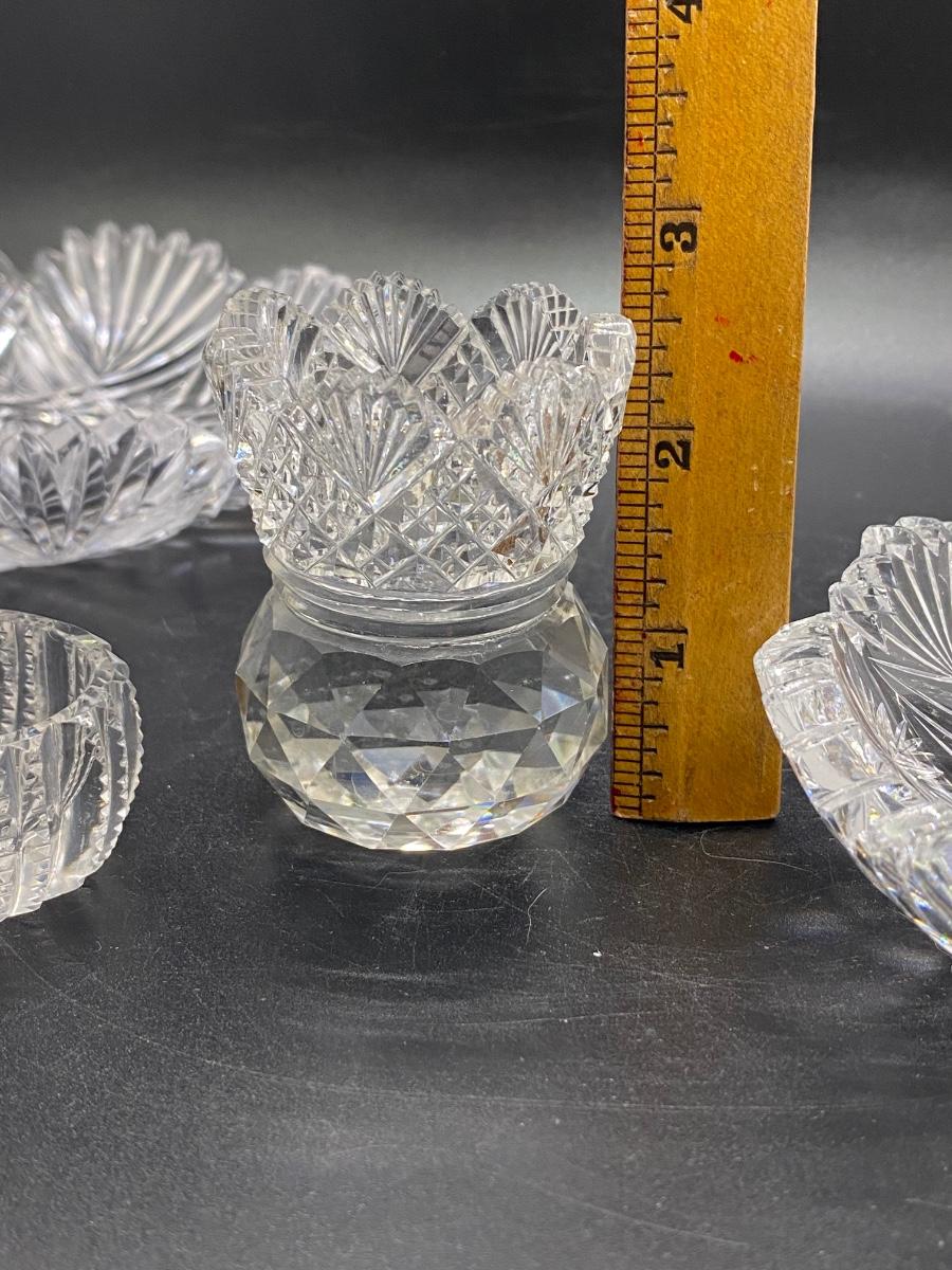 Mixed crystal tableware serving piece lot. Two shallow nut dishes, pineapple shaped toothpick holder, and an open salt. Pieces are in good vintage condition.