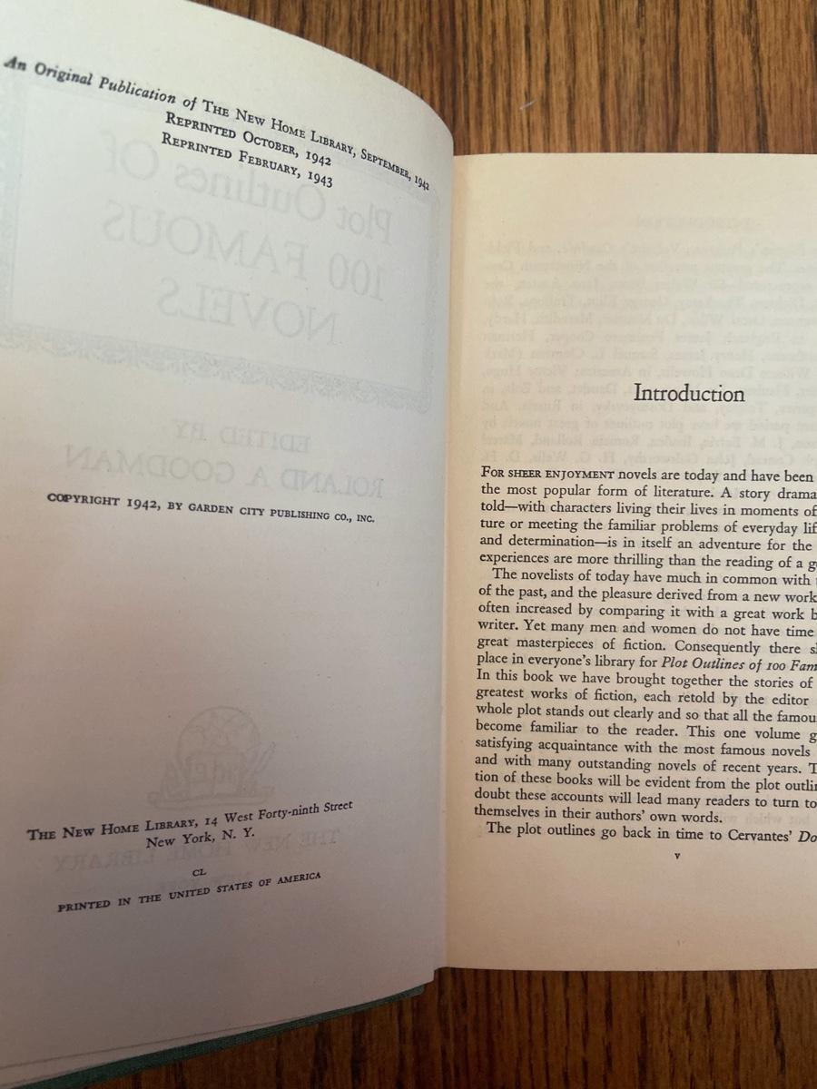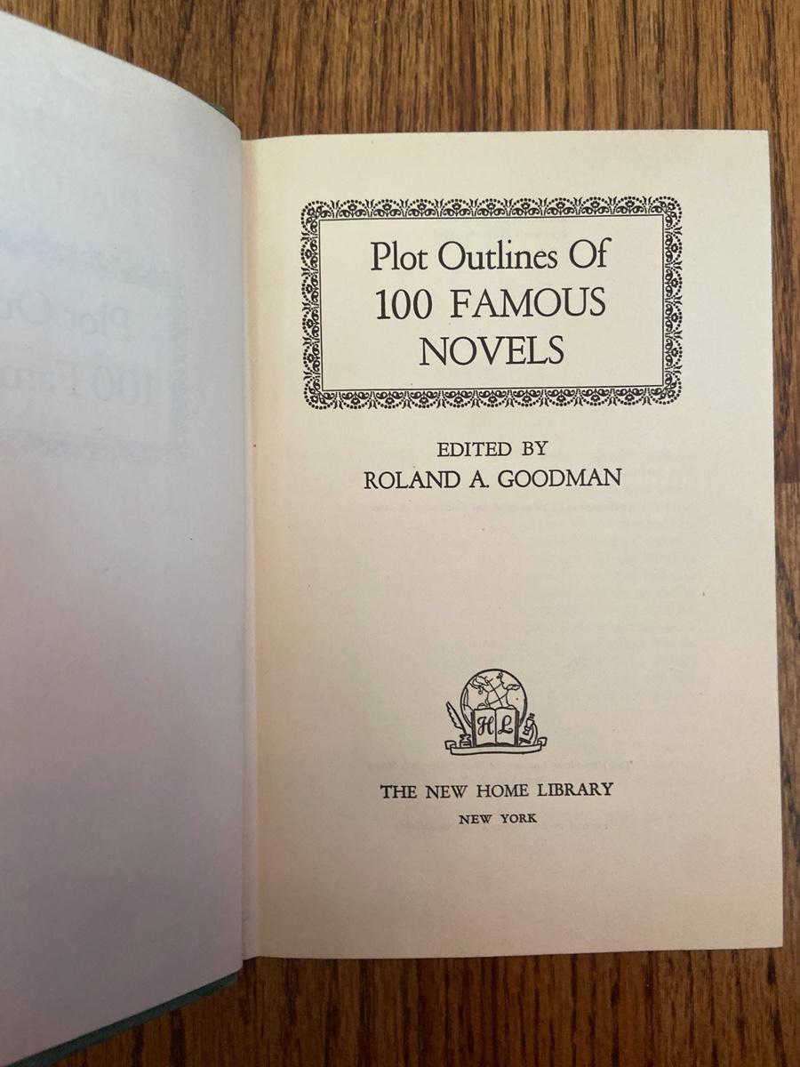 Plot Outlines of 100 Famous Novels edited by Roland A. Goodman (1942). , Green Hardcover, Great condition published by Garden City Publishing Co