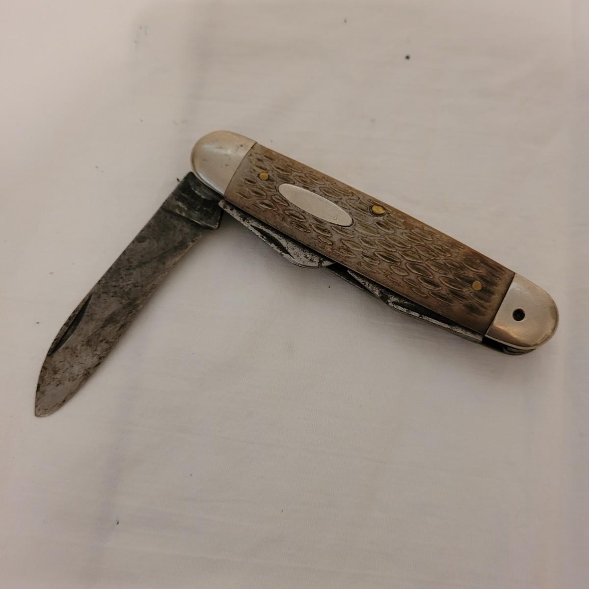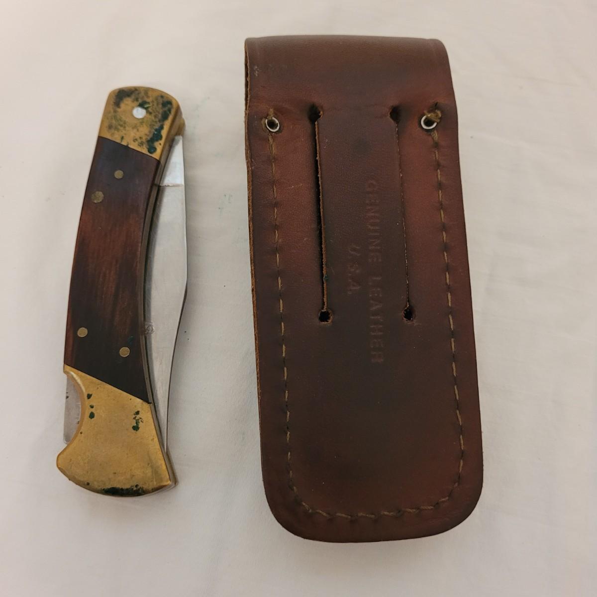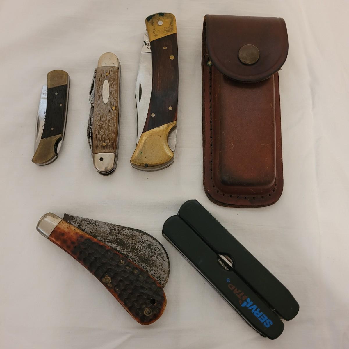 This lot includes five miscellaneous pocket knives and one leather holster. There are four folding knives and one folding multi tool. The largest knife has its own leather holster and measures 5" in length. The smallest knife measures 3" in length. Please see photos for details.