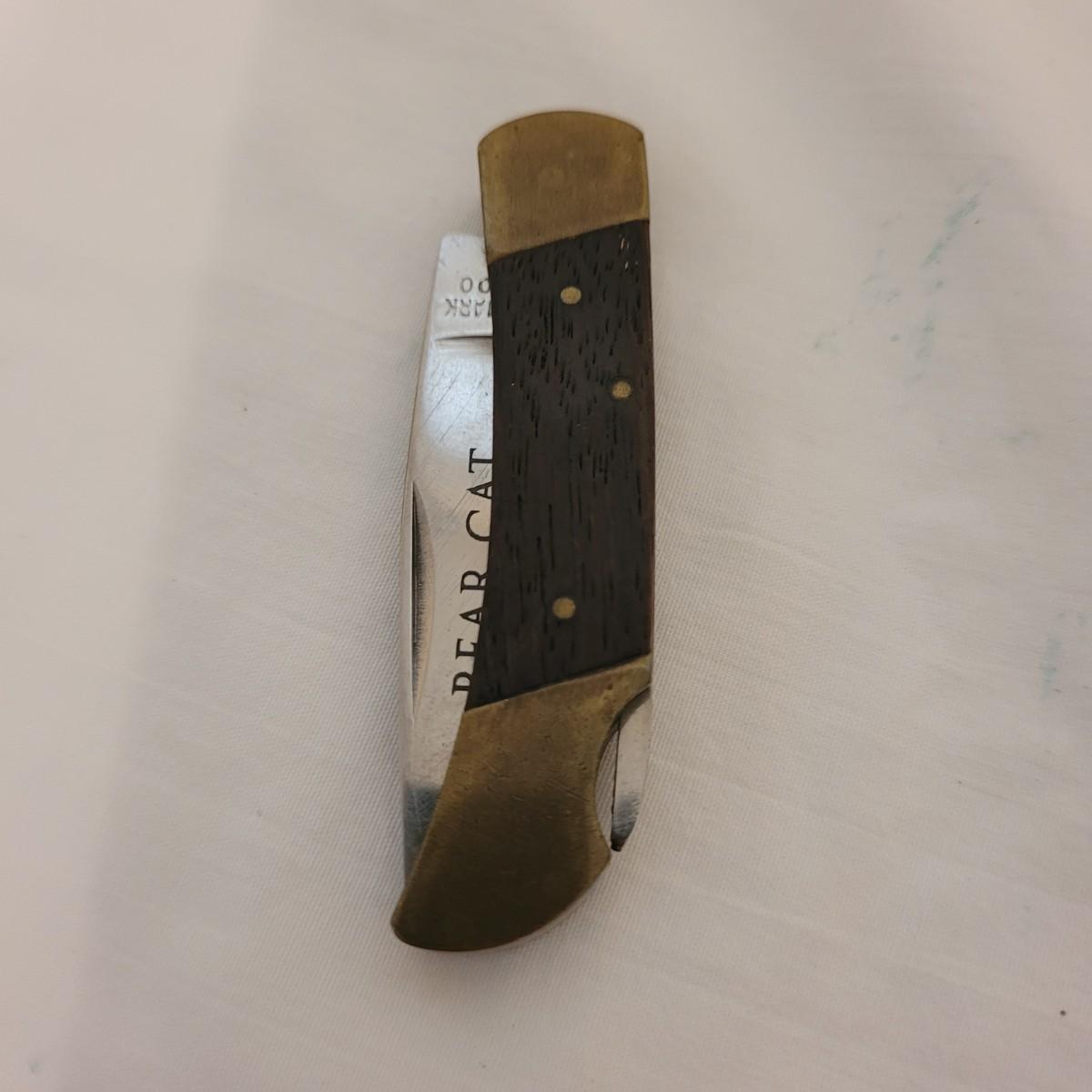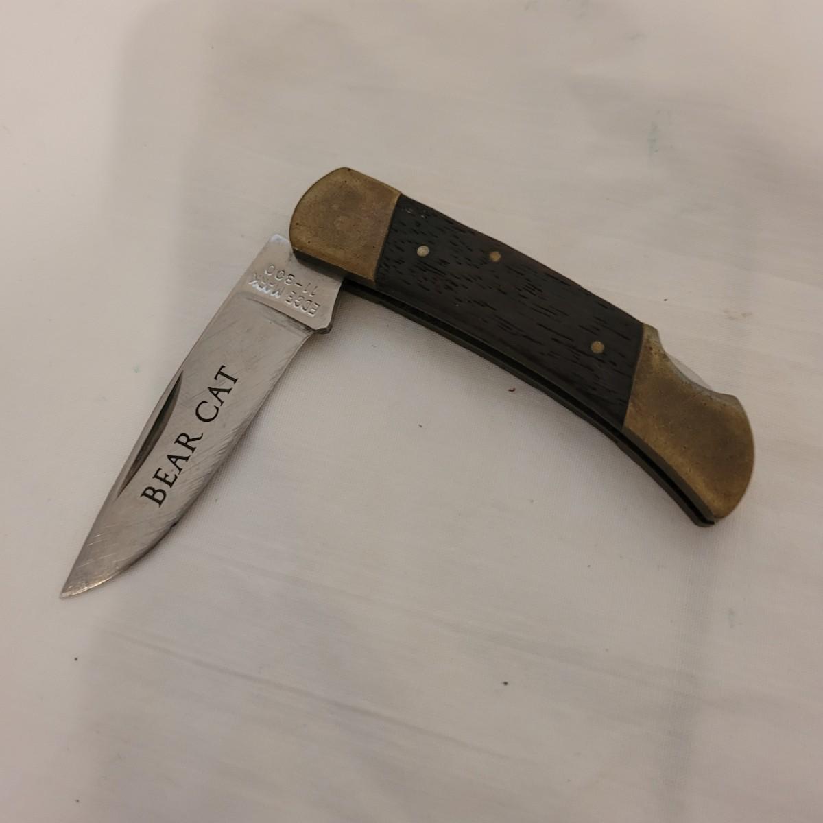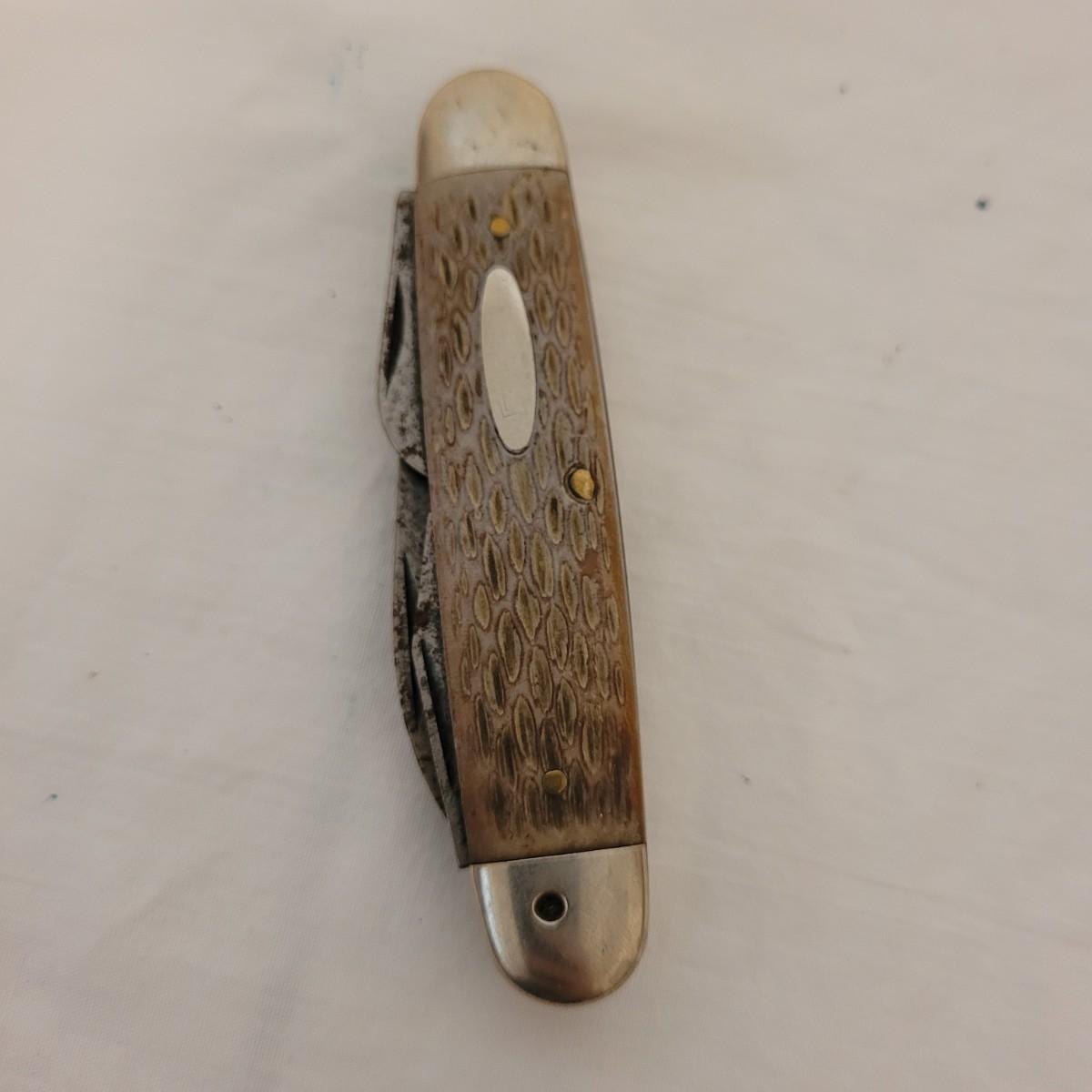 This lot includes five miscellaneous pocket knives and one leather holster. There are four folding knives and one folding multi tool. The largest knife has its own leather holster and measures 5" in length. The smallest knife measures 3" in length. Please see photos for details.