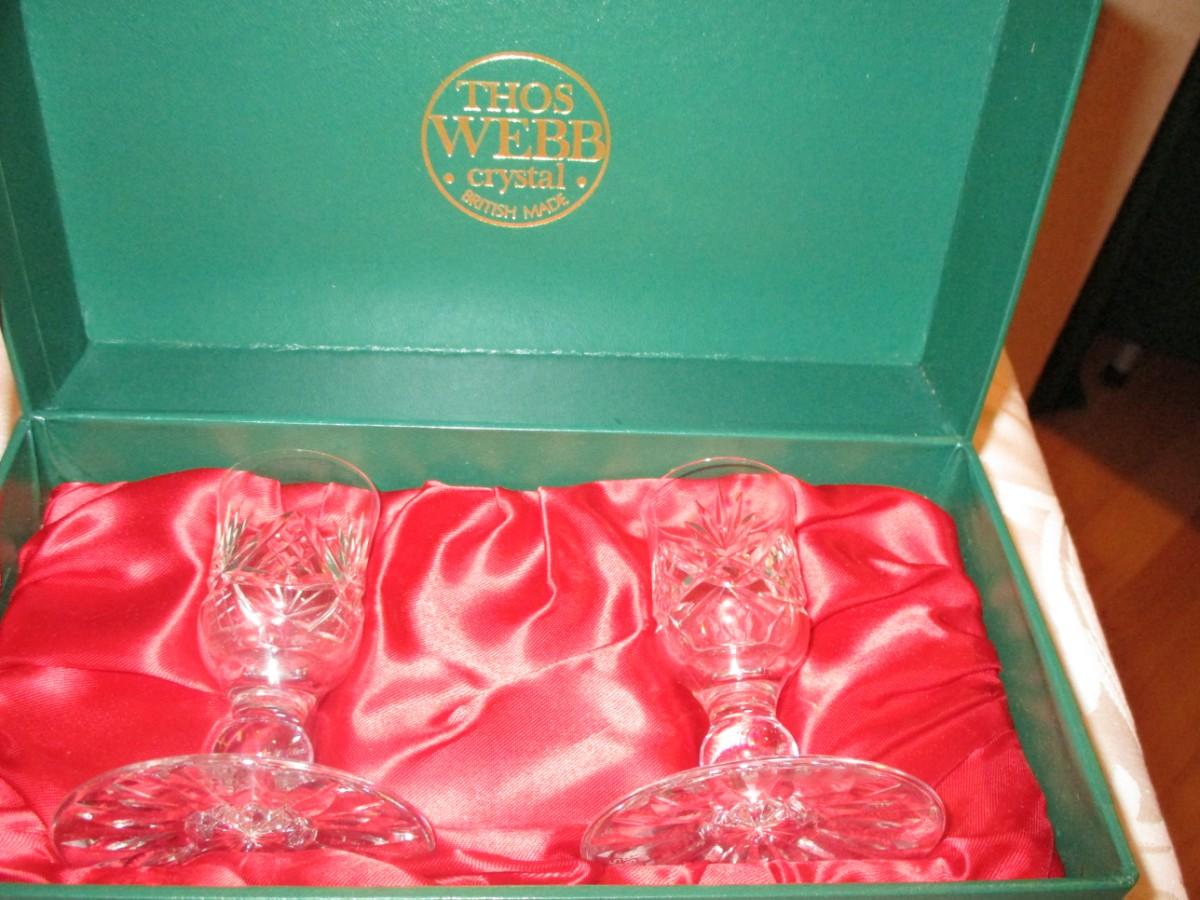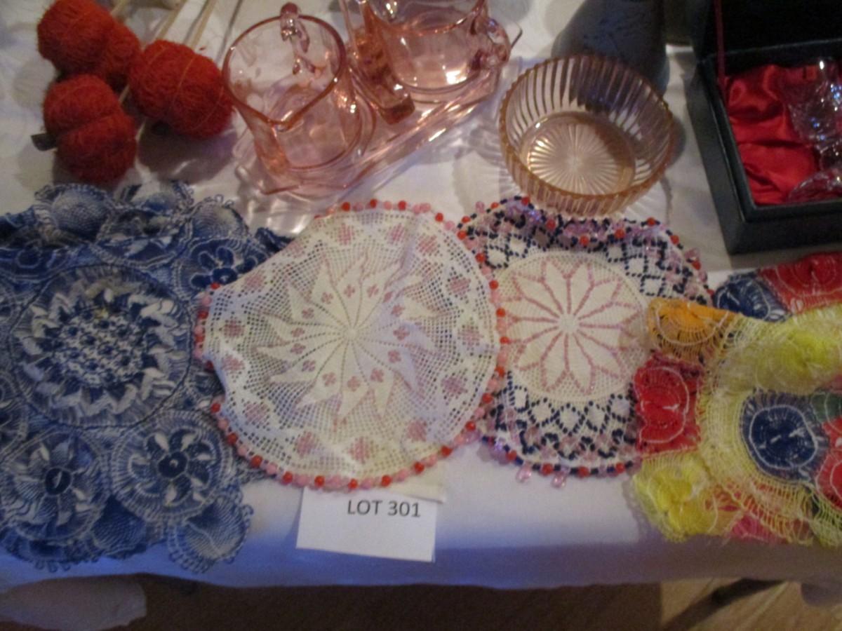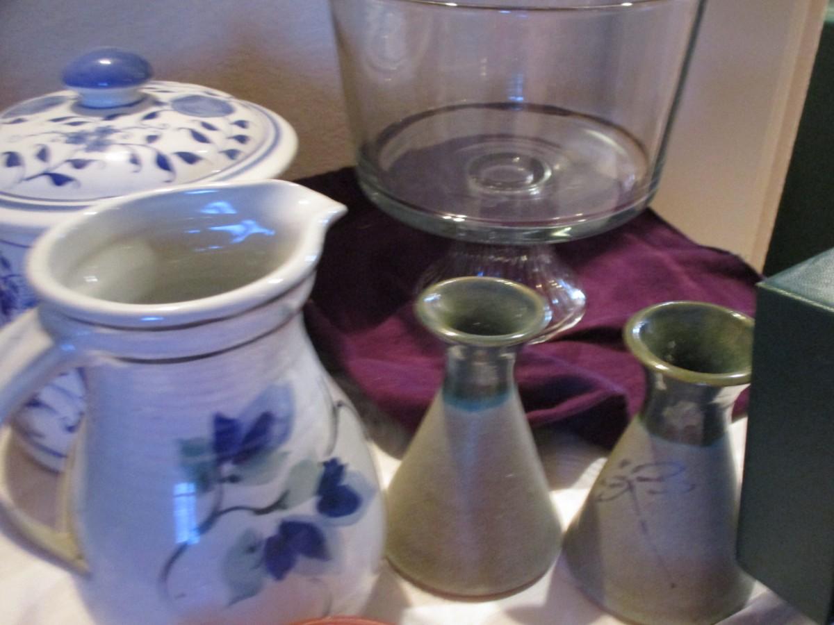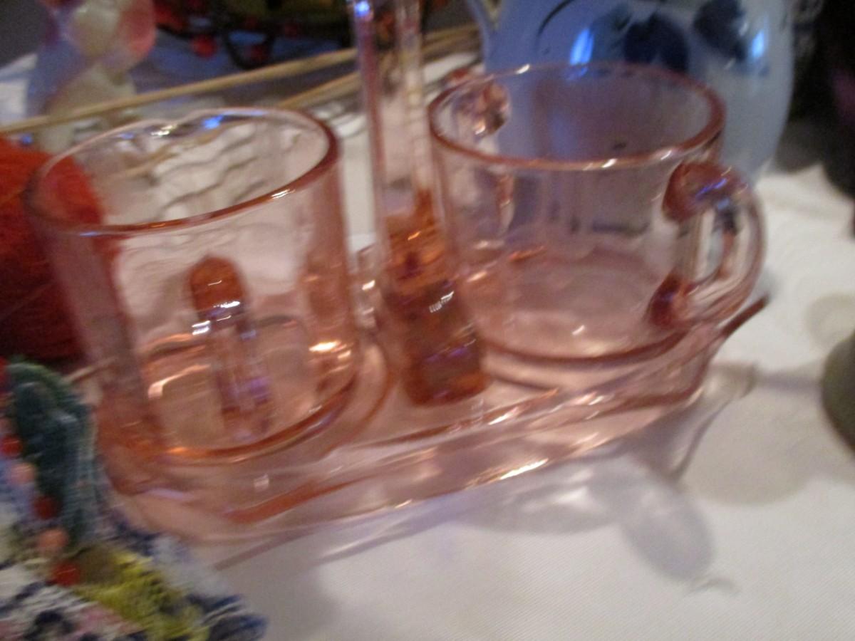 Thos Webb Crystal cordials. Etched Pink Glass cream/sugar. Doilies. Trifle bowl on pedestal, handcrafted pitcher, blue/white canister