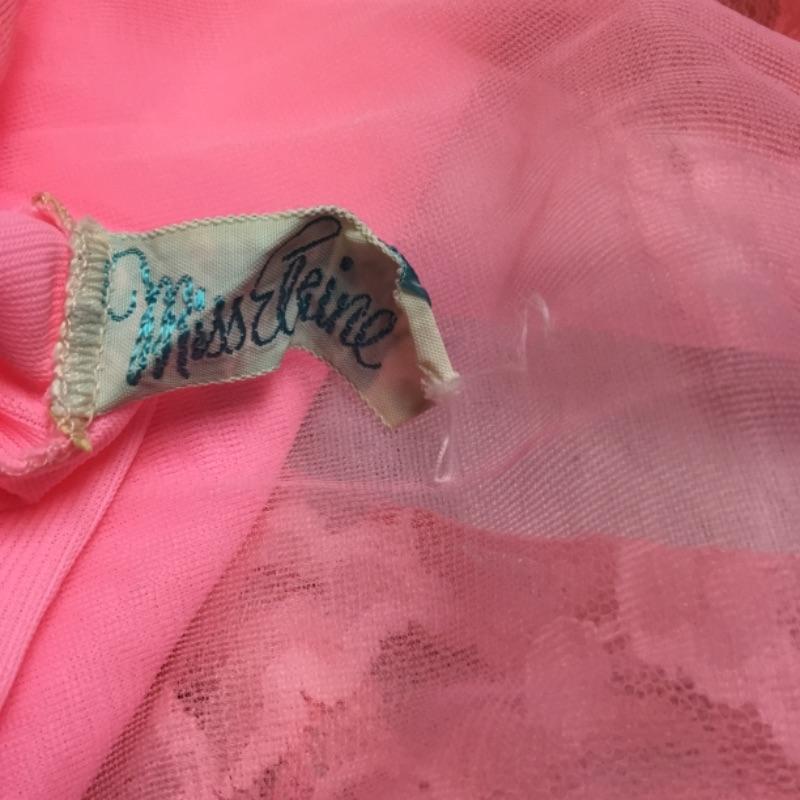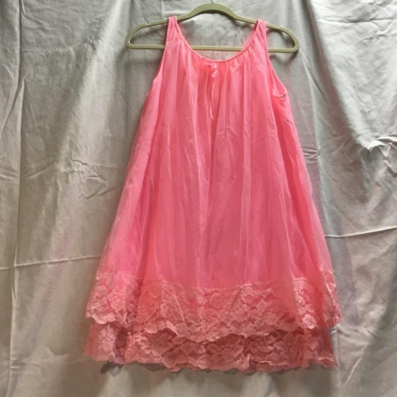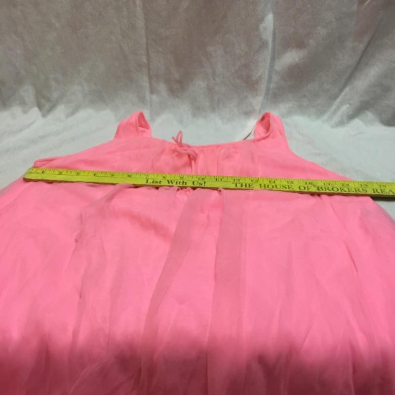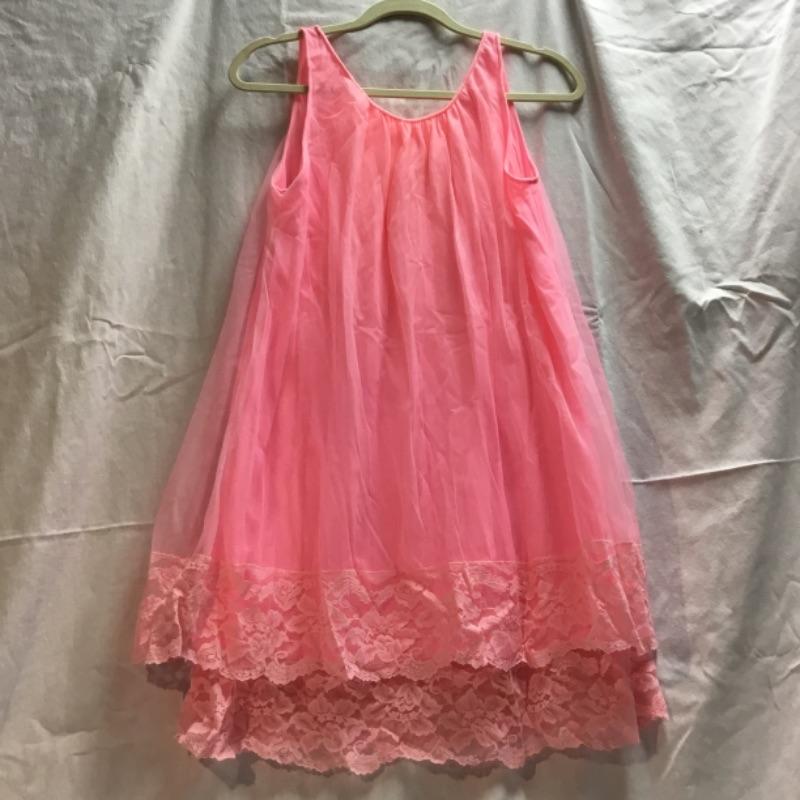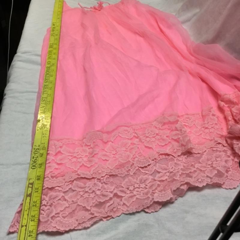 Here we have a women’s hot pink vintage nightgown. This garment has a pink lining with a very sheer material on top. Light pink lace trim is in great condition with no holes or stains. There is a tiny stain inside the garment near the back neck line and the pink draw string bow in front is attached via safety pin. No size tag look to possibly fit an adult size small, See pictures. No stains or tears on outside facing of the garment.