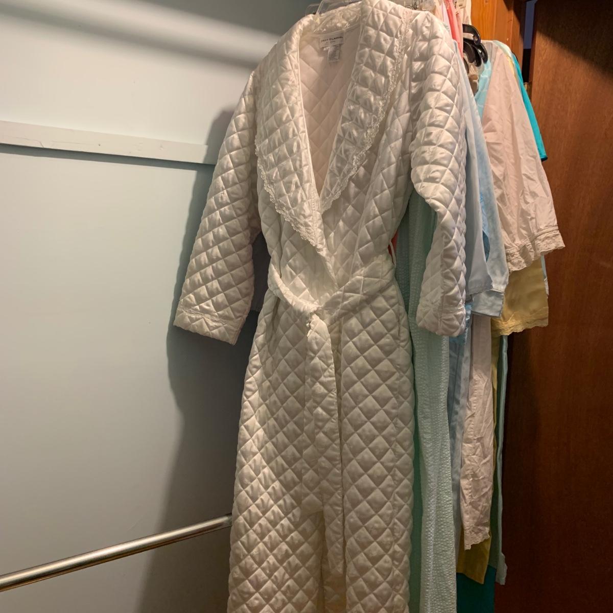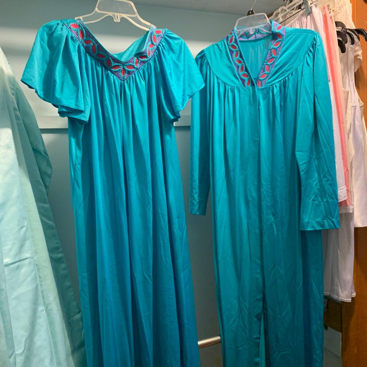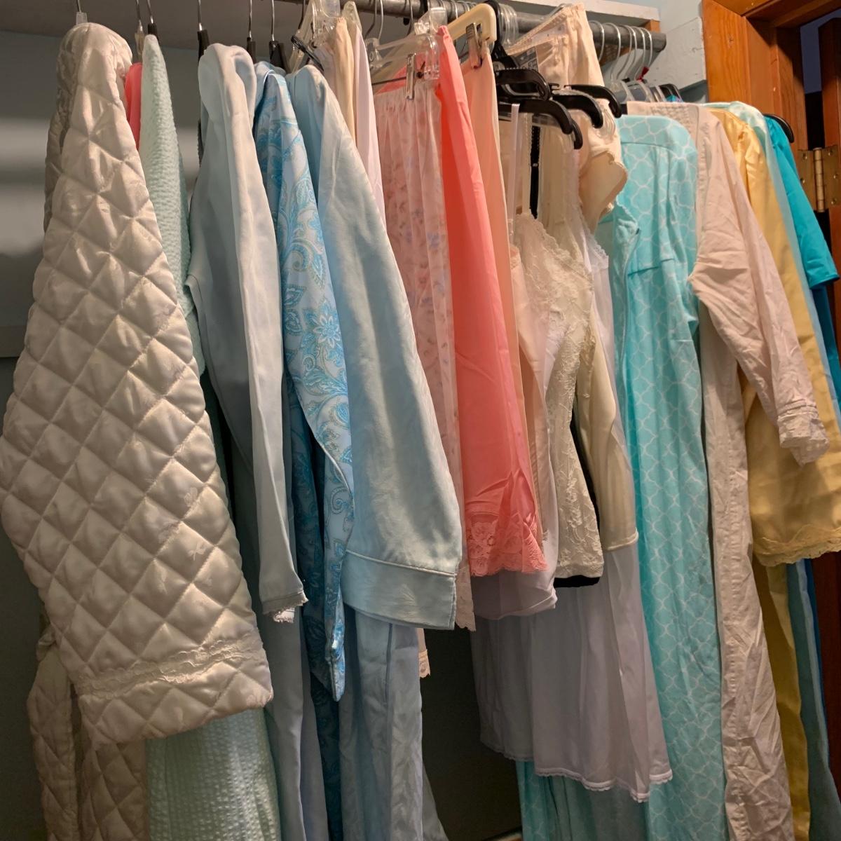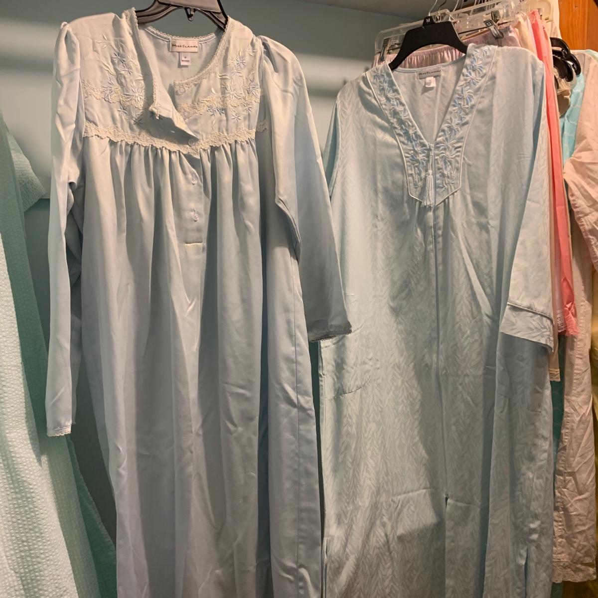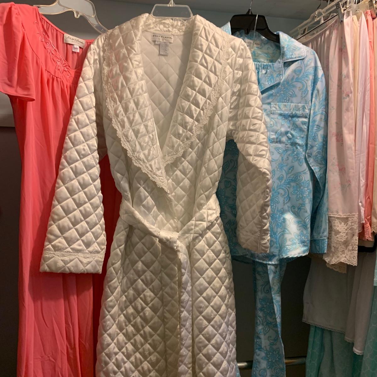 A wonderful quilted robe with a satin feel by Miss Elaine (size L) starts this collection. There are four Miss Elaine nightgowns as well as one PJ set. There’s also a lightweight cotton robe by Adonna plus three long sleeved nightgowns, as well as a matching robe and nightgown set, six slips, and nine camisoles. Five pairs of brand new size L underwear are also included. Most items are size M. Please see pictures for brands and sizes.