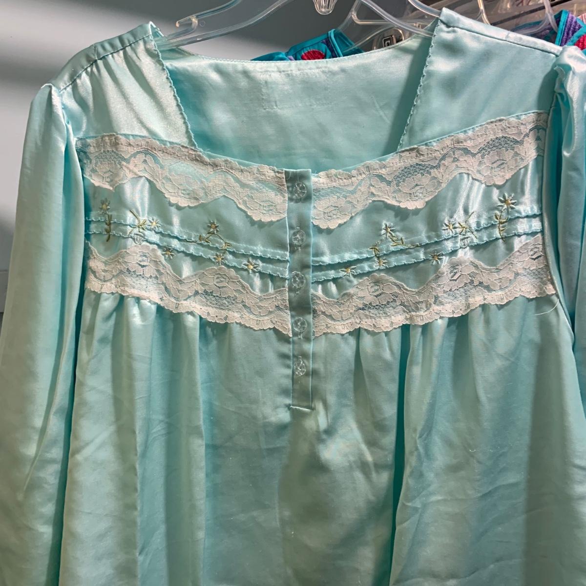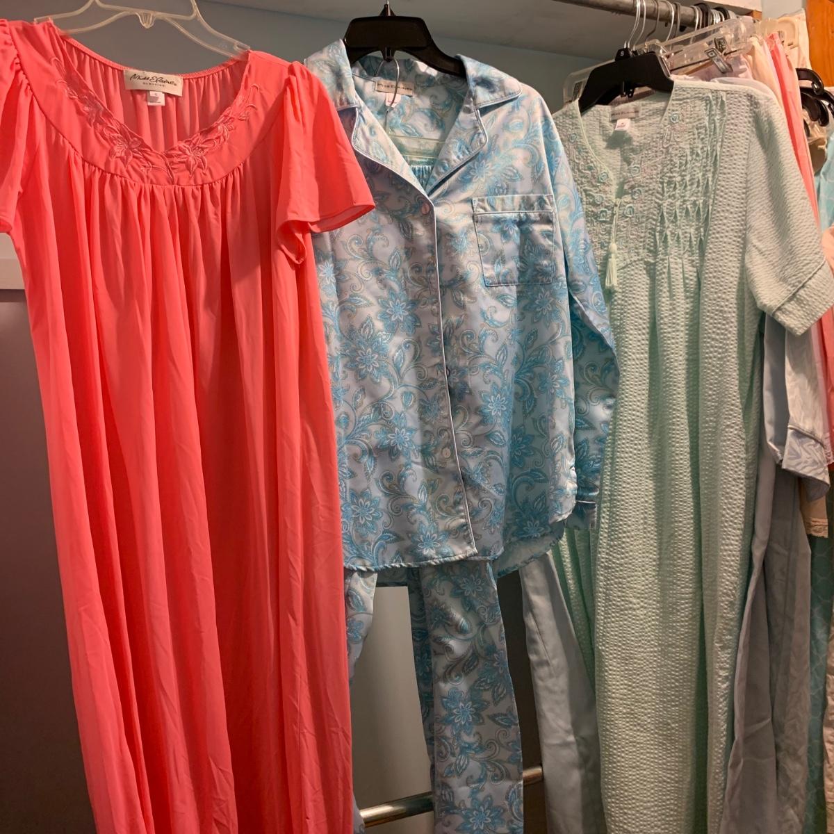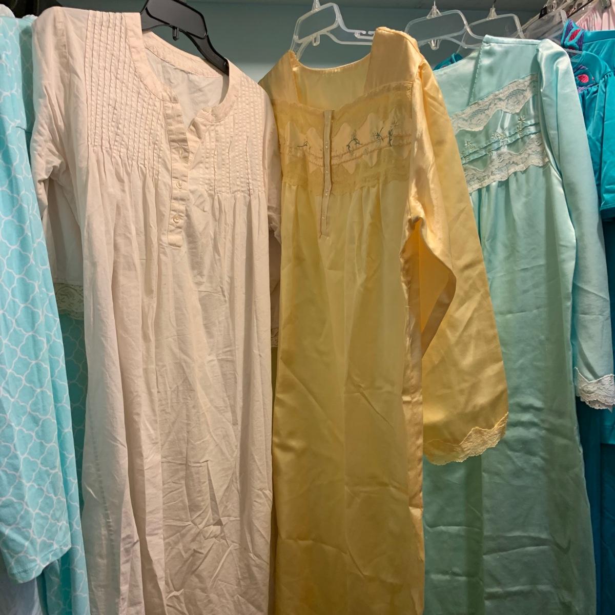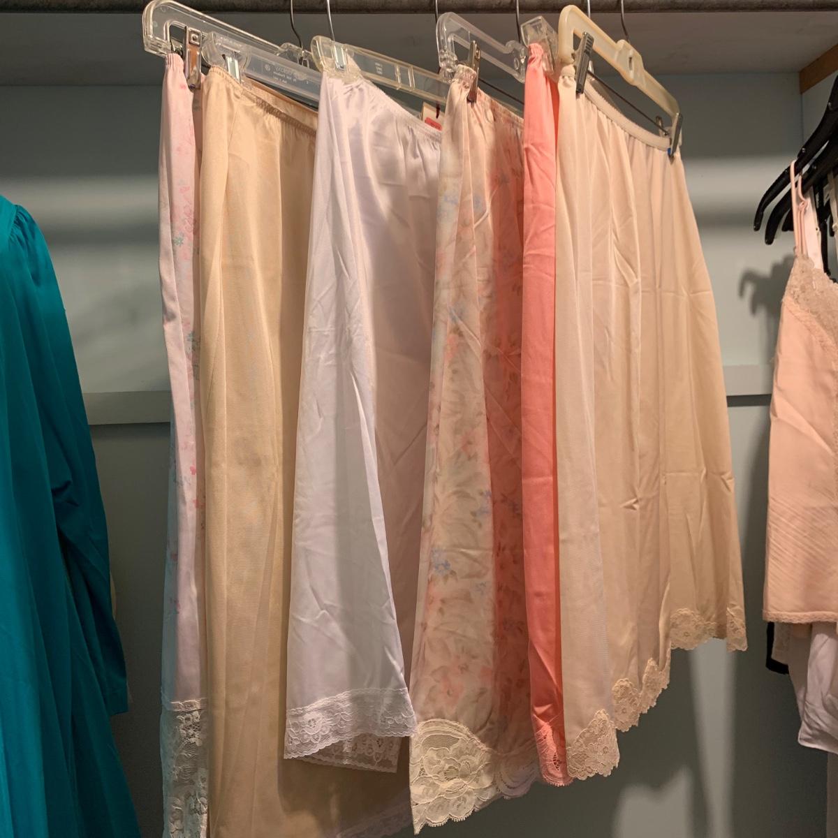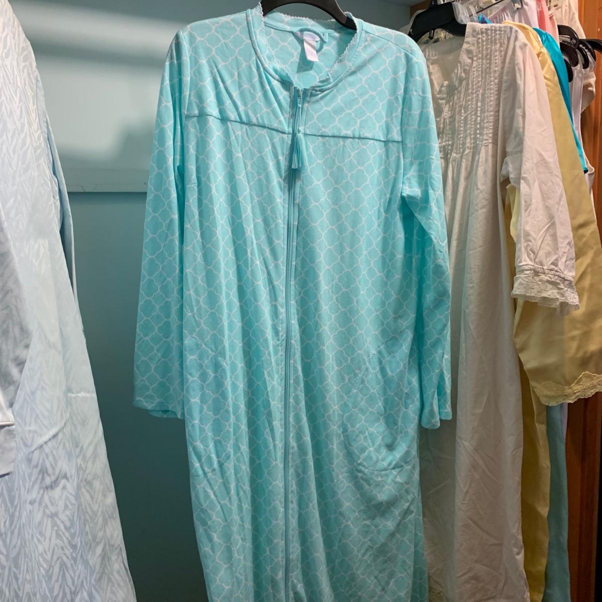 A wonderful quilted robe with a satin feel by Miss Elaine (size L) starts this collection. There are four Miss Elaine nightgowns as well as one PJ set. There’s also a lightweight cotton robe by Adonna plus three long sleeved nightgowns, as well as a matching robe and nightgown set, six slips, and nine camisoles. Five pairs of brand new size L underwear are also included. Most items are size M. Please see pictures for brands and sizes.