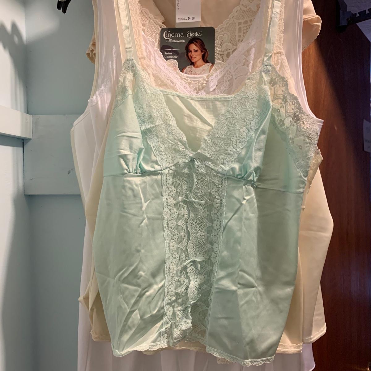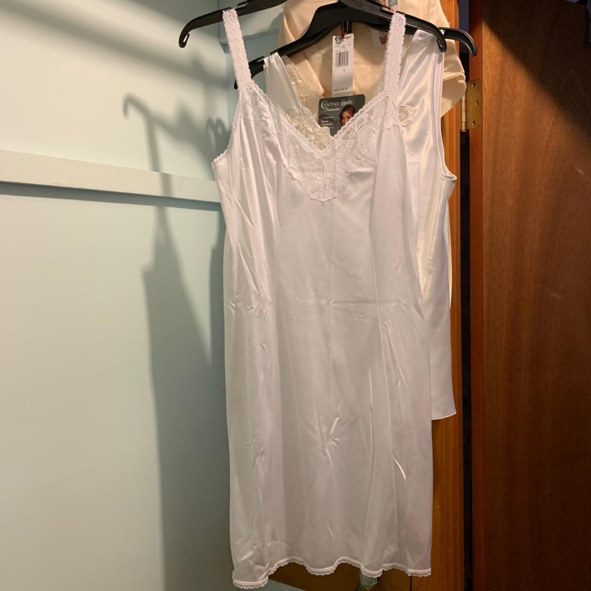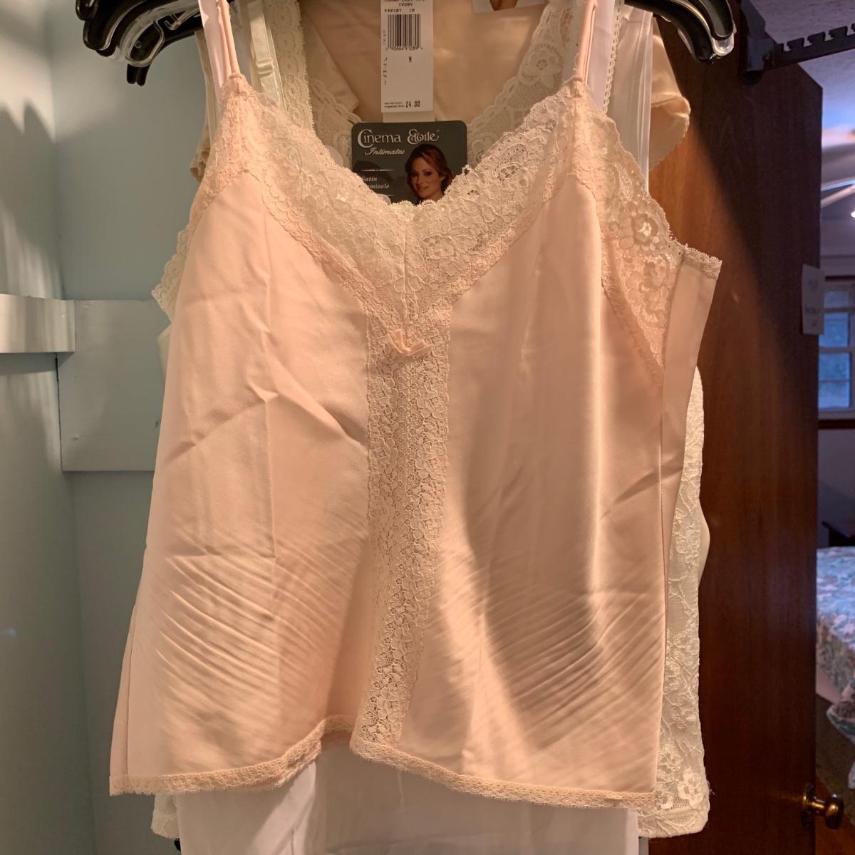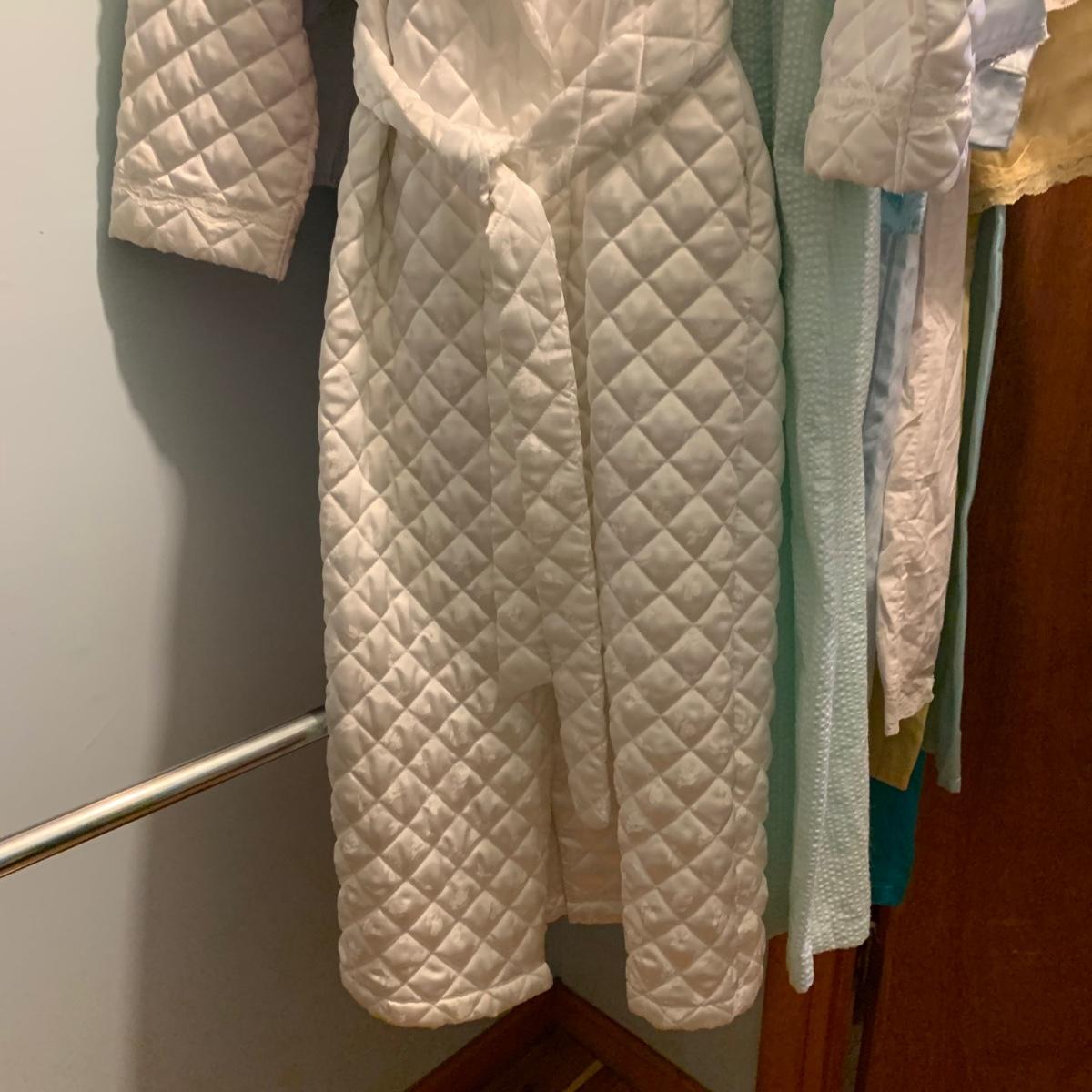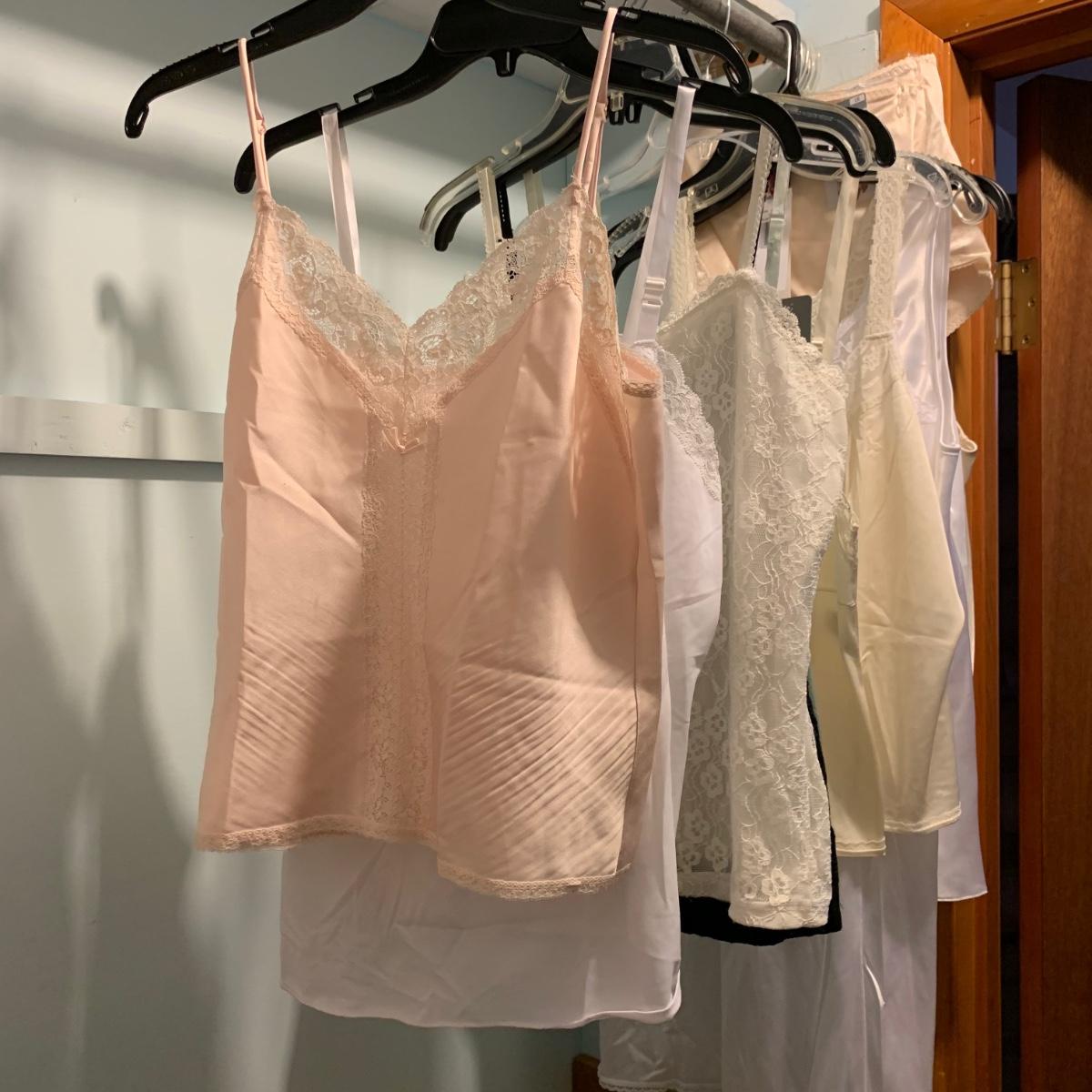 A wonderful quilted robe with a satin feel by Miss Elaine (size L) starts this collection. There are four Miss Elaine nightgowns as well as one PJ set. There’s also a lightweight cotton robe by Adonna plus three long sleeved nightgowns, as well as a matching robe and nightgown set, six slips, and nine camisoles. Five pairs of brand new size L underwear are also included. Most items are size M. Please see pictures for brands and sizes.