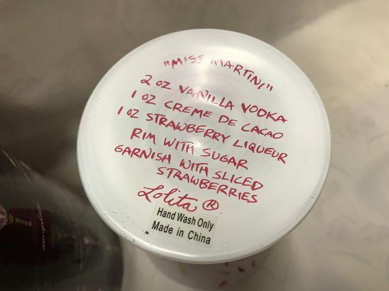 Lolita collectible themed martini glass, with a recipe on the bottom. New in a distinctively packaged signature gift box. All items SOLD AS IS, AS SHOWN and subject to reserve bid. Unsold items will be relisted. Pick-Up only on Wednesday May 29th between 5-7 PM. Please read Shipping Terms