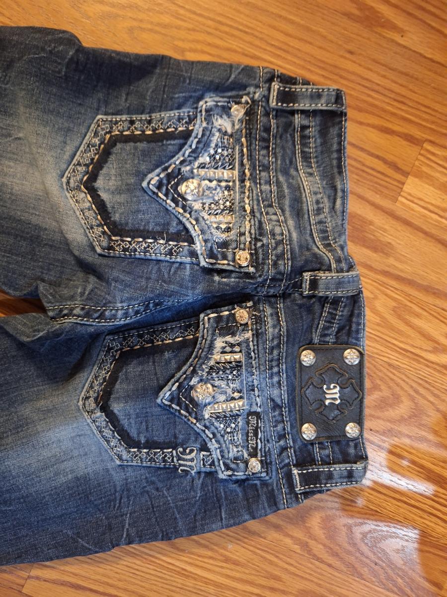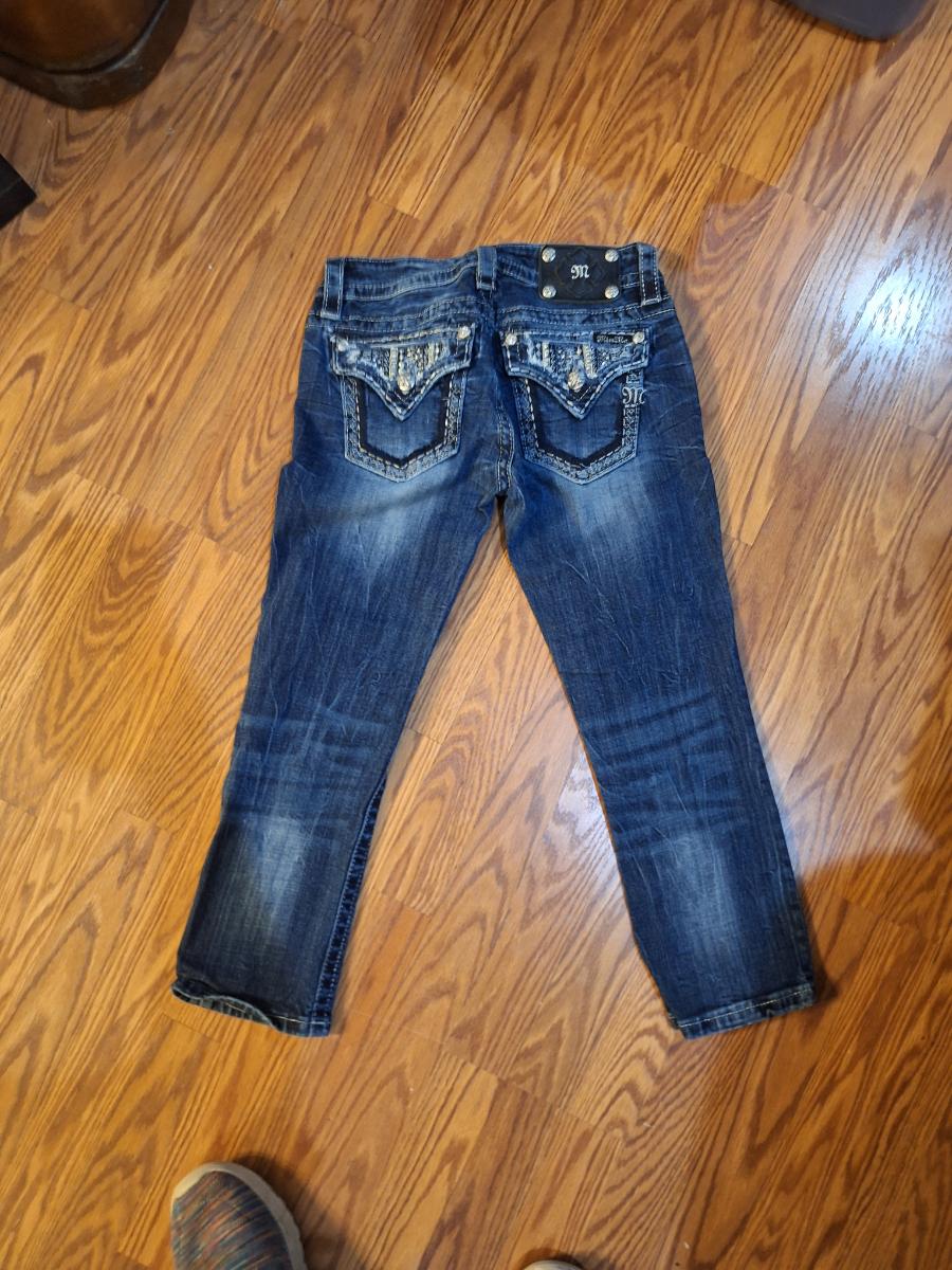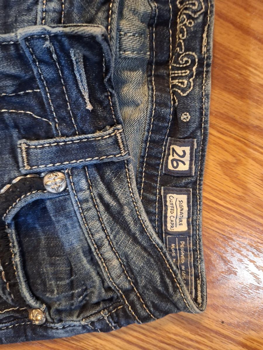 Miss Me Signature women's blue denim capri jeans with flap pockets and rhinestone embellishments size 26