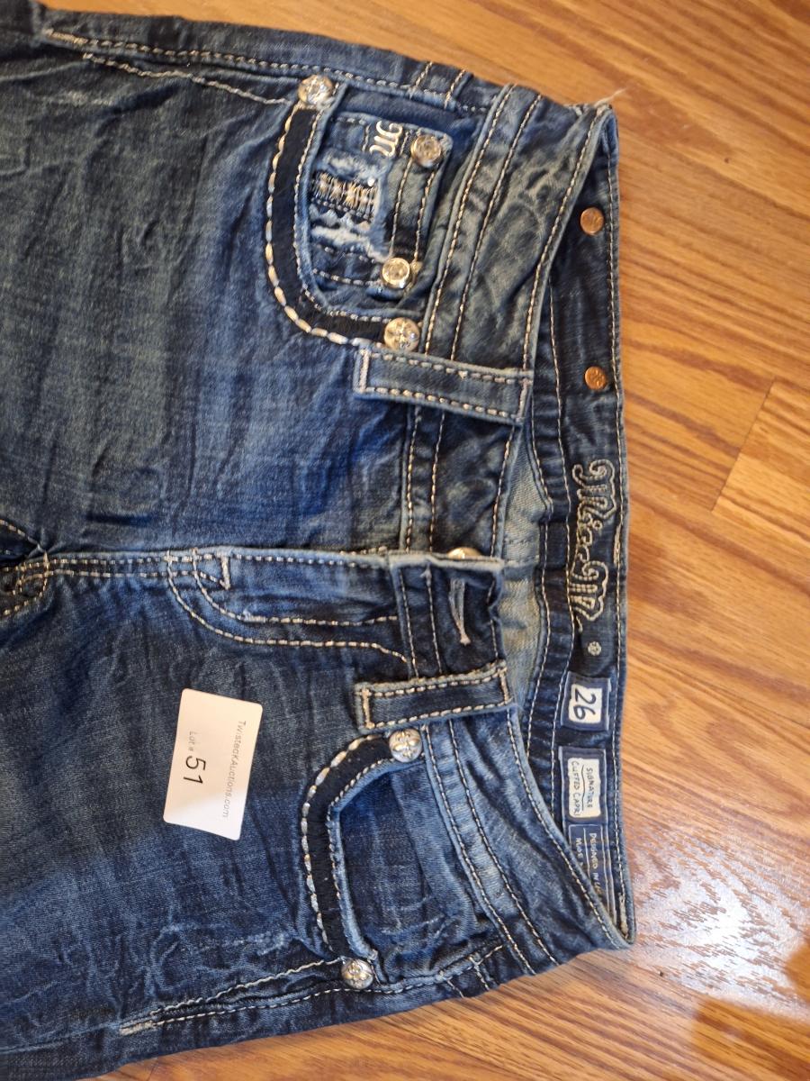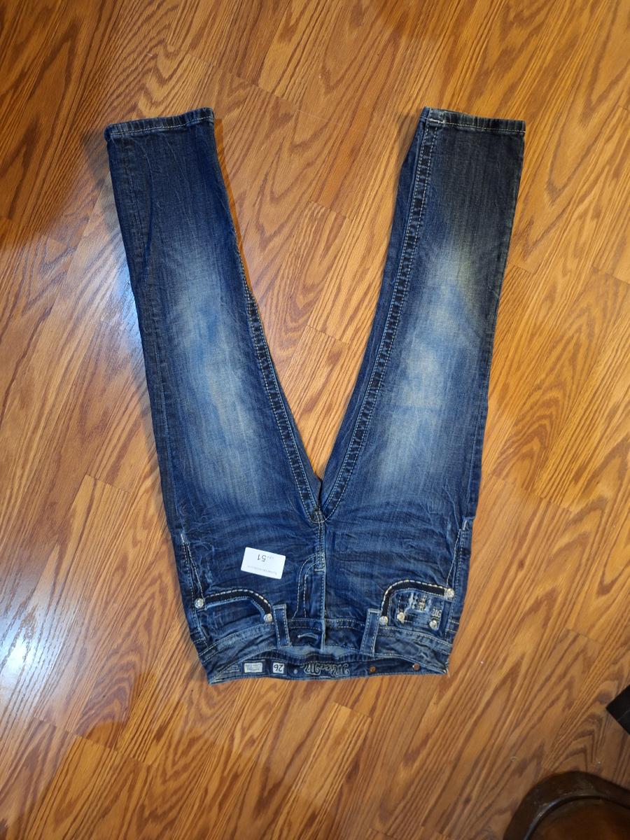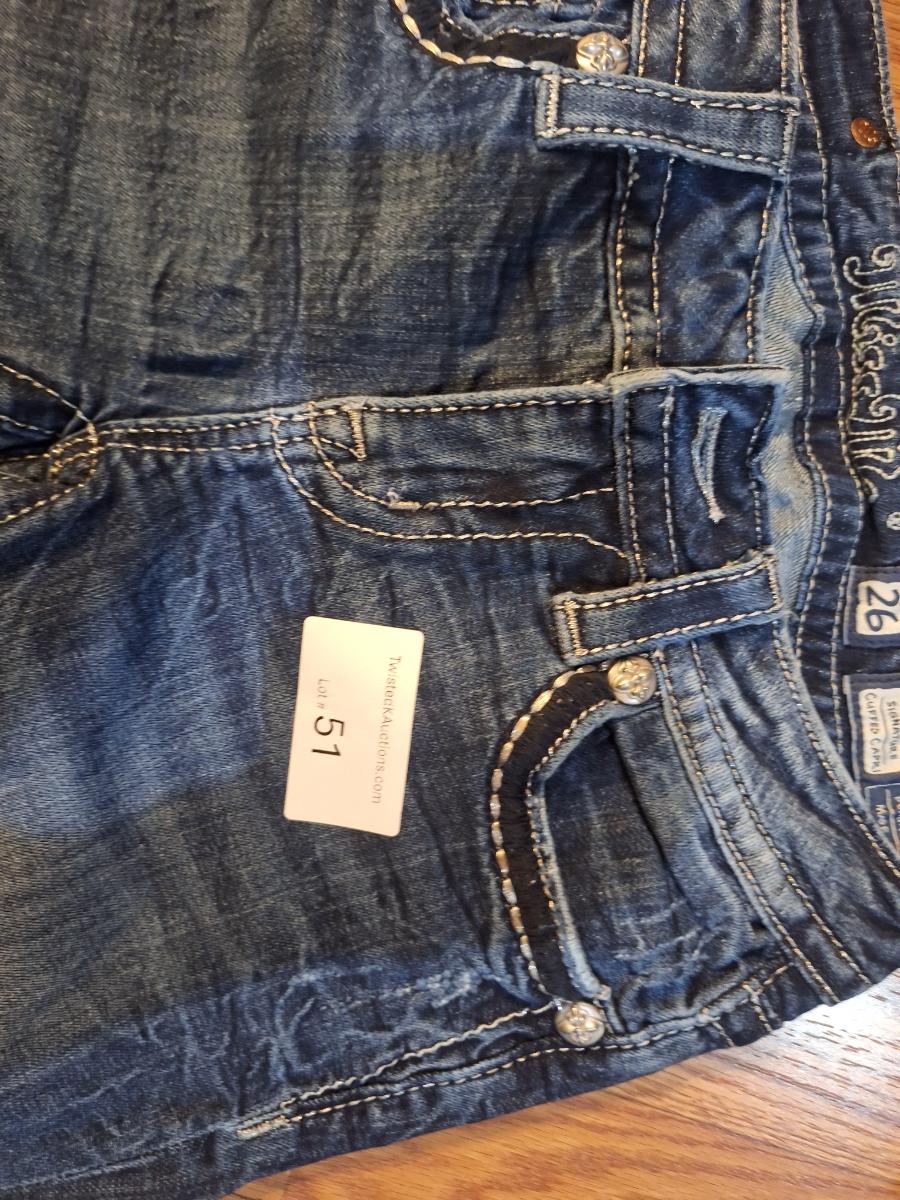 Miss Me Signature women's blue denim capri jeans with flap pockets and rhinestone embellishments size 26