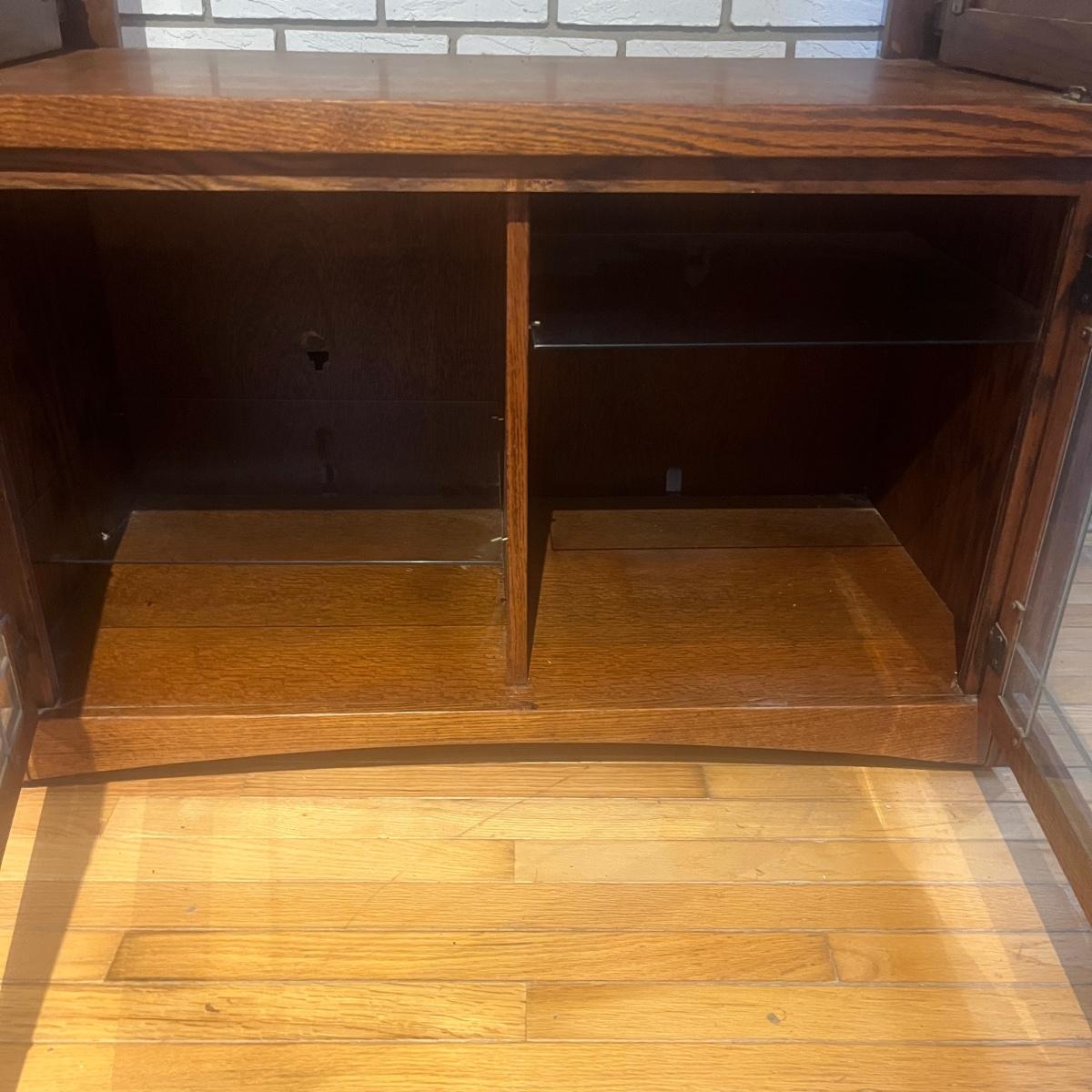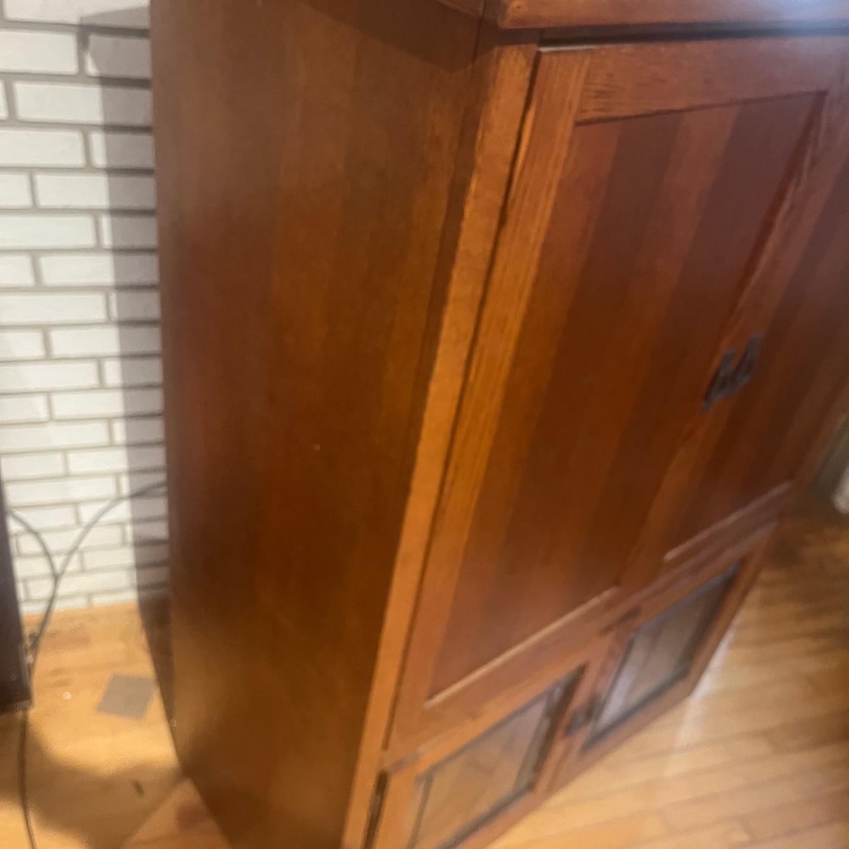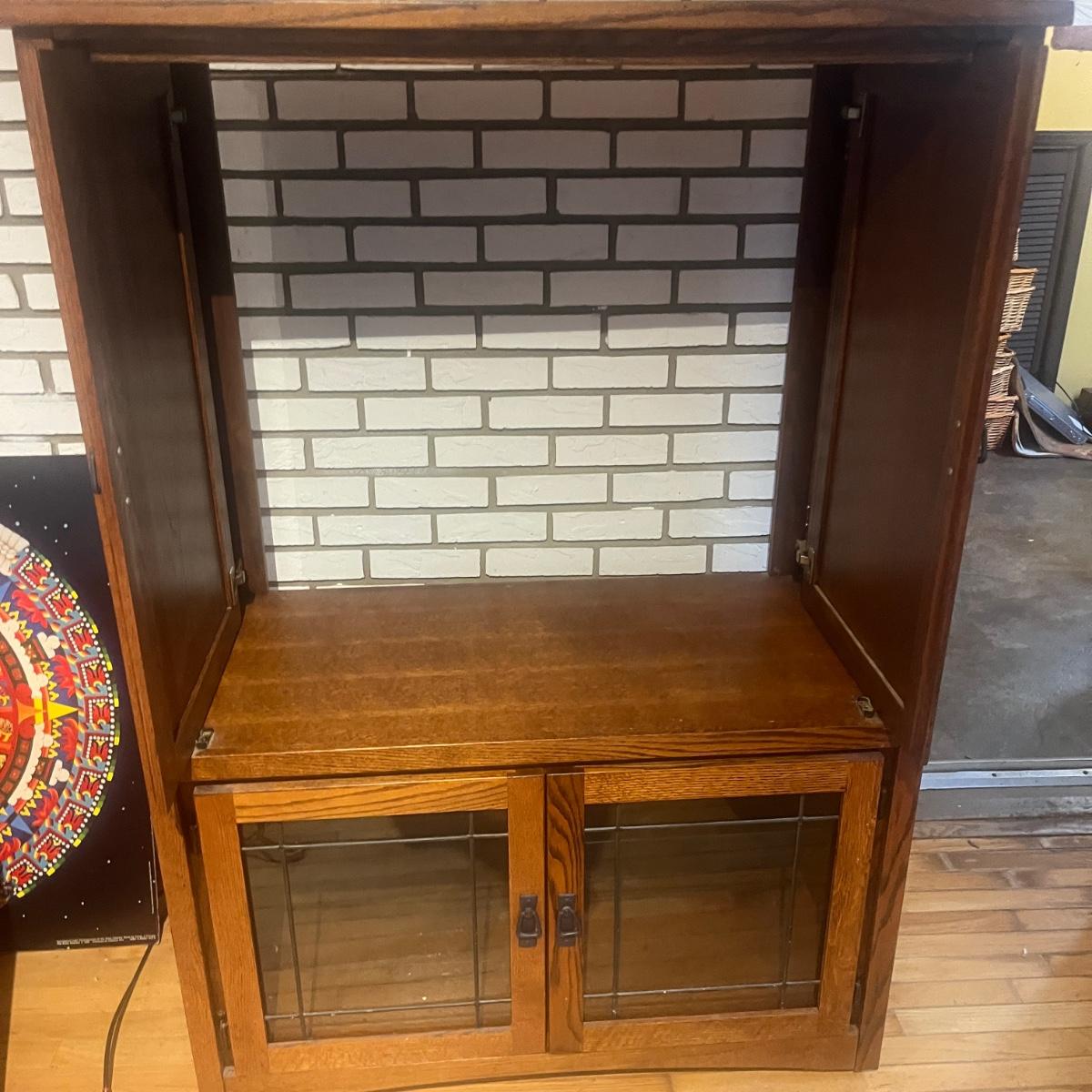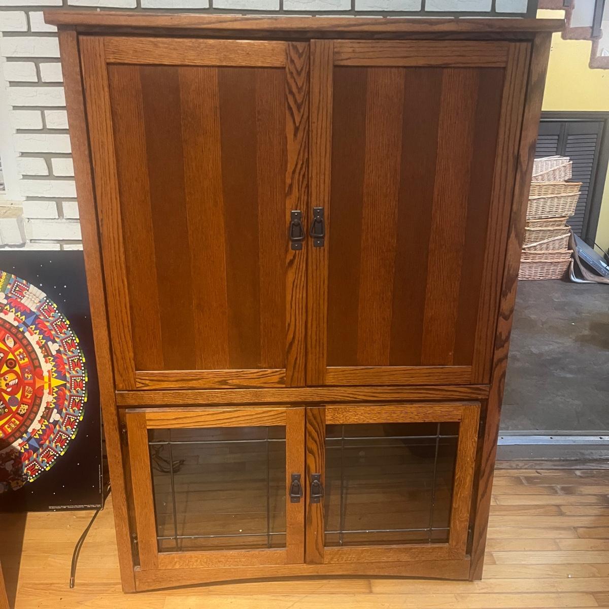 Lot includes a wooden armoire with hideaway doors and a cabinet underneath with glass and wood doors with two adjustable glass shelves. Piece measures 43” x 21” x 60”H.