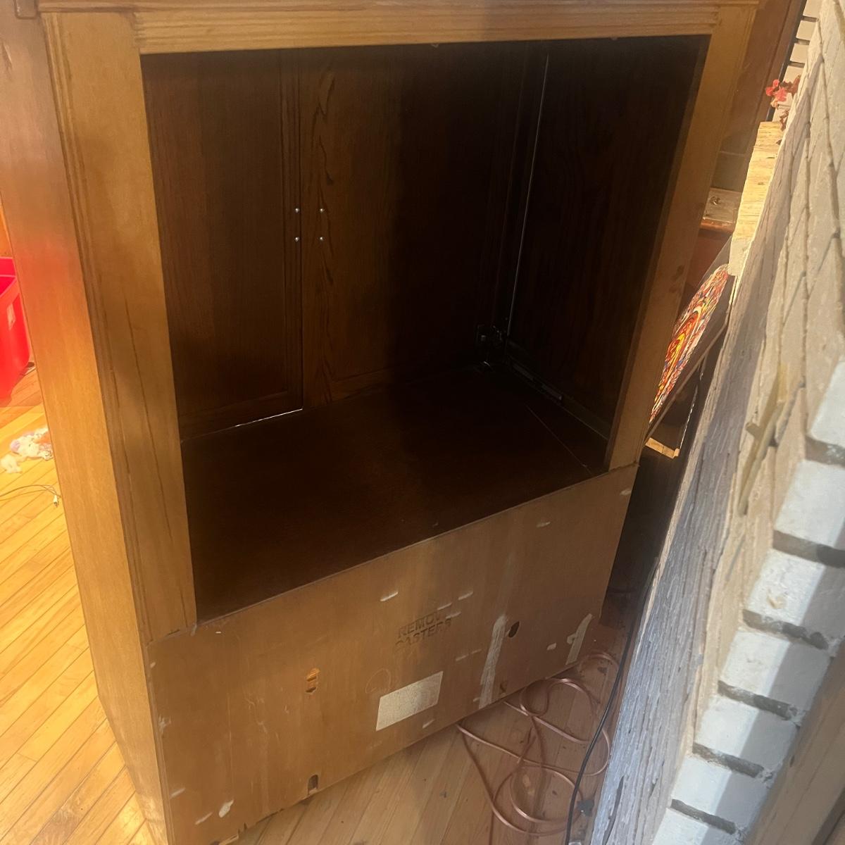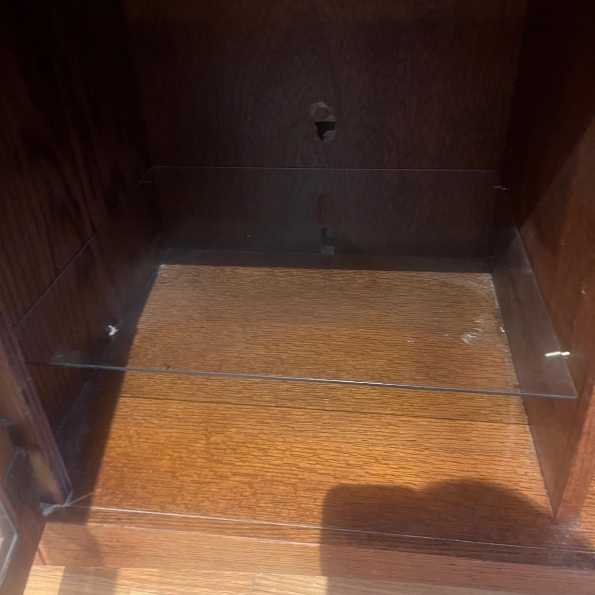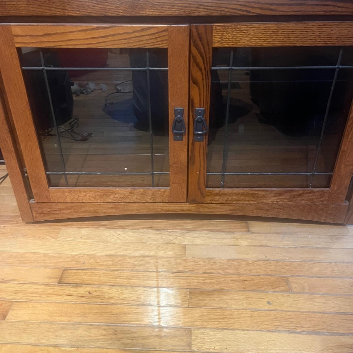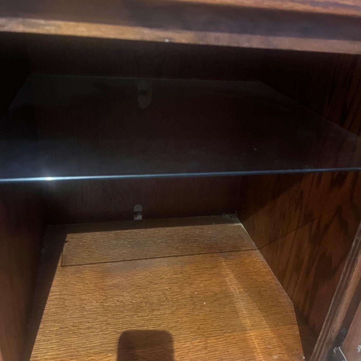 Lot includes a wooden armoire with hideaway doors and a cabinet underneath with glass and wood doors with two adjustable glass shelves. Piece measures 43” x 21” x 60”H.