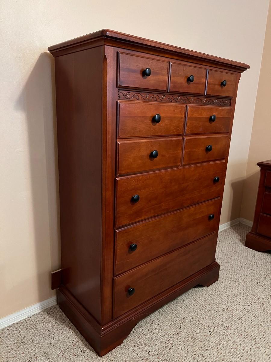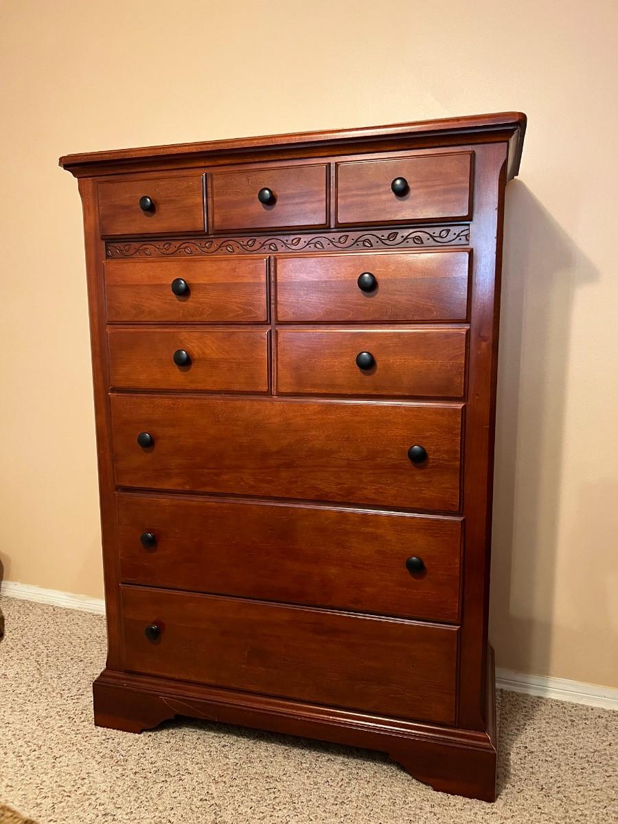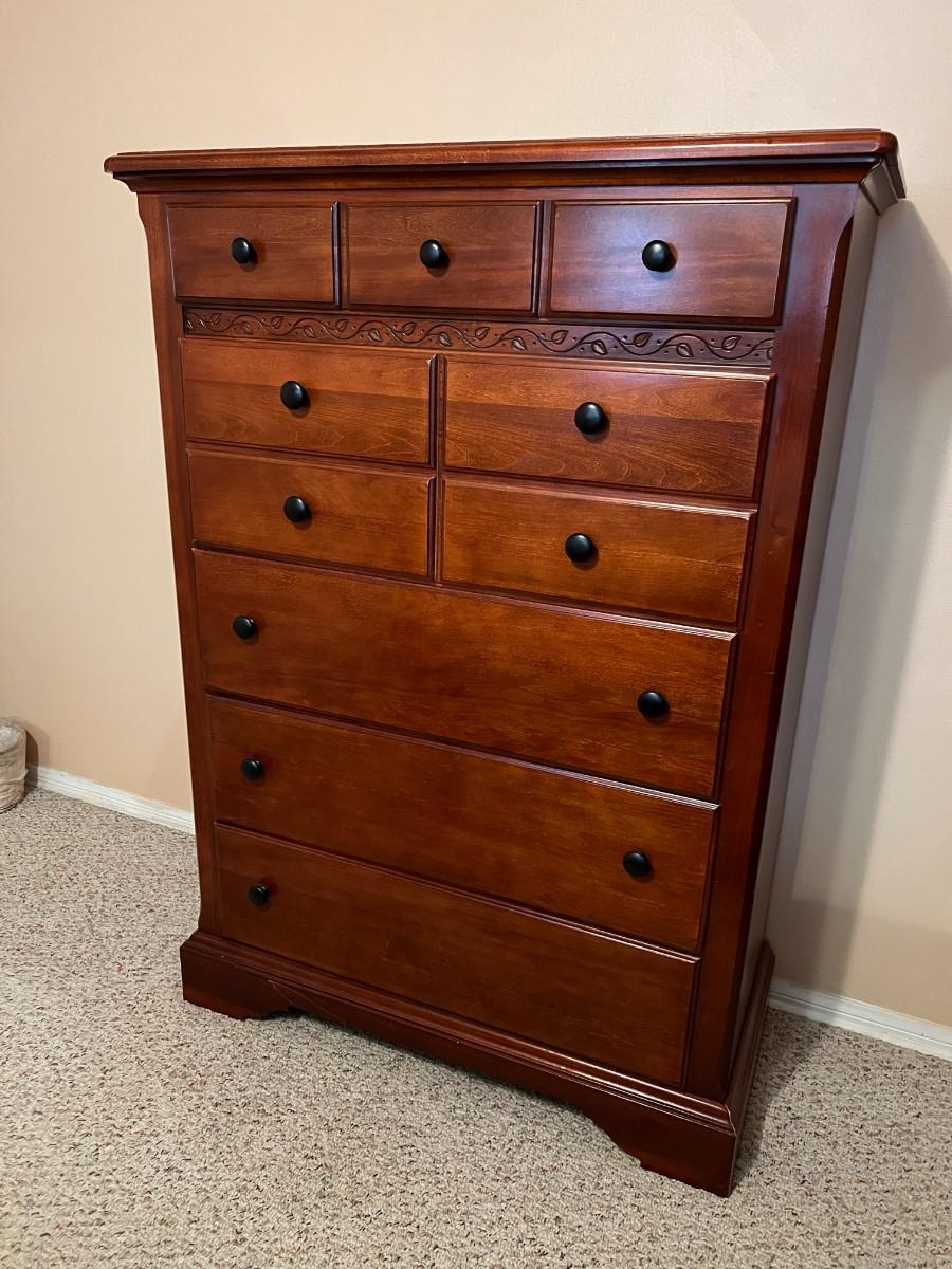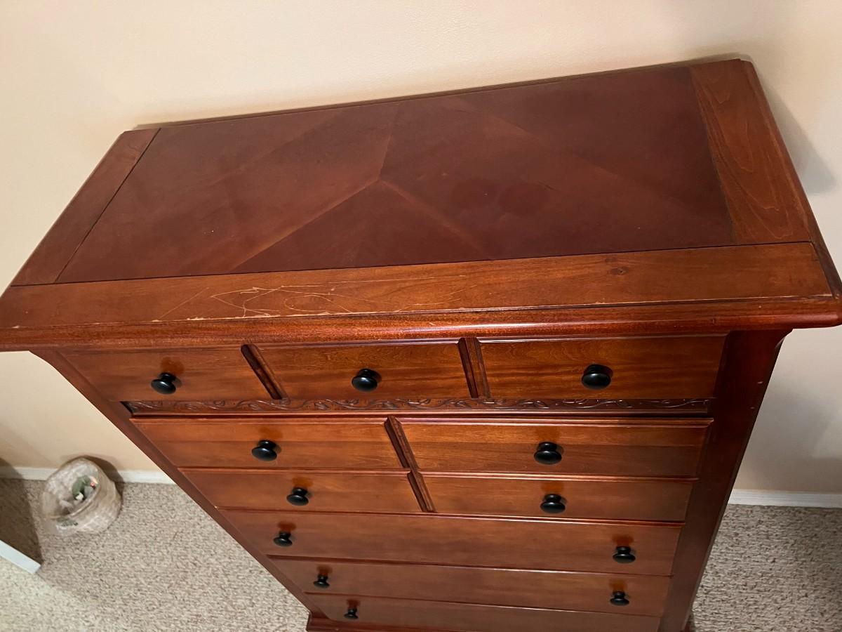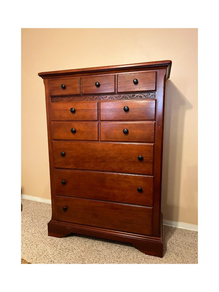 Mission Style 5 Drawer Tallboy Dresser. In good used condition. The bottom drawer is missing a knob but that is an simple fix, knobs are common style. Some surface scratches, nothing bad. About 55" tall.