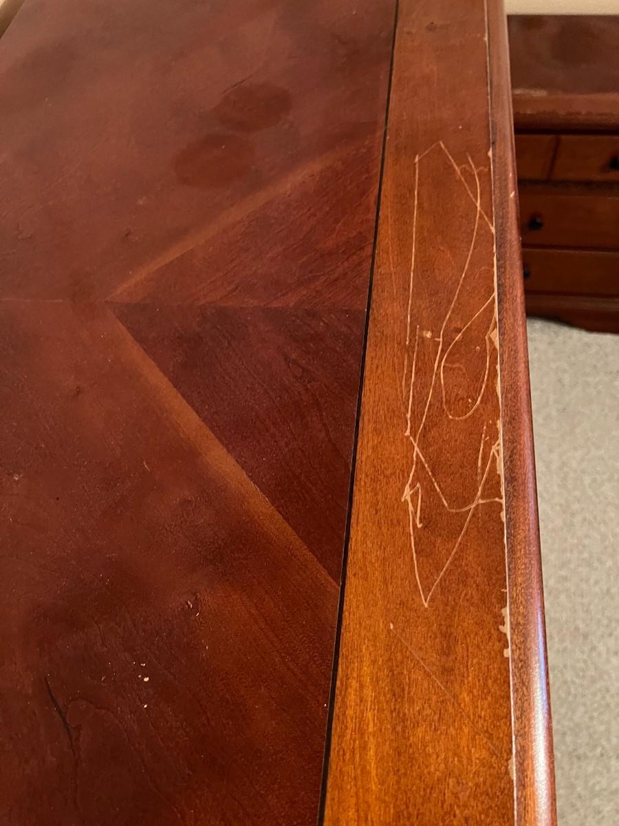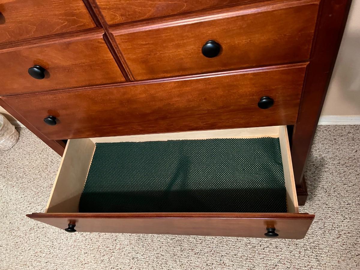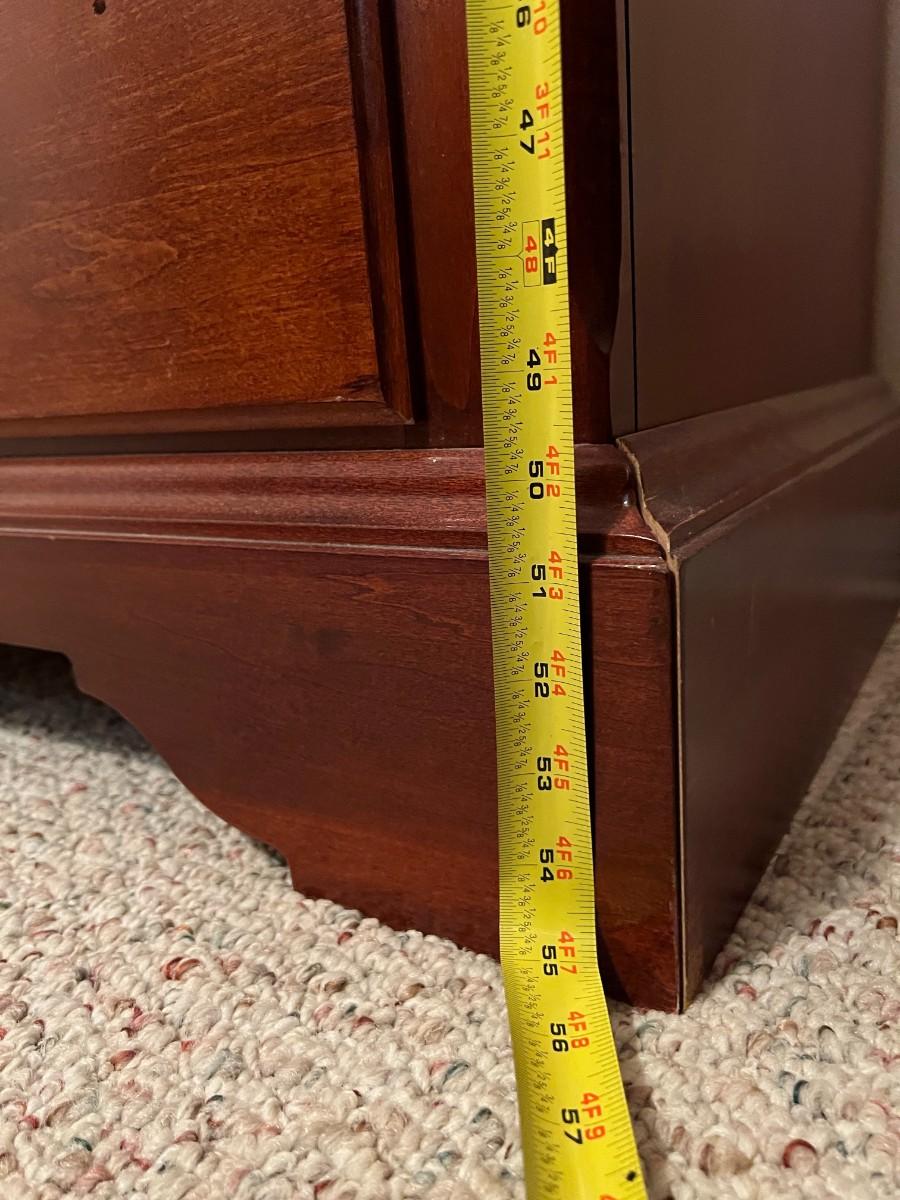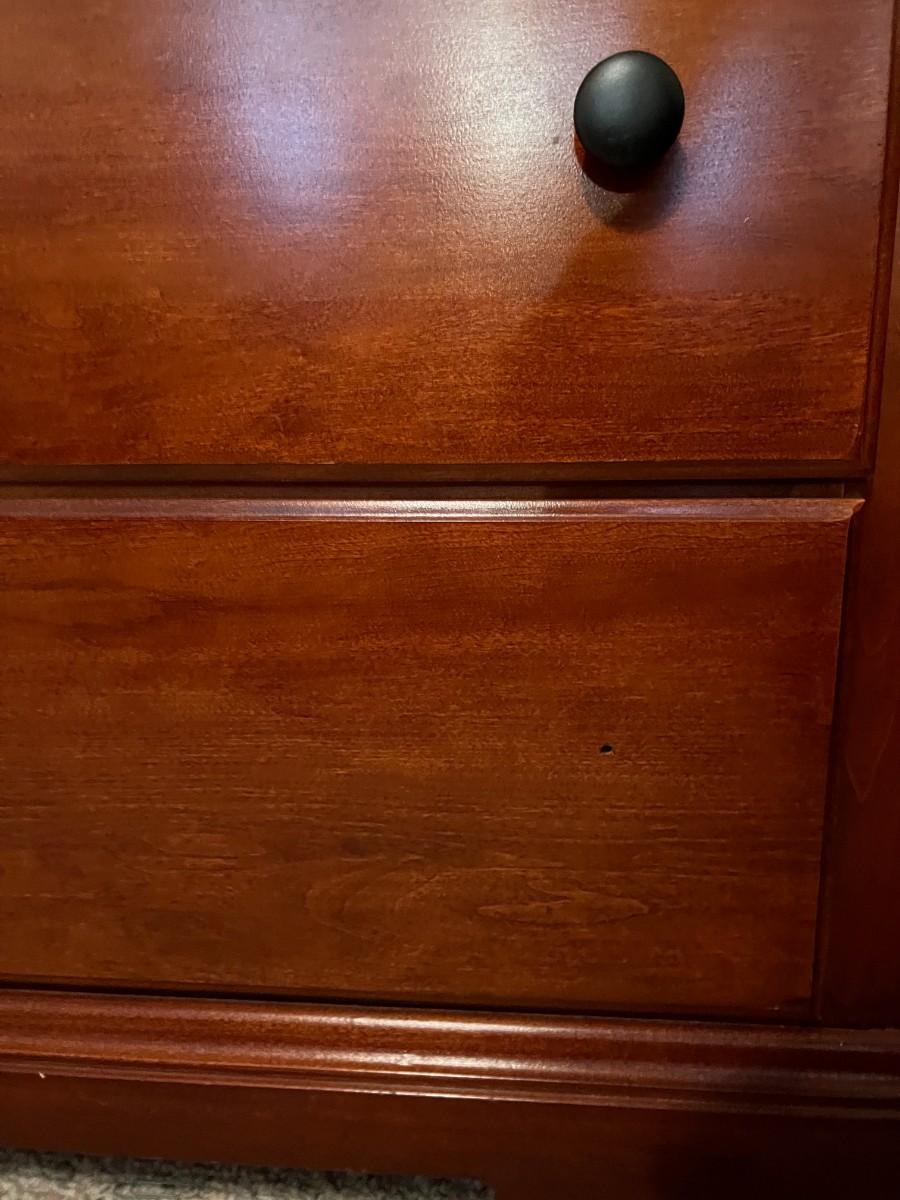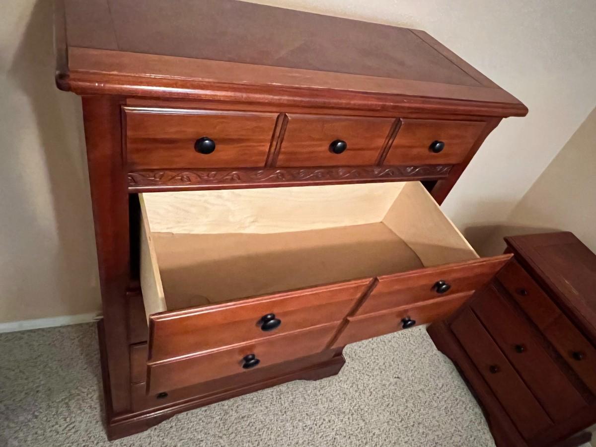 Mission Style 5 Drawer Tallboy Dresser. In good used condition. The bottom drawer is missing a knob but that is an simple fix, knobs are common style. Some surface scratches, nothing bad. About 55" tall.