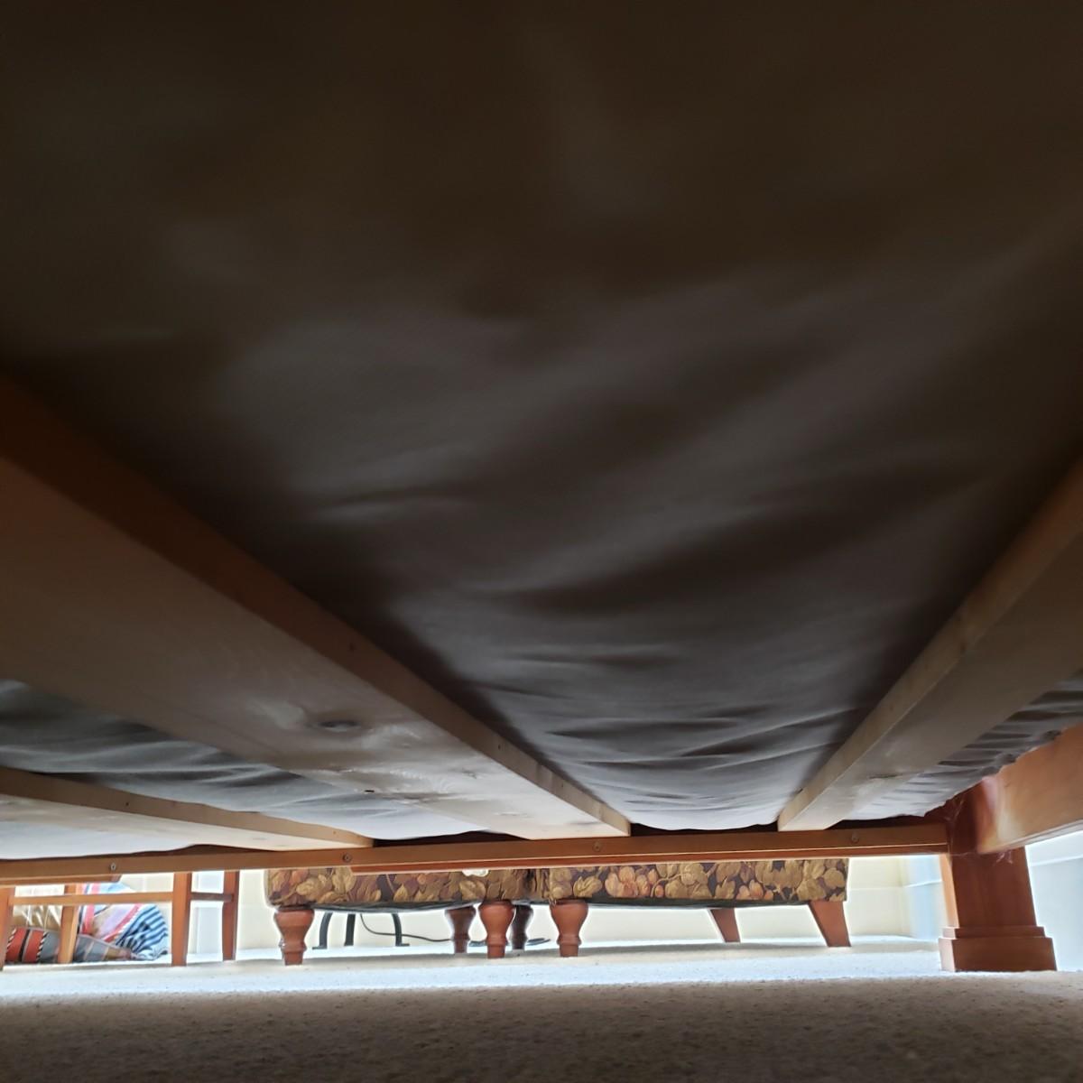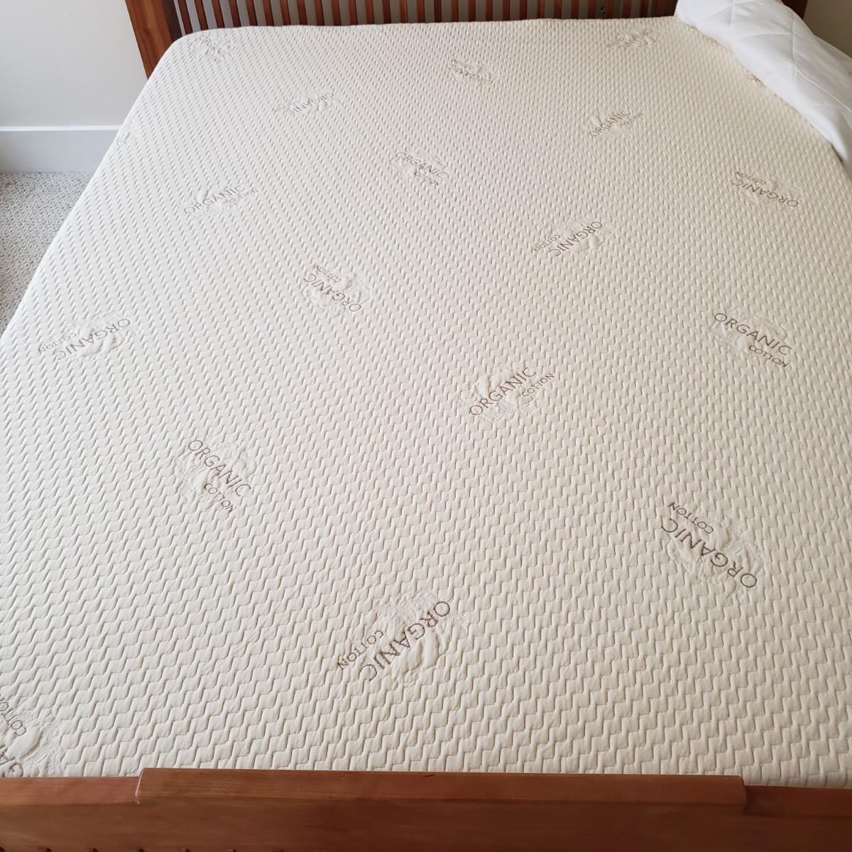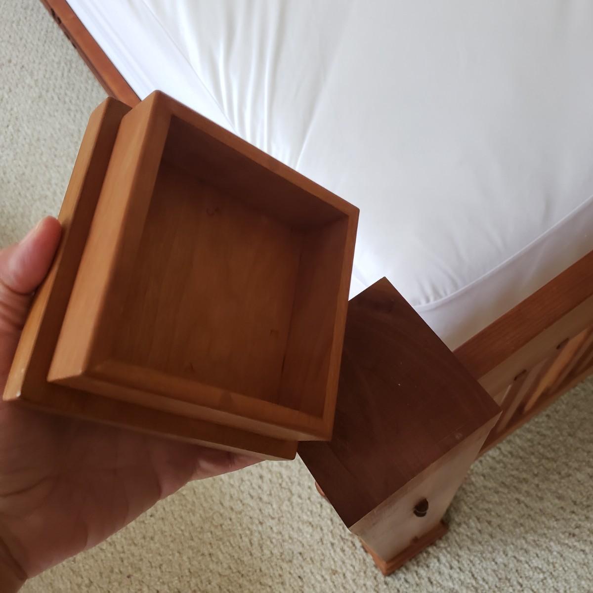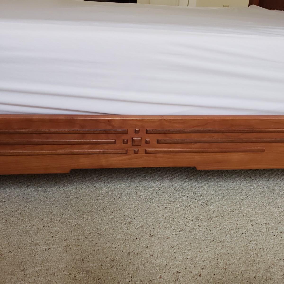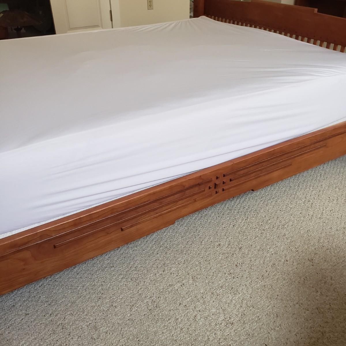 This queen-sized mission style bed frame is absolutely gorgeous. Pictures do not do it justice. The handcrafted little touches make this bed special. The bed rails come out without tools, although a rubber mallet would help dislodge the hooks. The bed is lower to the ground with the mattress being 21" from the floor. The frame measures 87" x 69" x 39"H at the headboard. The mattress is available to the winning bidder if desired, but the winning bidder is not required to take it. The mattress is on the firm side and is organic cotton by Lebeda Beds.