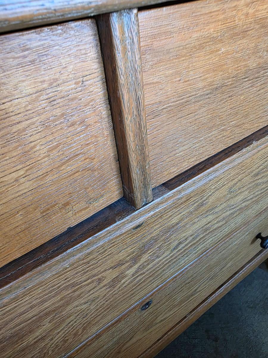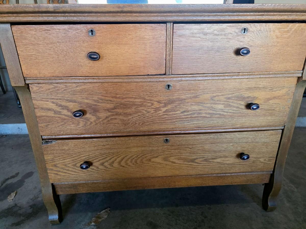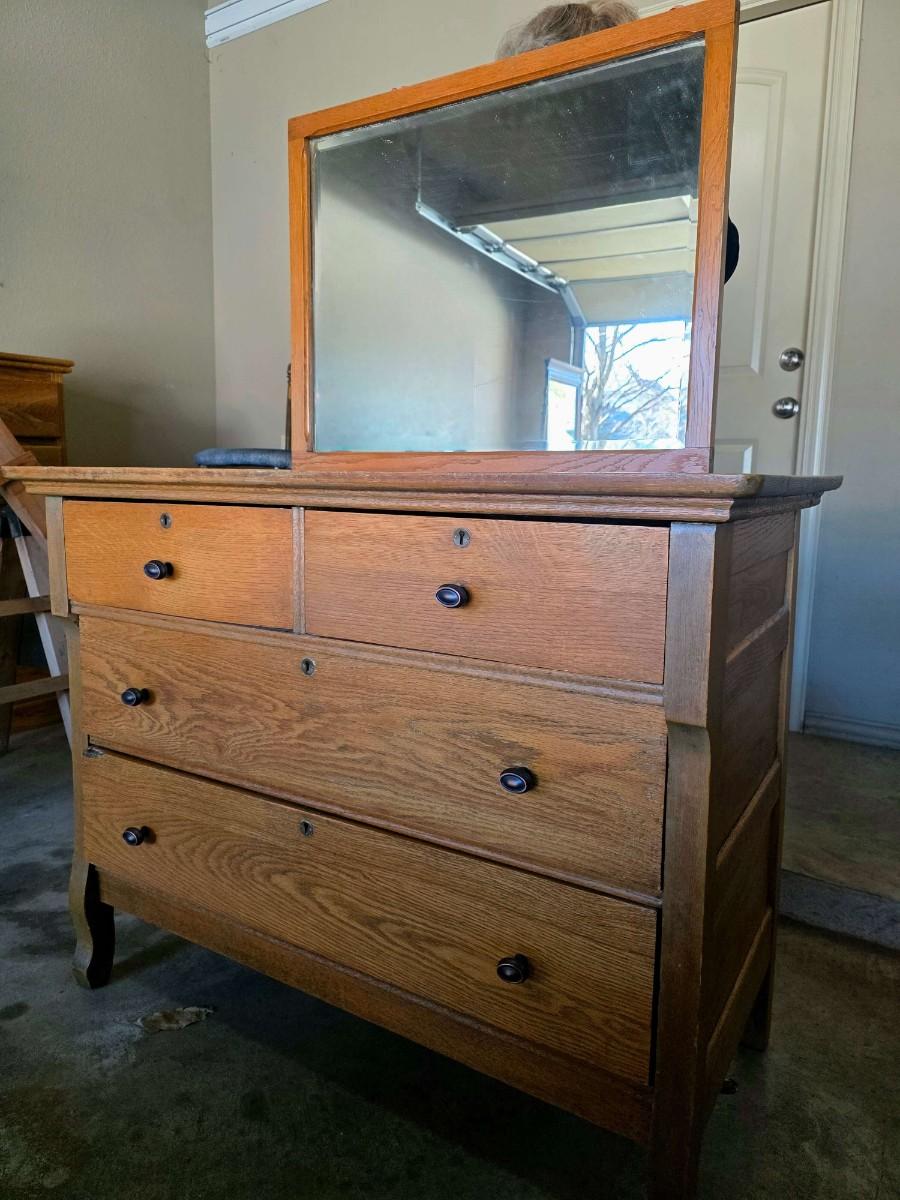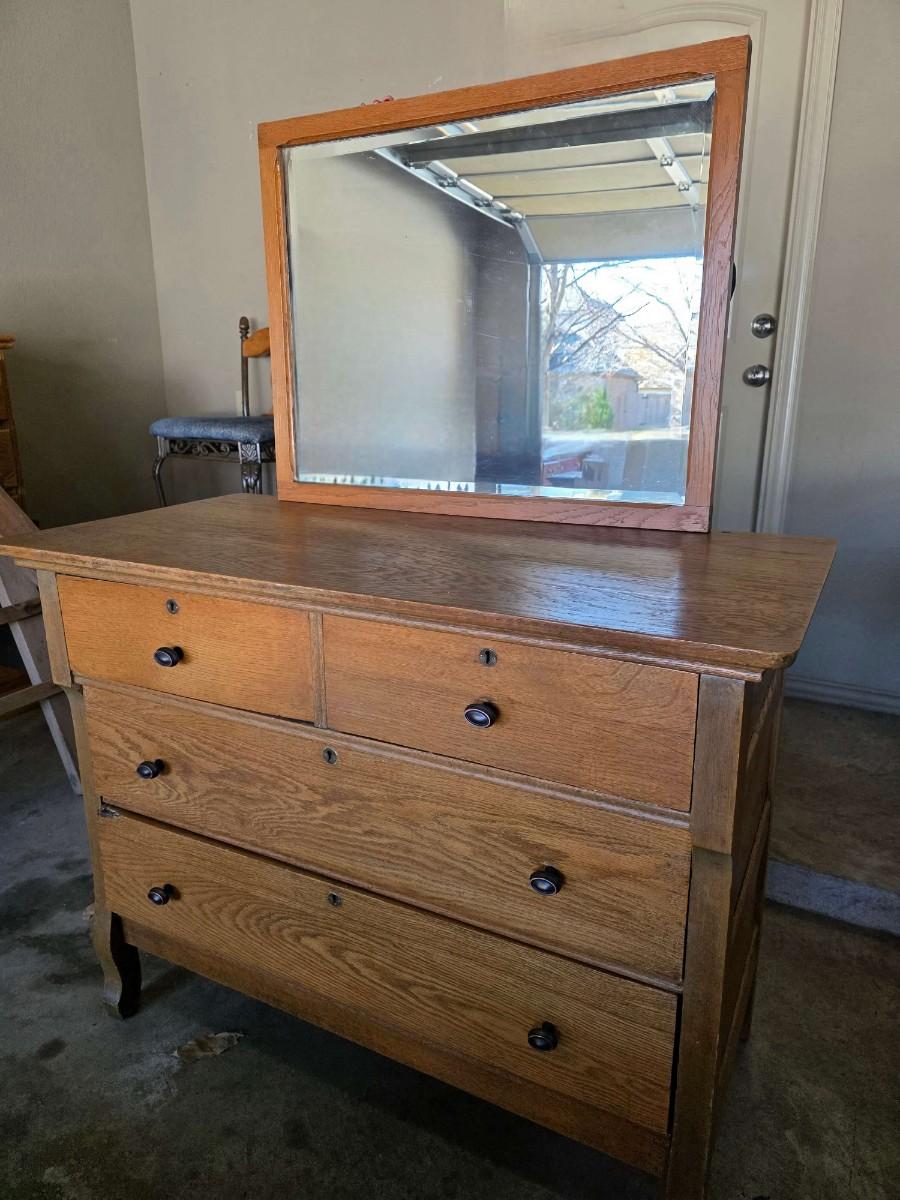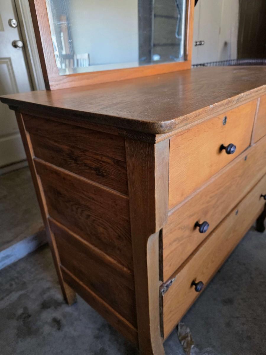 Vintage Mission Style Dresser with Mirror with 4 drawers. Top 2 drawers don't always line up. Mirror in very good condition relative to its age.