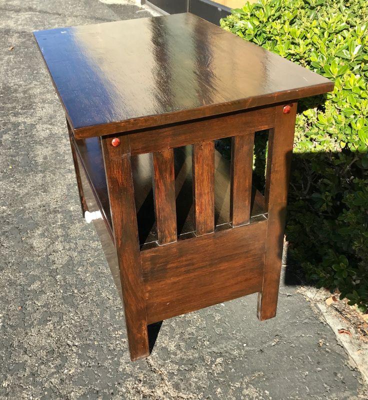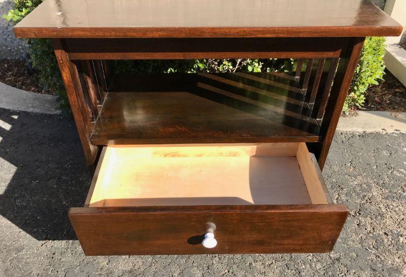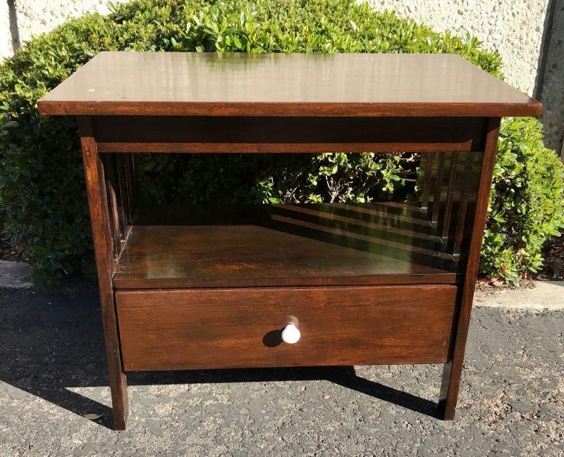 Mission style wood end table. Single drawer along with storage space under surface. Medium dark finish. Measures 24hx28wx18d. In good condition some signs of everyday use.