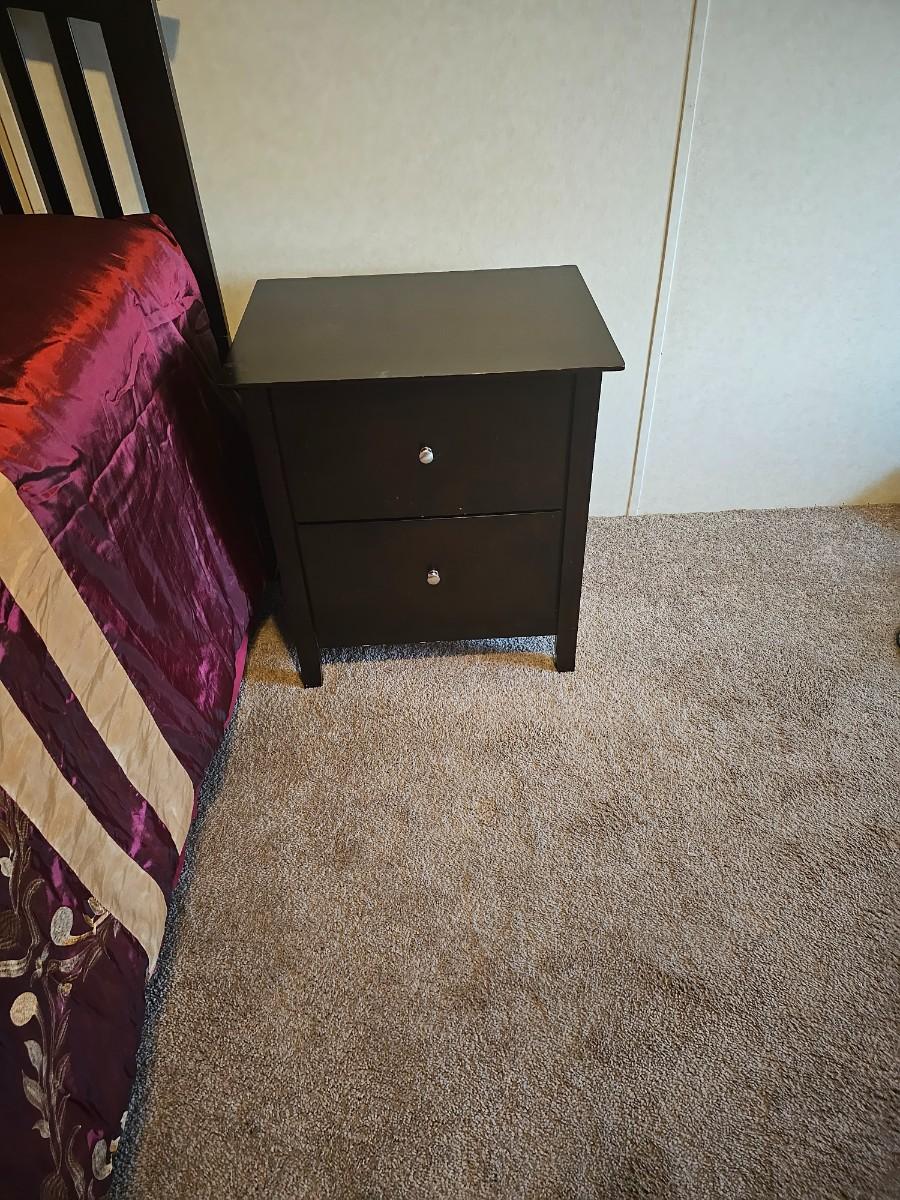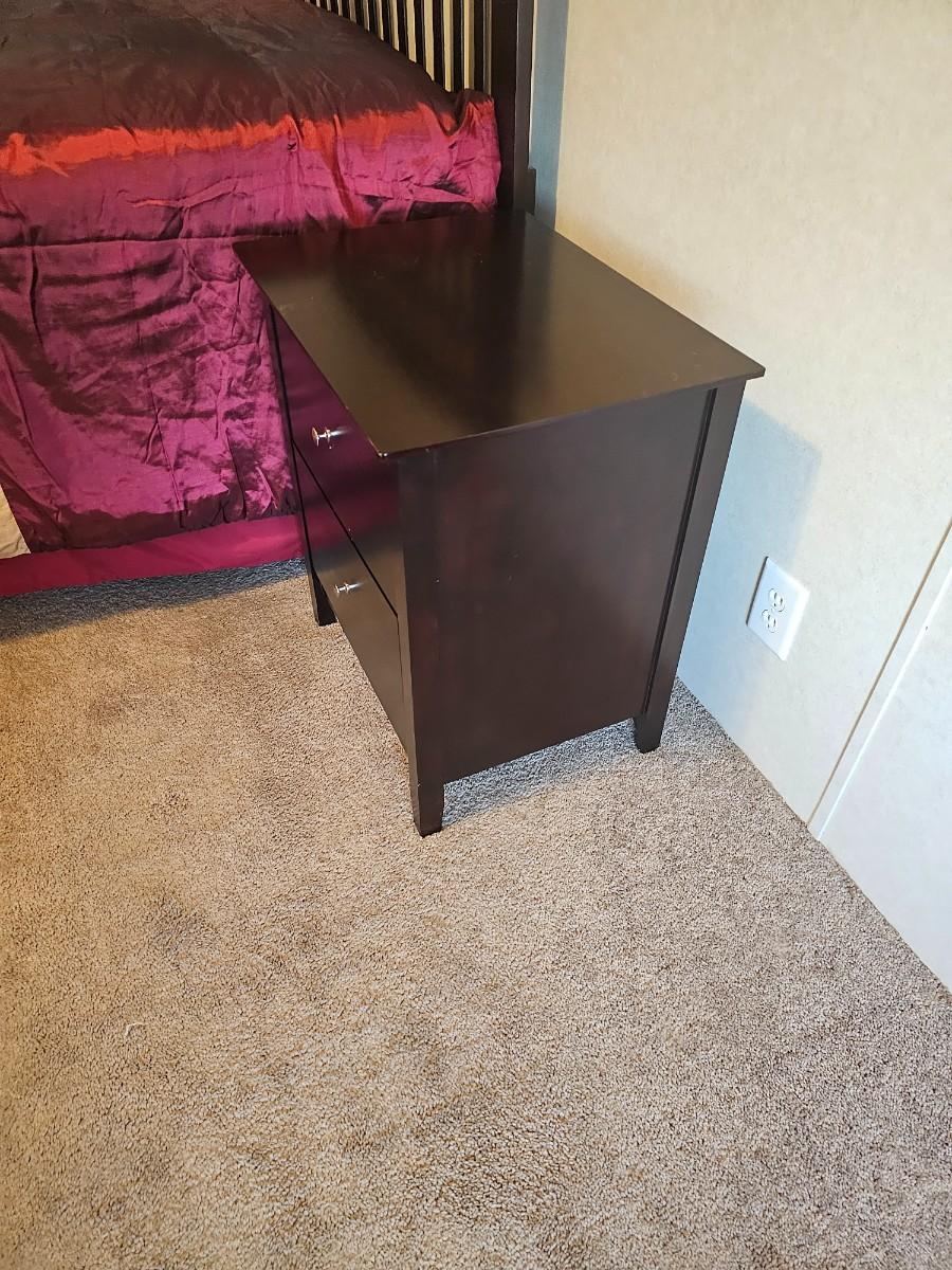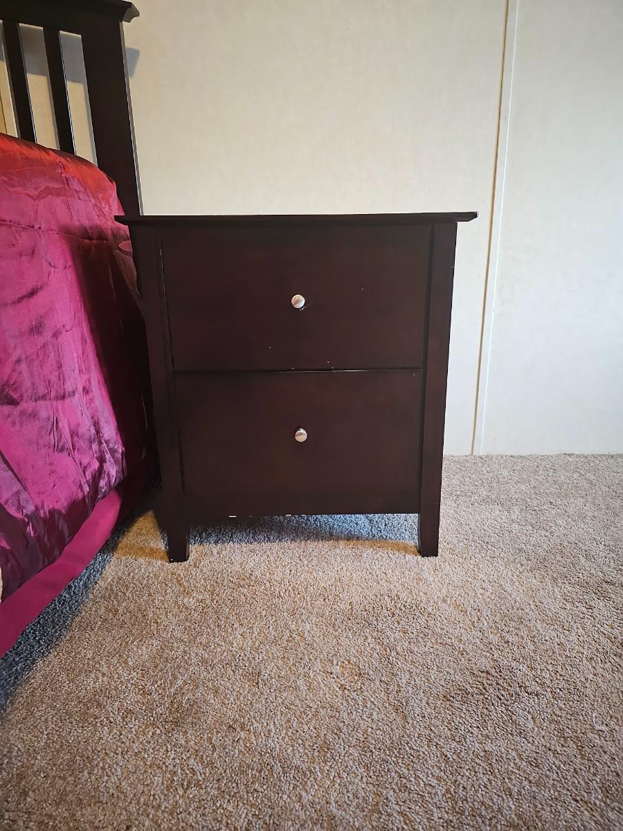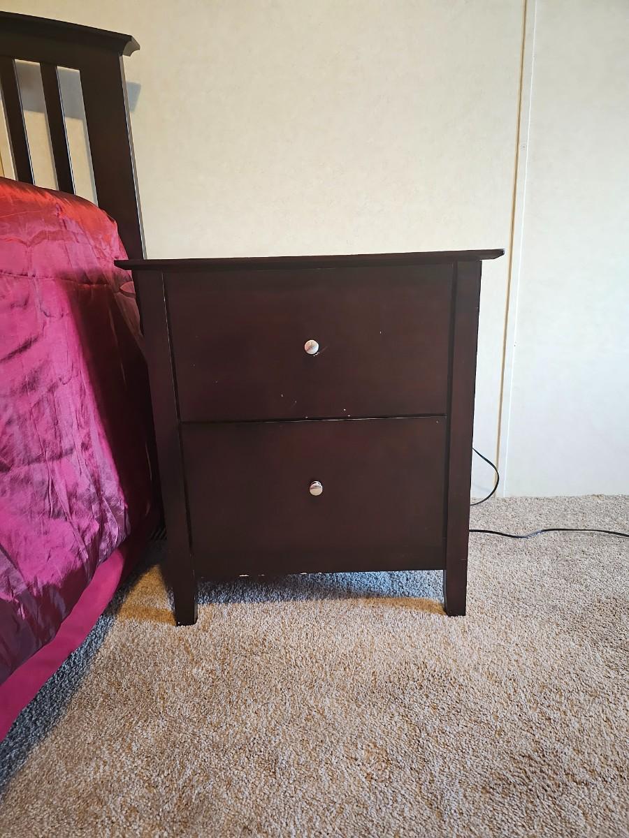 2-drawer mission style nightstand, gentle curves, tapered feet, crafted from tropical wood and okume veneer, cappuccino finish, brushed nickel finish metal knobs, drawers built with dovetail construction and kenlin extension drawer suspension, 24x18x27H.