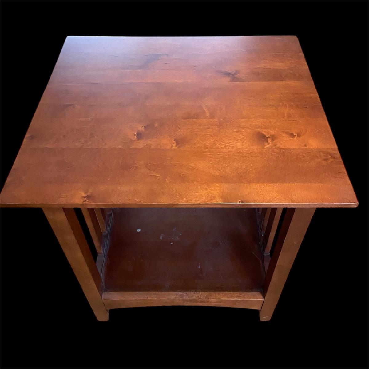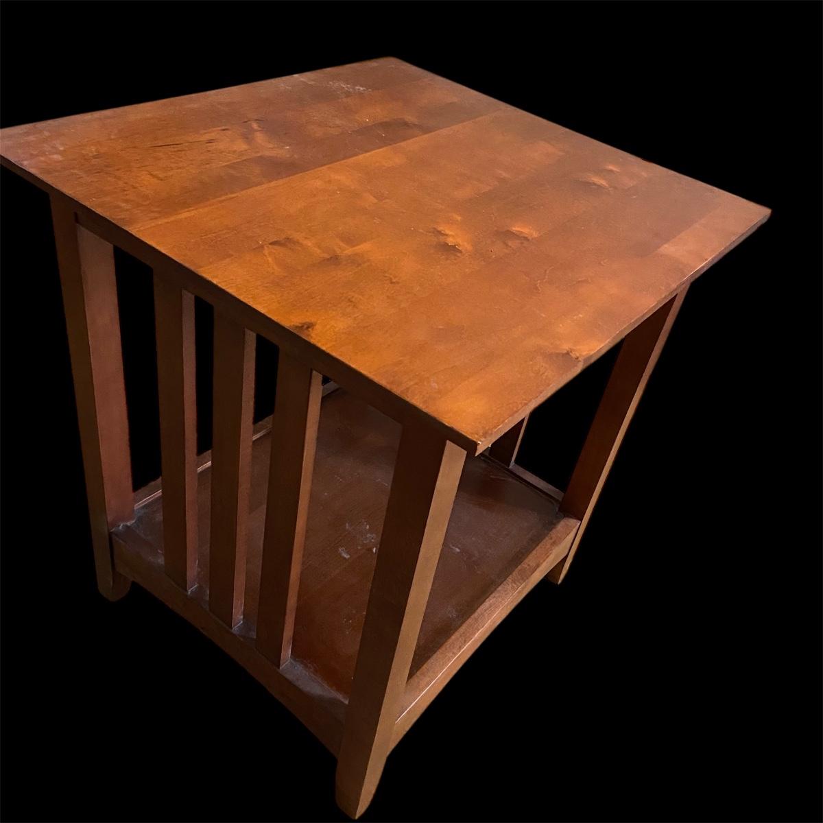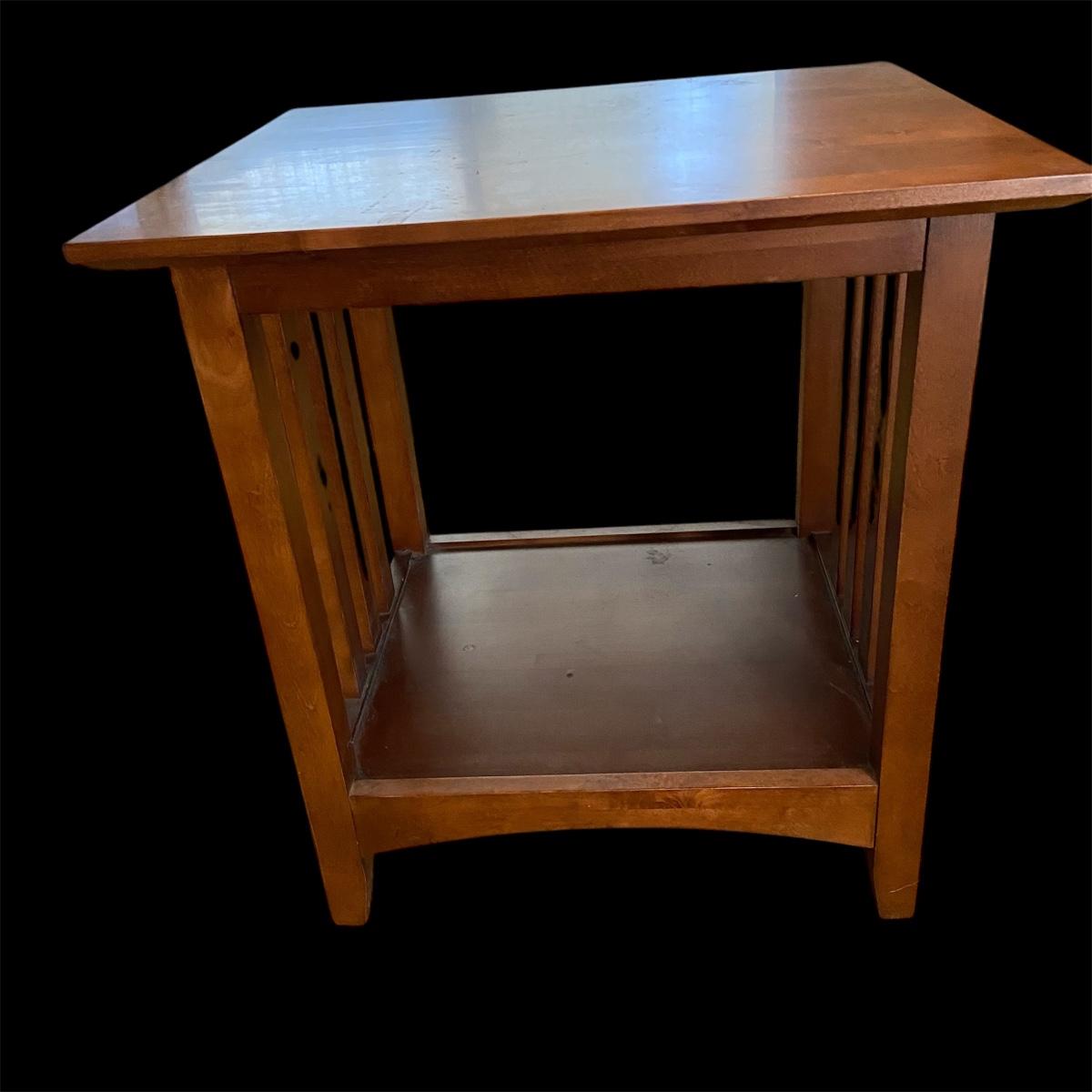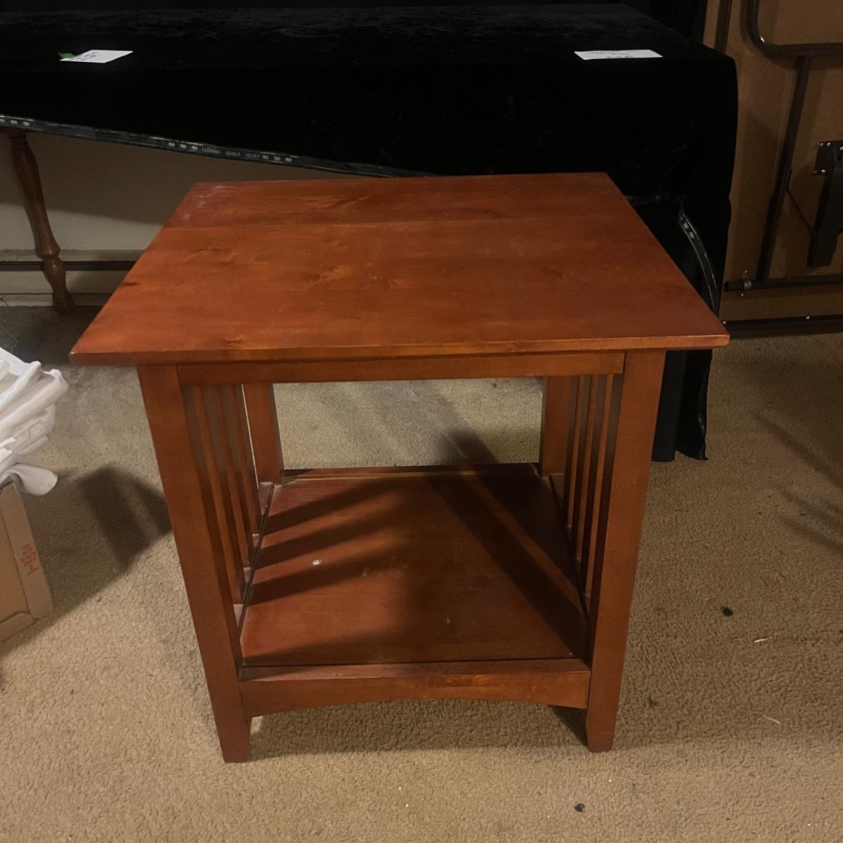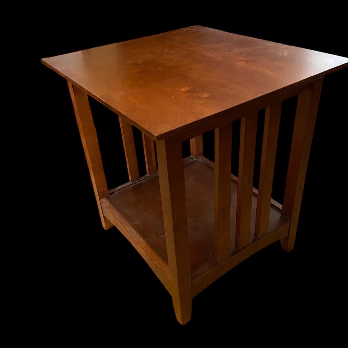 This lot is a wooden mission style side table. This table measures 24” x 22” x 25.5”H. This table aside from being a bit dusty is in good condition and sturdy. Local pick up only.