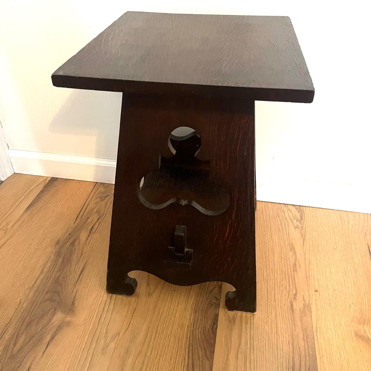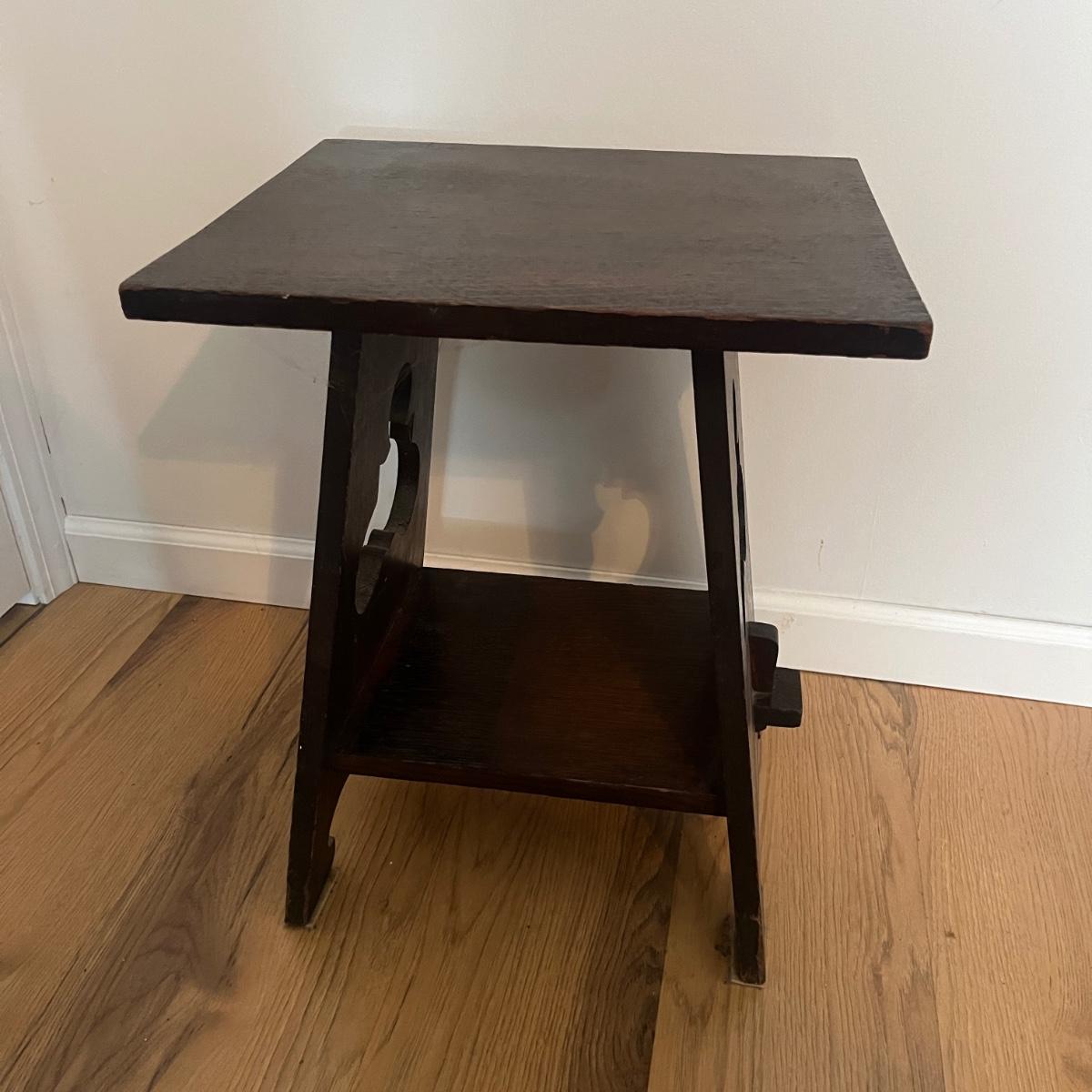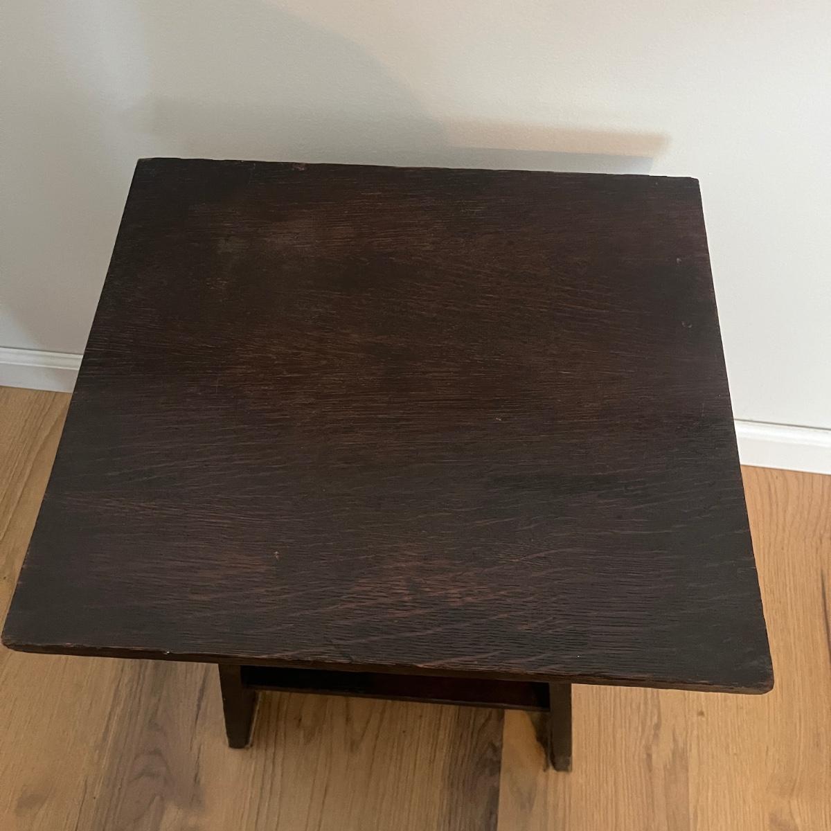 This wooden mission style table measures 14” x 16” x 20”H. Tables a few scratches and nicks, see pictures.