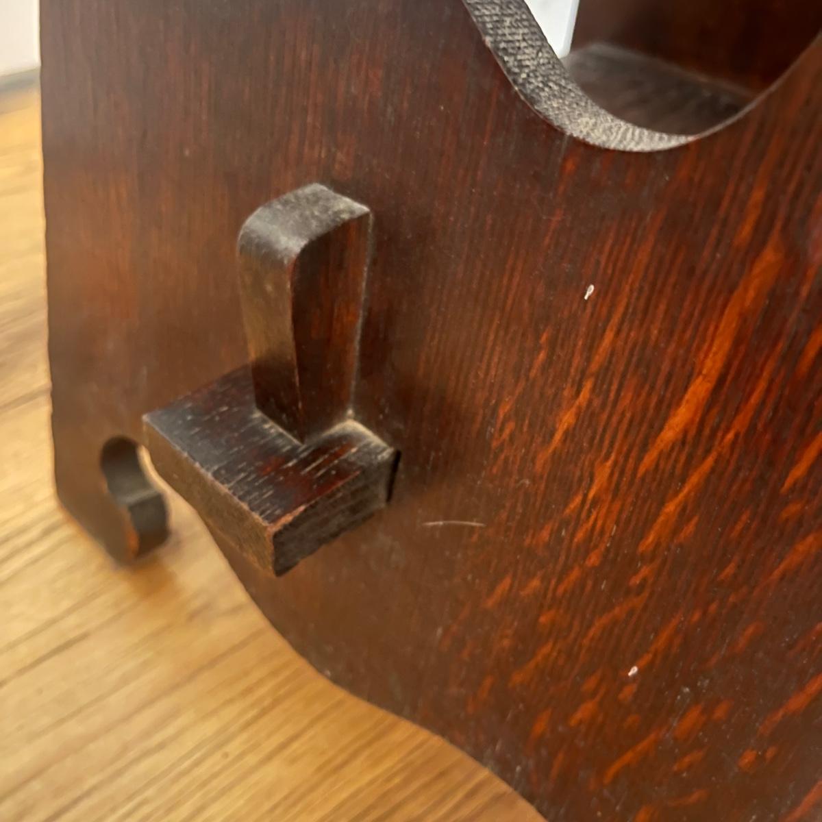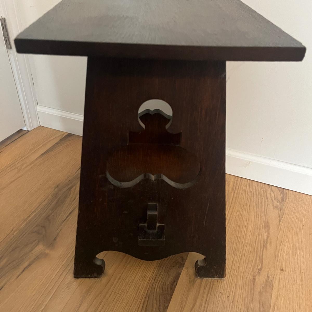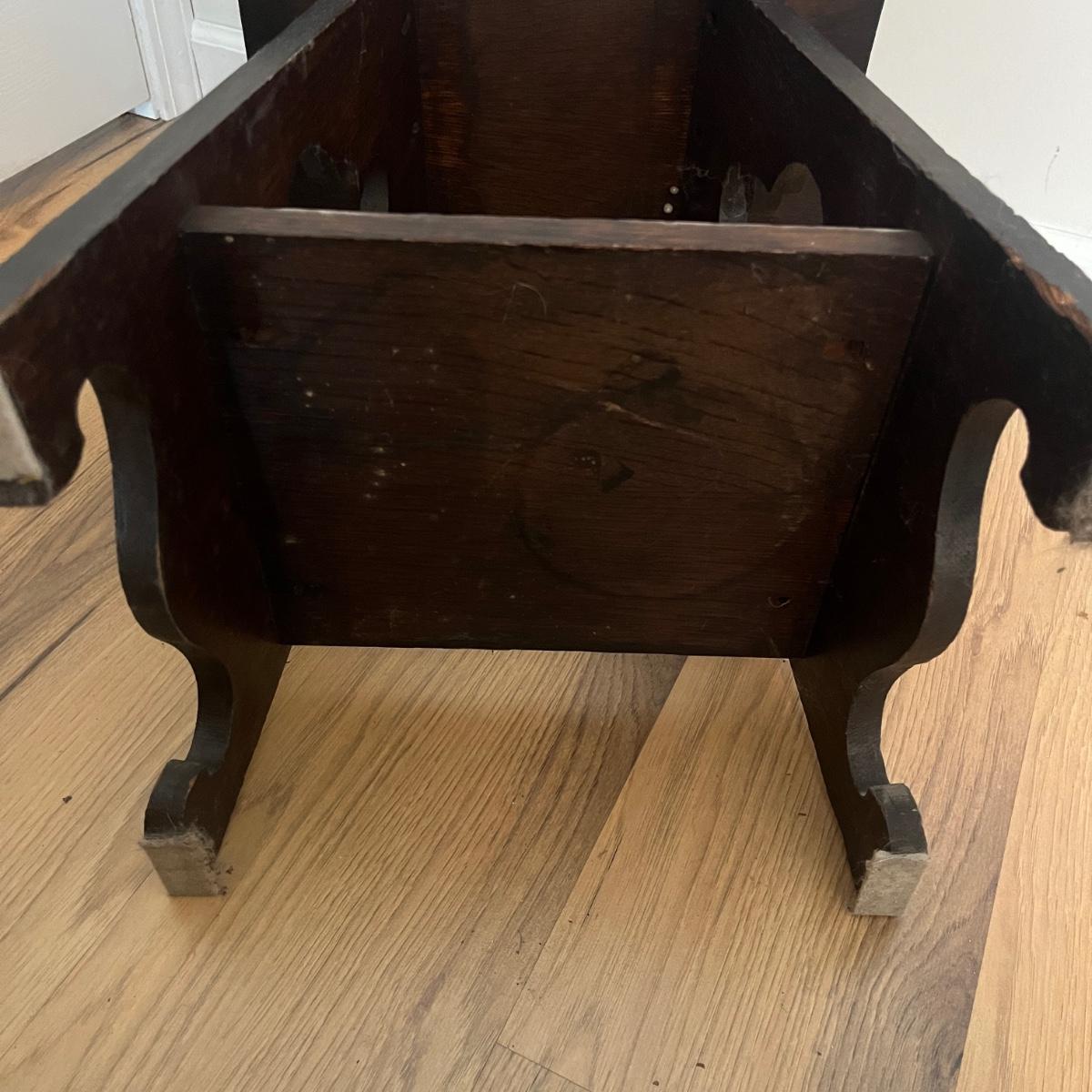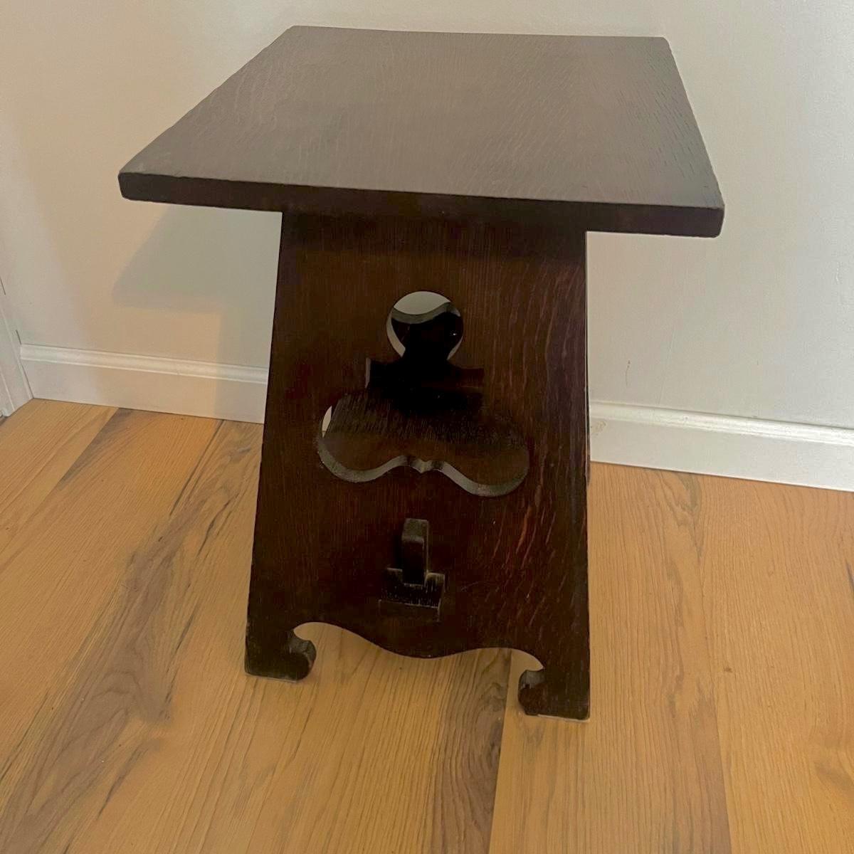 This wooden mission style table measures 14” x 16” x 20”H. Tables a few scratches and nicks, see pictures.